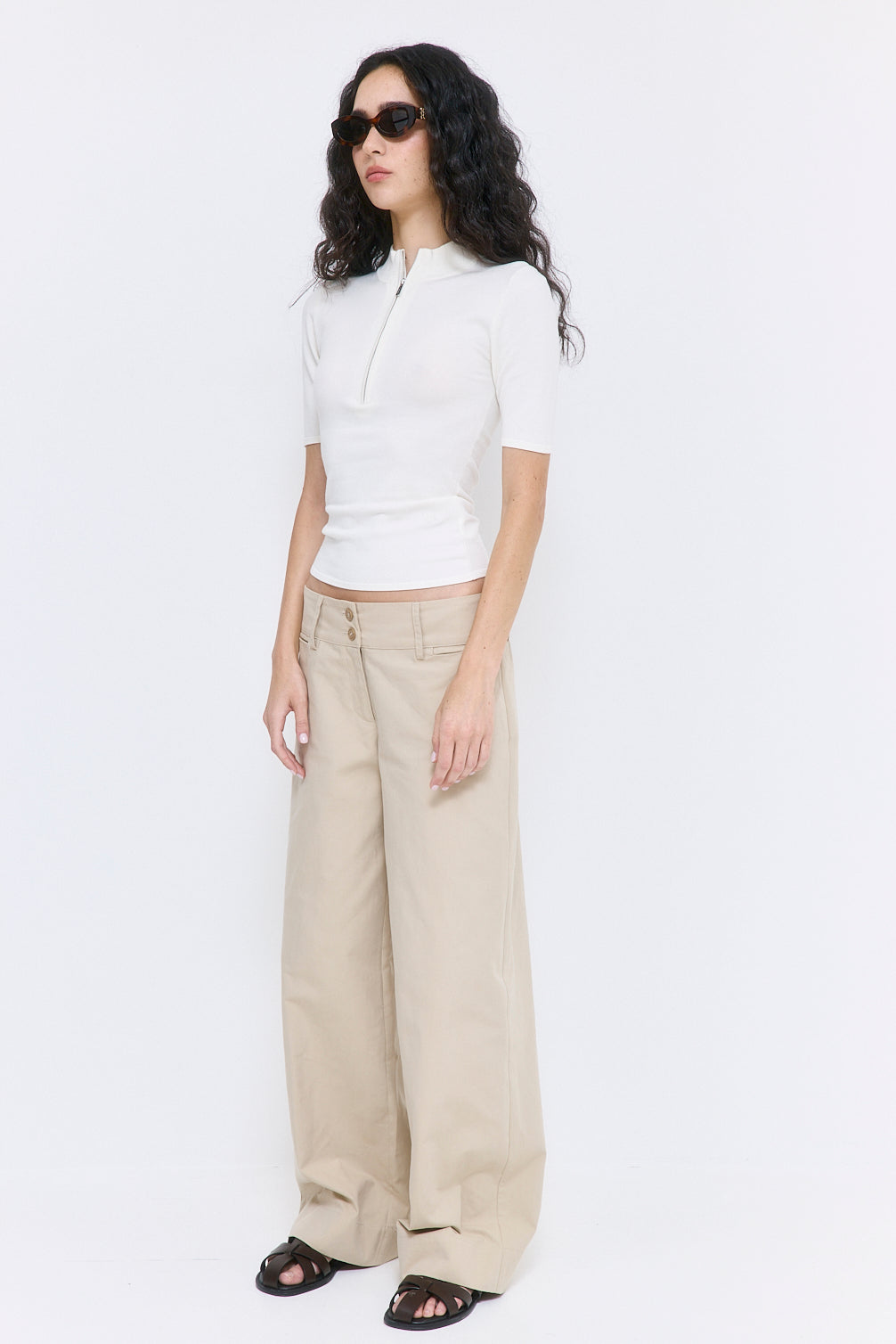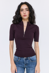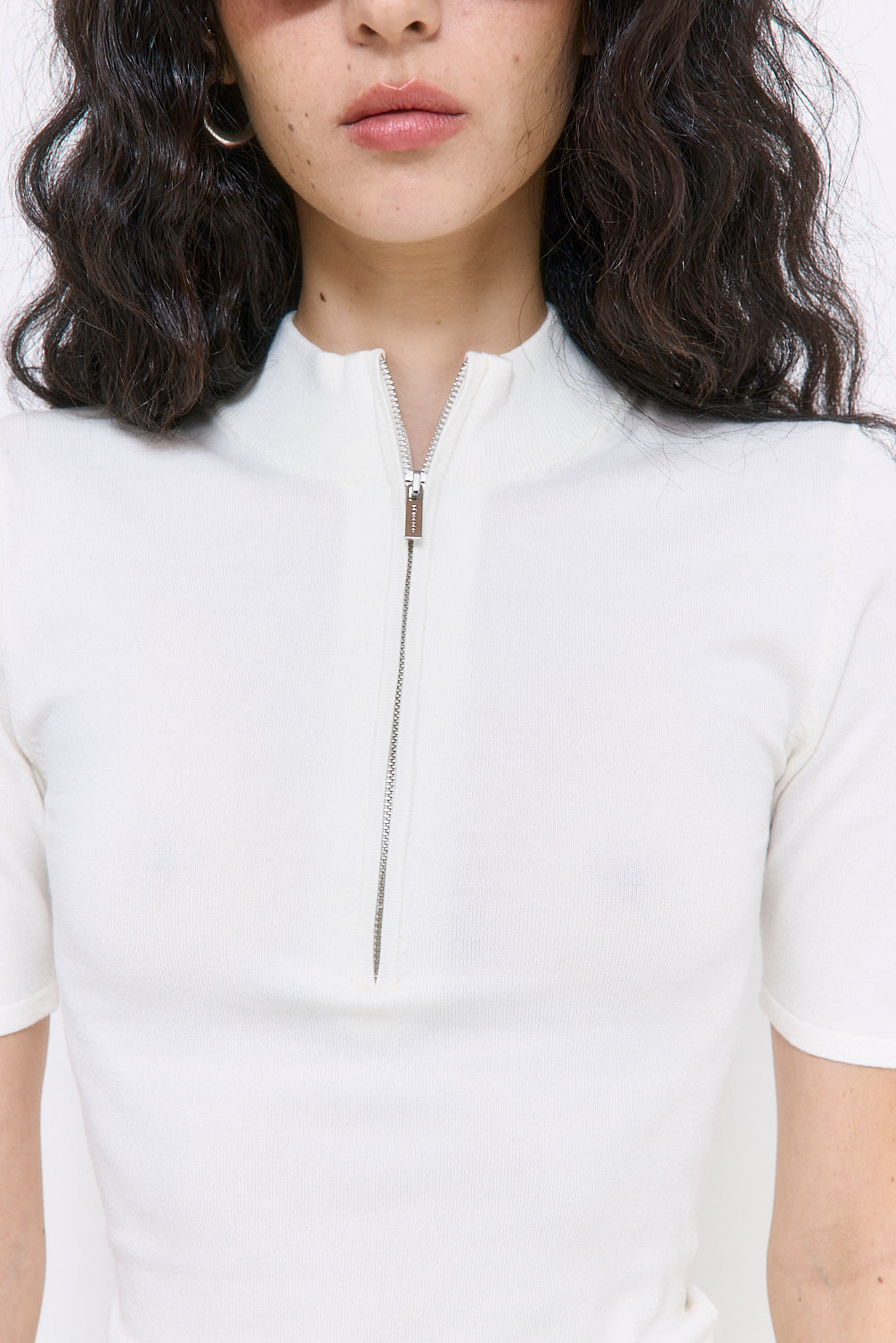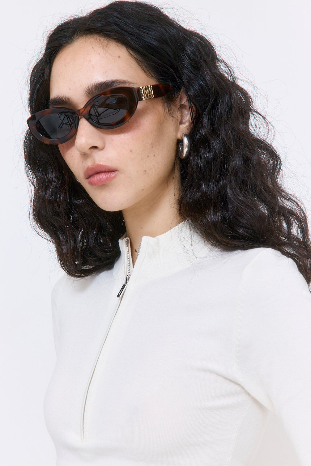 Get ready to fall in love with our new zipper knit. Mid sleeved. Soft body hugging fabric. Fitted silhouette. Tonal logo embroidered on the side. Branded metallic half way front zipper. Clean finish. Delicate ribbed collar. Syle it woth our perfect pair of denim, oval sunglasses and our iconic Yvon shoulder bag.