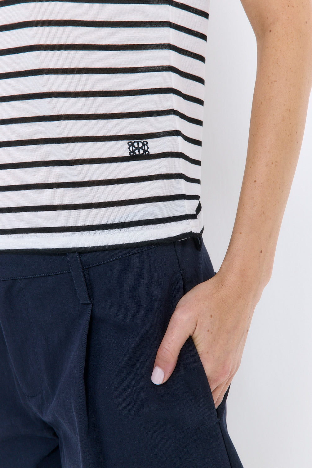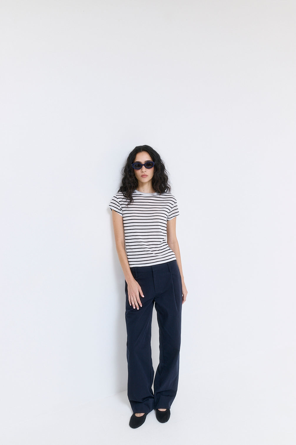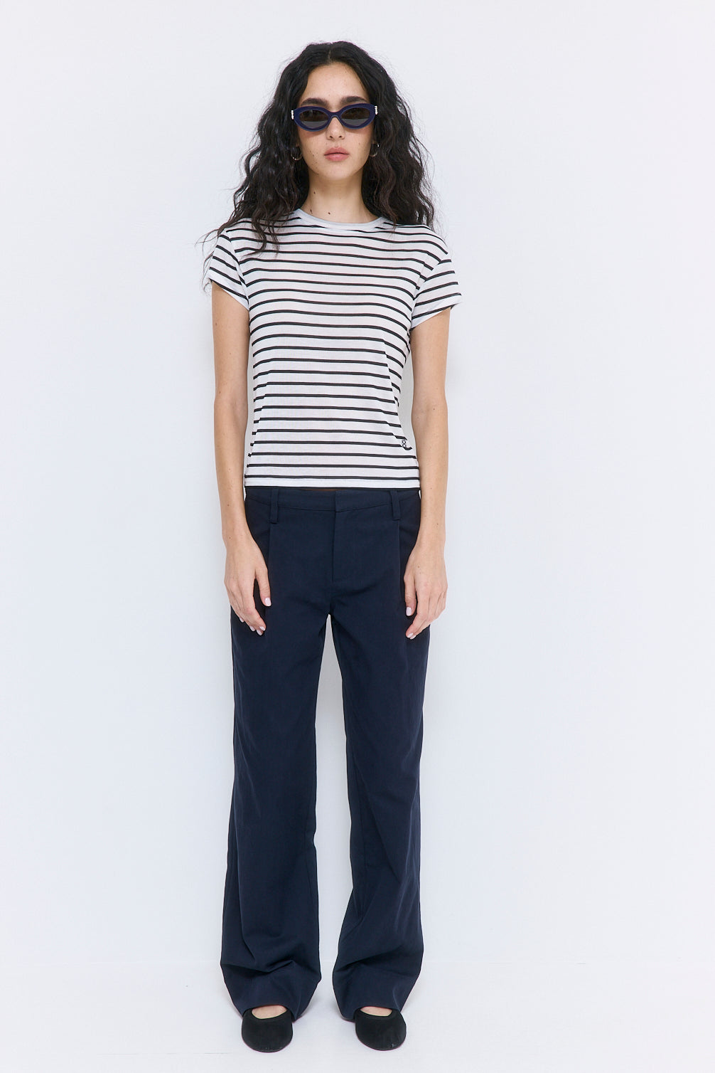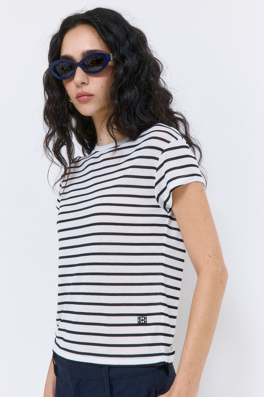 Our new striped tee is the perfect way to elevate your day to night looks. Crew neckline. Short angled cat sleeves. Loose silhouette. Embroidered logo on the front side. Style it with our perfect low rise cotton pleat pants, our chic scrunchie and finish the look with our timeless Rodika suede tote bag.