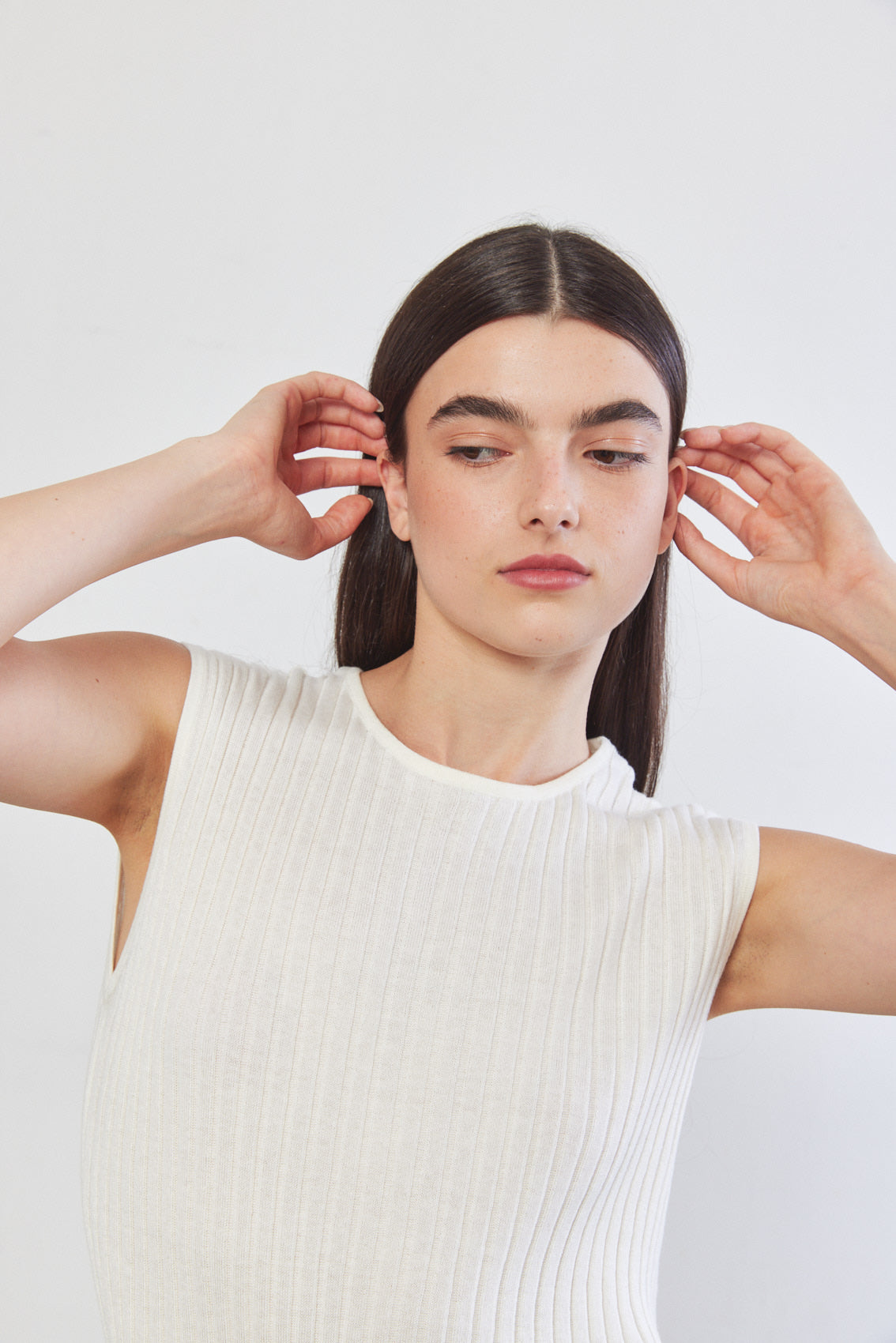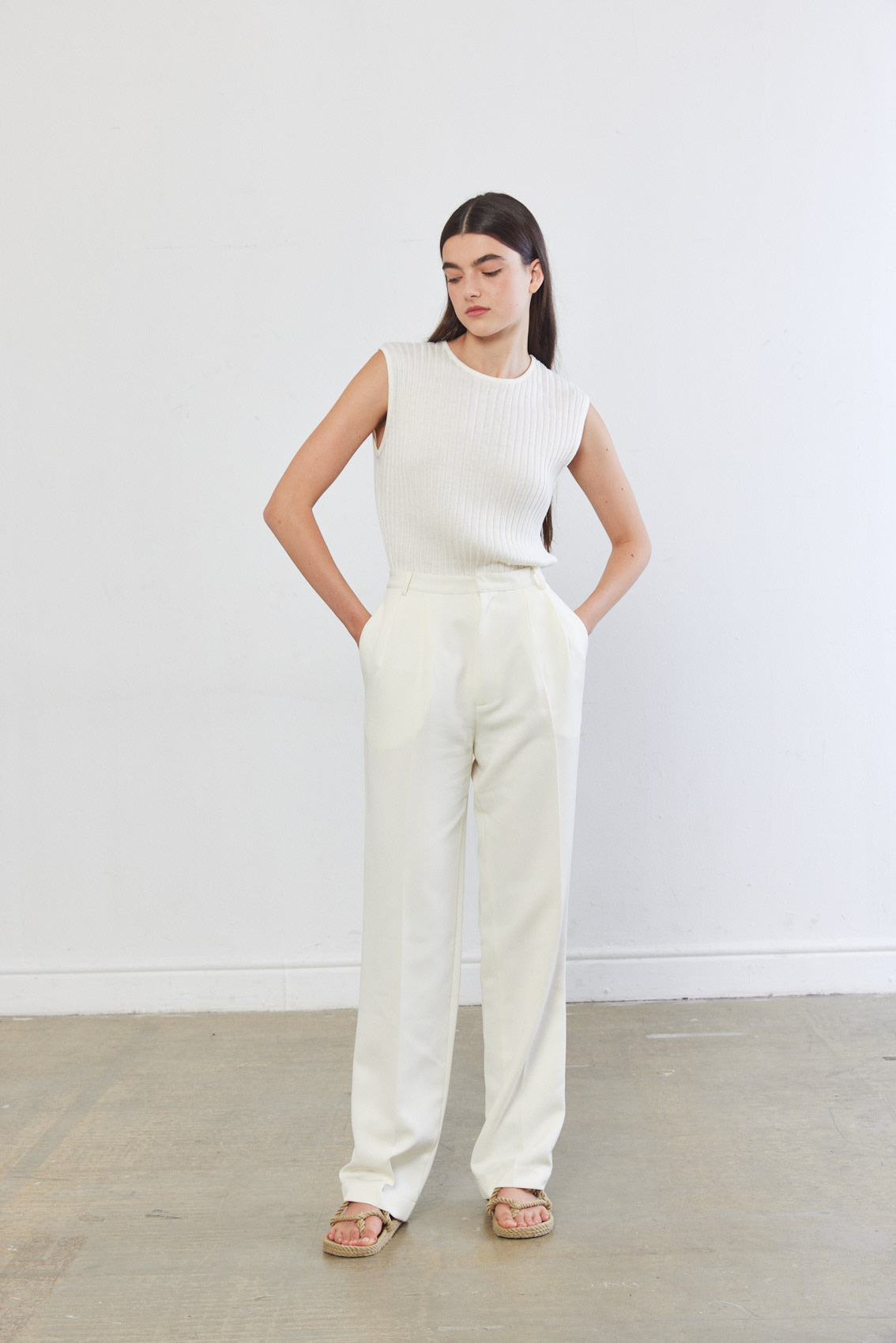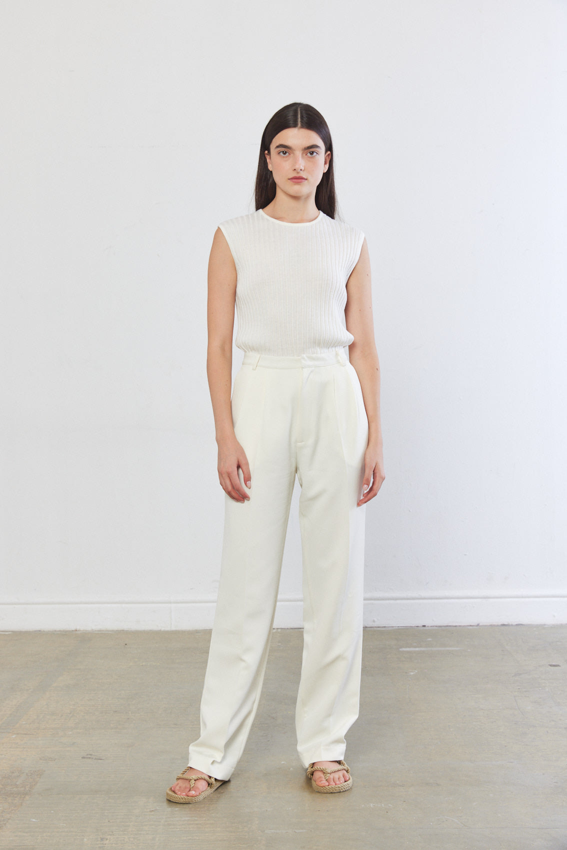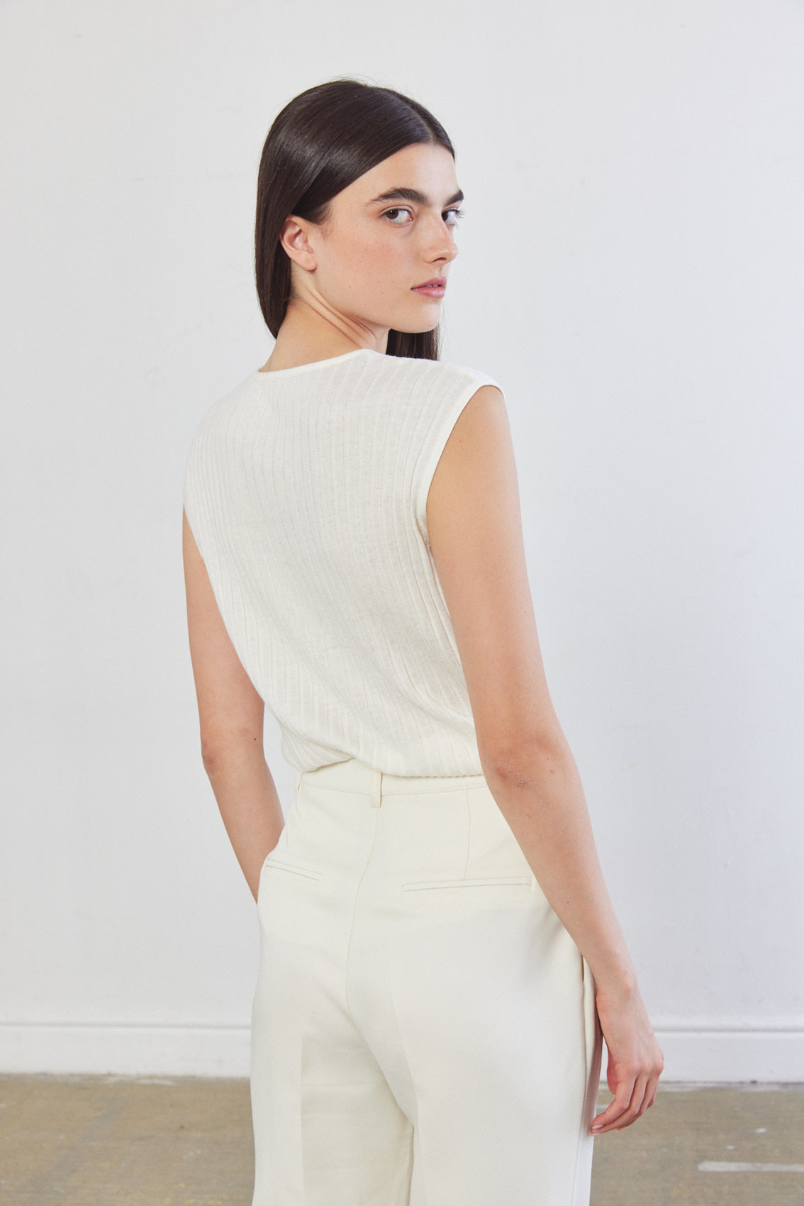 Sleeveless knitted top featuring a round neckline. Made from a ribbed textured woven fabric. Complete the look with a matching knitted pants tucked in high waisted trousers.