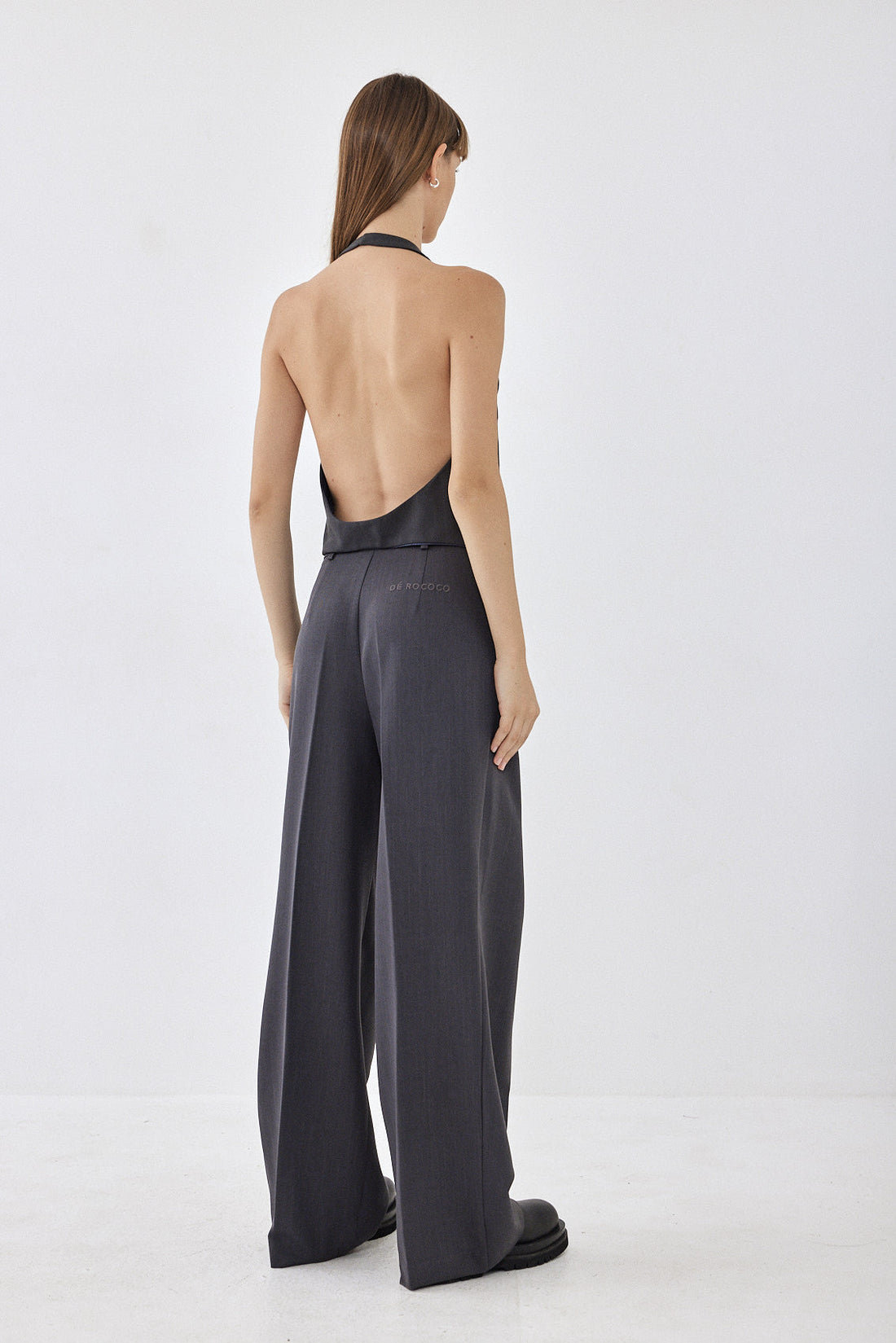 Halterneck style vest with an open back. Front button closure. Front welt pockets. Logo embroidery ton sur ton detail on one of the welt pockets. Style it with your favorite matching color daddy bottom for an effortlessly chic look perfect for day to night.