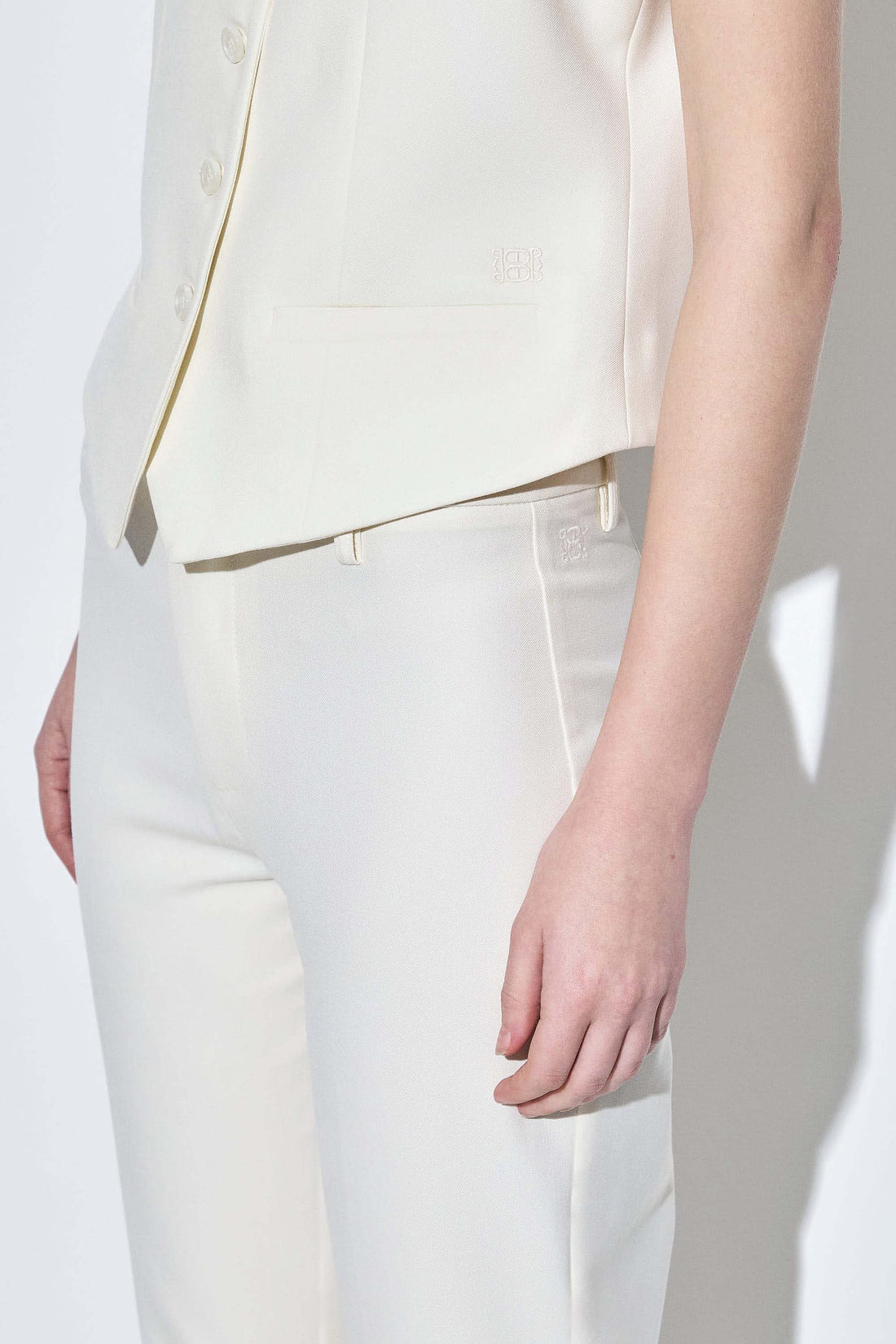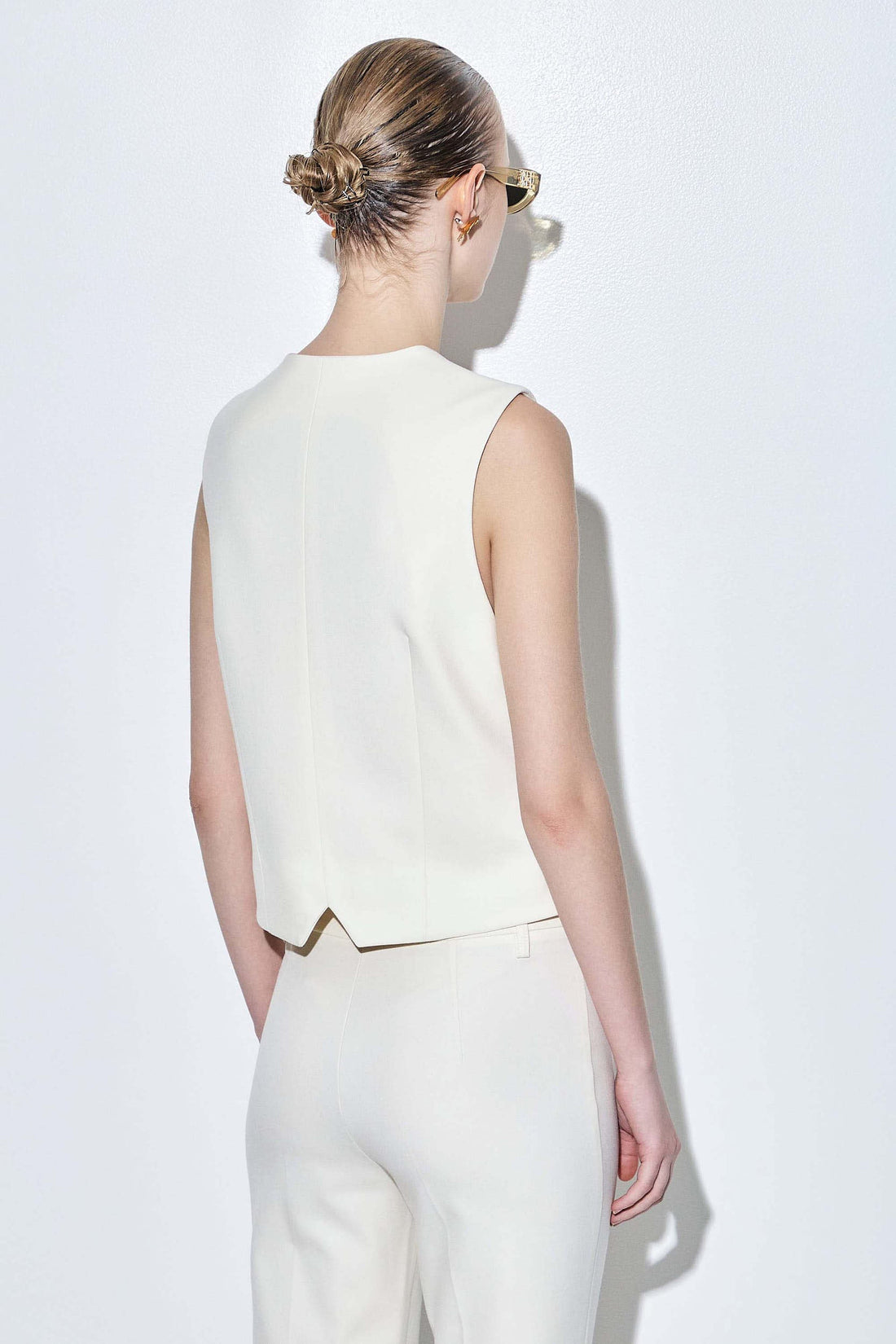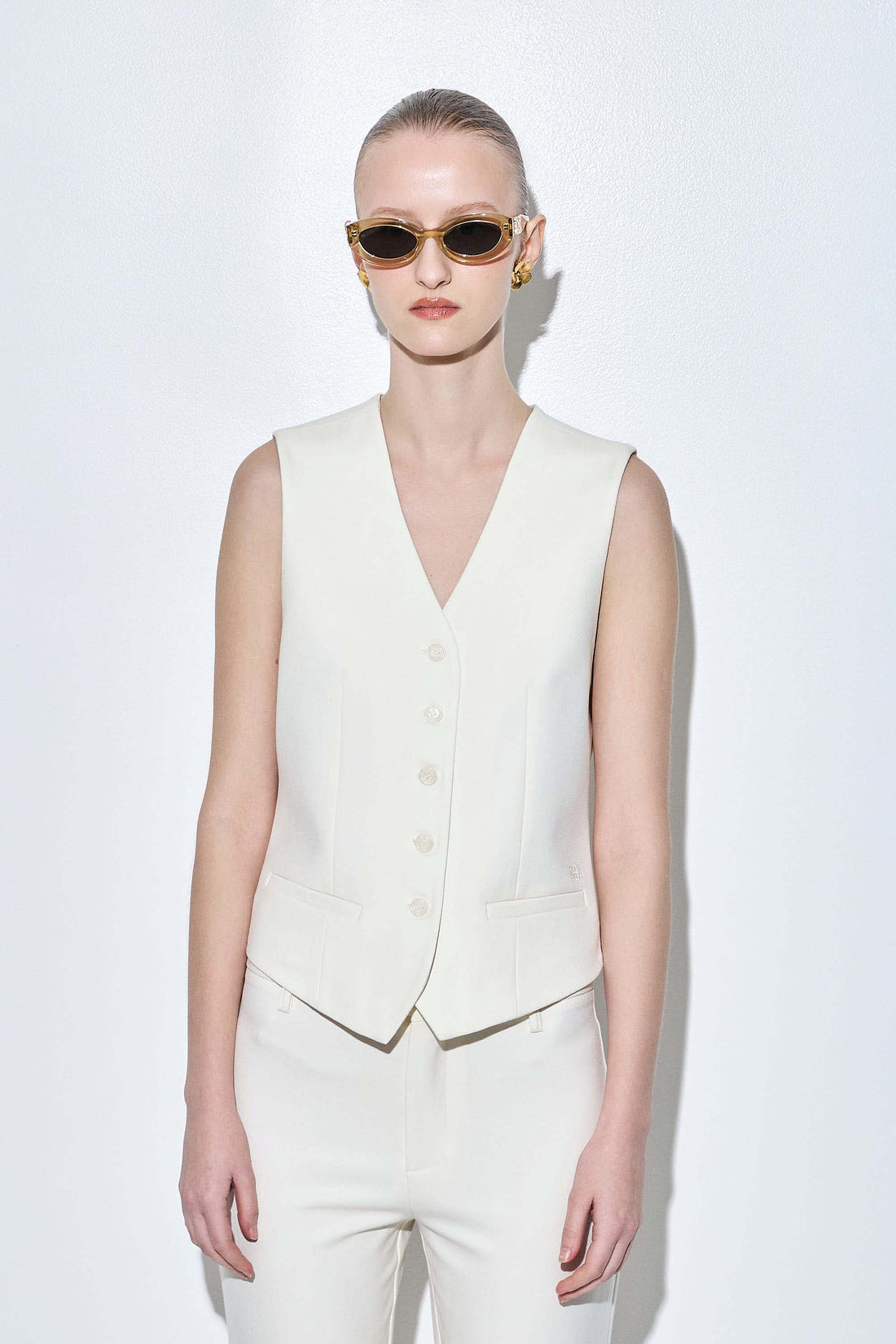 The chicest vest you'll own in a new luxurious tailored fabric. Fitted silhouette. Engraved logo frontal button closure. V neckline. Front faux welt pockets. Delicate tonal embroidered logo detailing on the front. Lined. Featuring dart detailing for a fitted silhouette. Style it with our tapered daddy pants, our classy monogram scarf and a pair of our beautiful oval sunglasses.