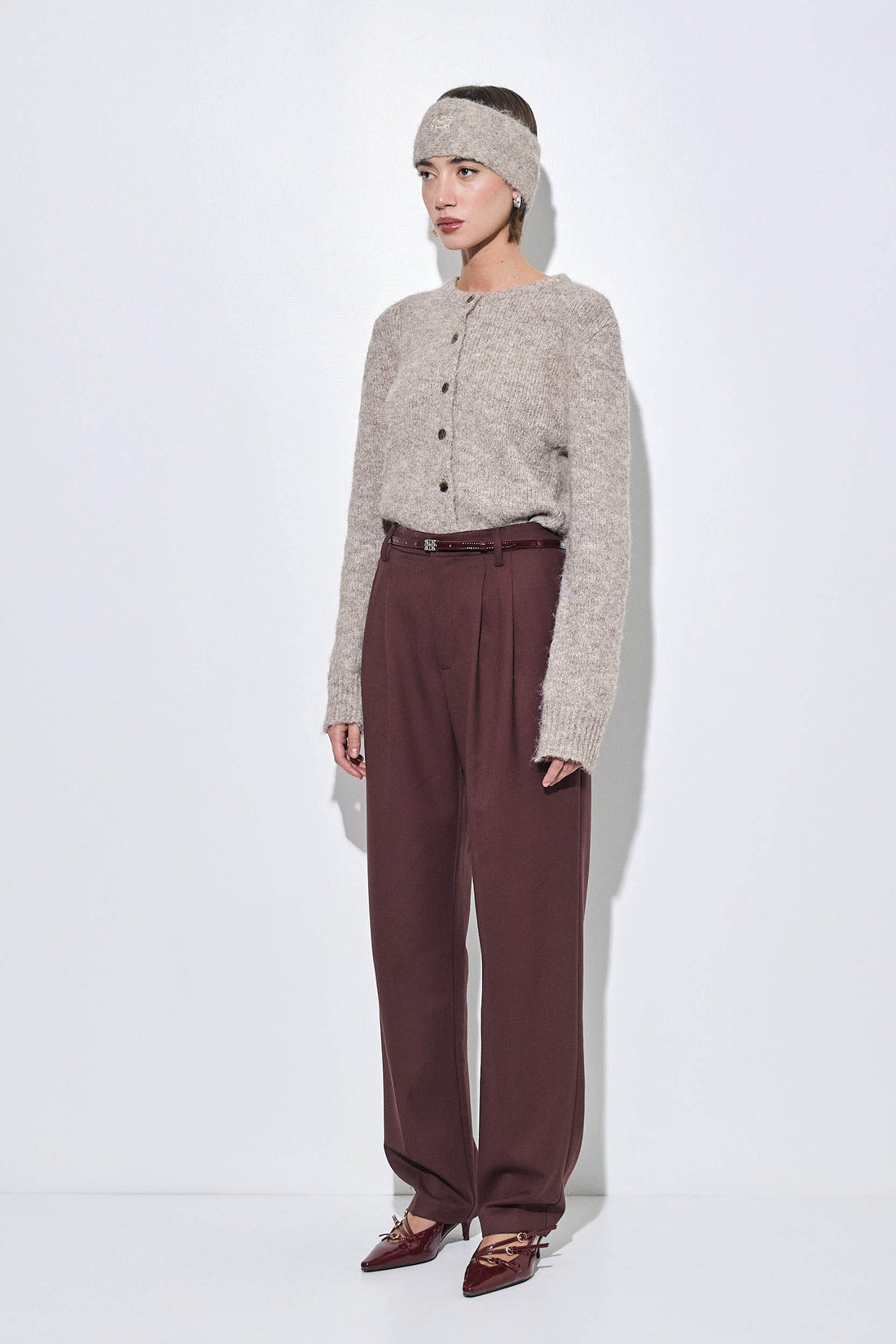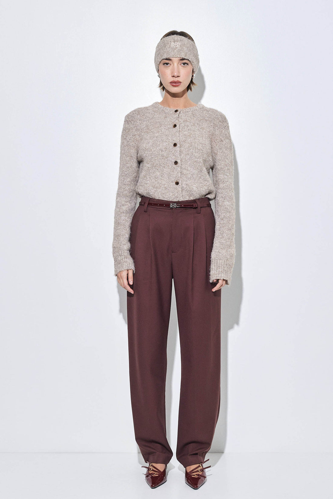 Classic and clean cut tapered daddy pants in a new luxurious tailored fabric. High waisted. Full length. Two side pockets. Tonal embroidered logo detailing at the back. Front zipper and metal hook closure. Unlined. Belt loops. Two front pleats. Style it with a lightweight turtleneck, our Croco belt and top it off with our oversized daddy blazer for the ultimate day to night look.