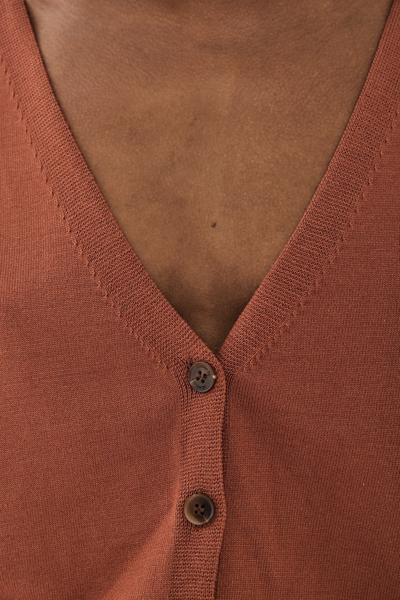 The perfect knit vest for spring. V neck silhouette. Ribbed finish with a slight cuff at the end. Embroidery logo detailing. Featuring a button closure. Delicate logo engraving on the buttons. Style it with your favorite matching bottom, delicate gold accessories and our Golden Aviator sunnies for a breezy and feminine spring look.