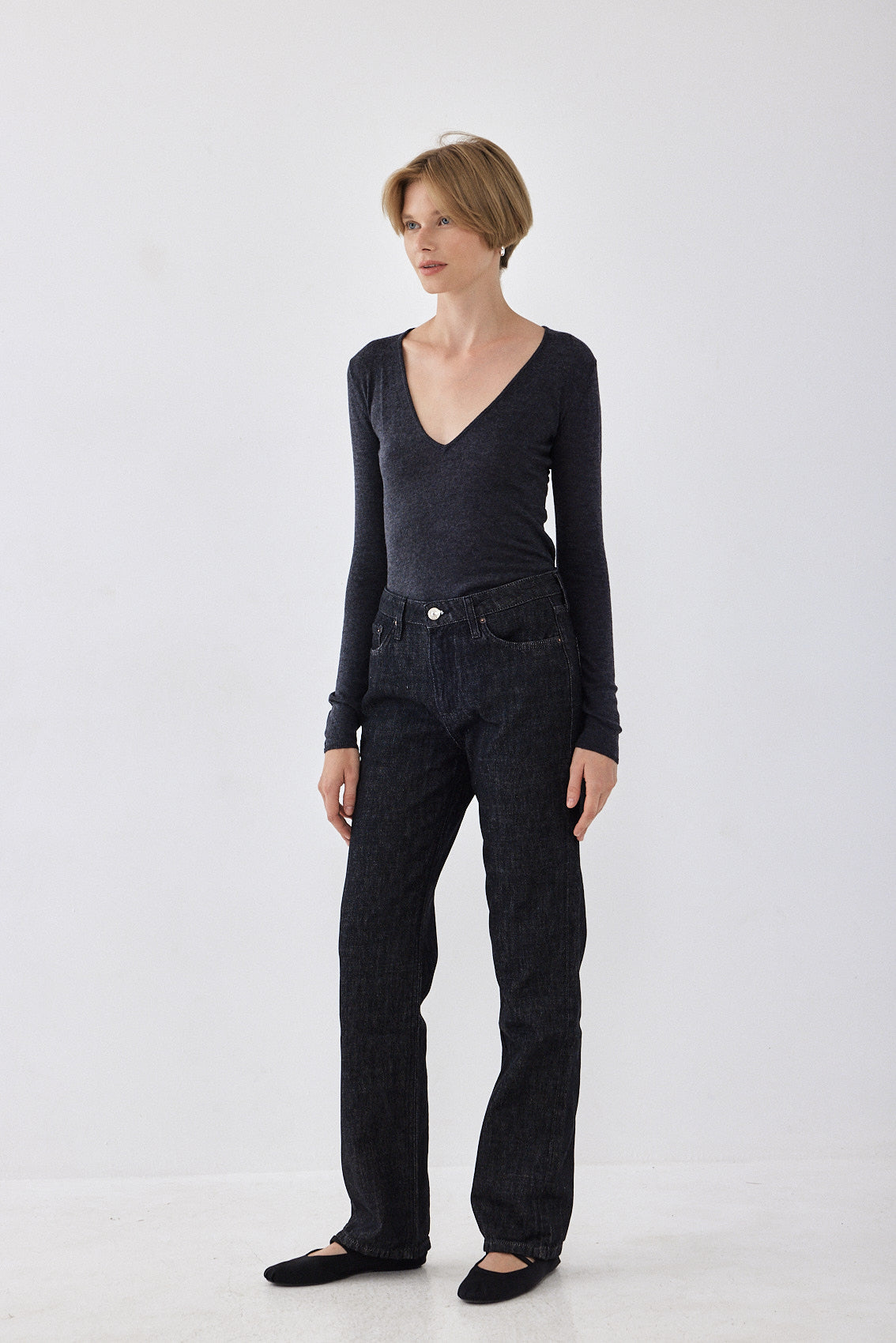The ultimate layering essential. A knitted long sleeved top featuring a v-neckline. Intersia logo on the back. Lightweight breathable material. Style it with your favorite daddy bottom, our signature belt and a pair of kitten heeled boots for the ultimate fall look.