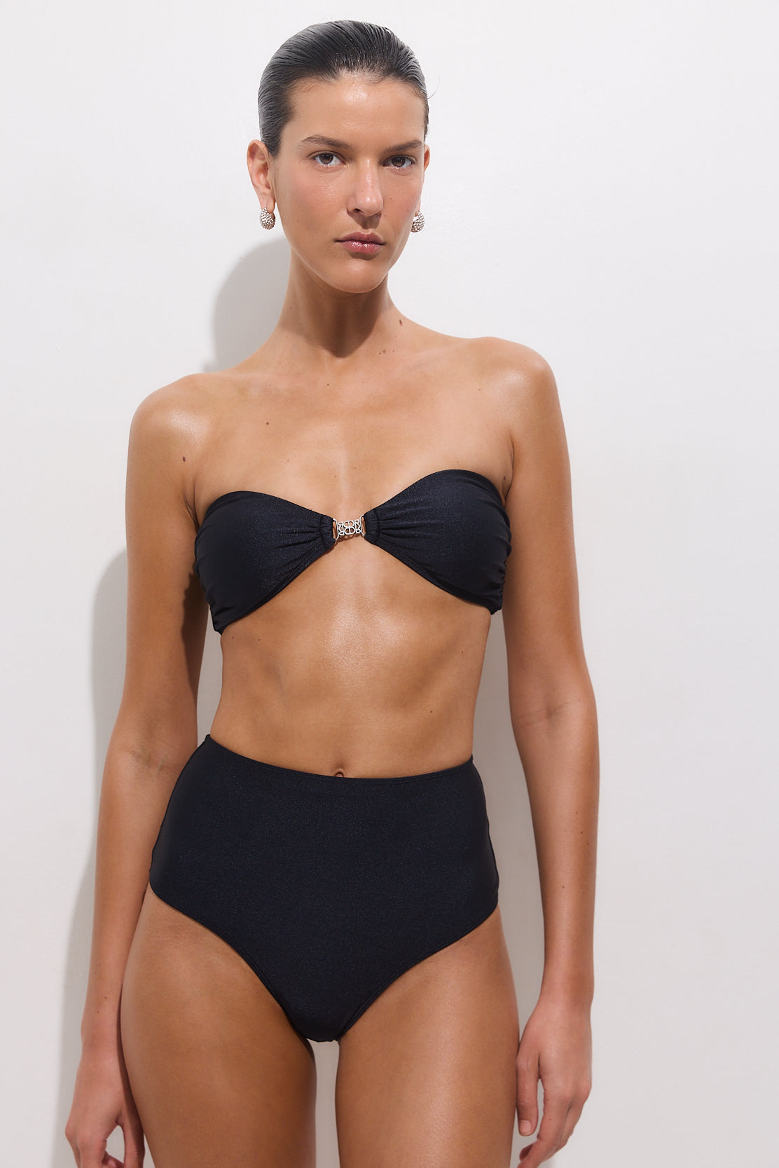 Re-introducing our best-selling swim icons from over the years in a new dreamy shade. A vintage-inspired, high waisted essential. Our Celio bottom was crafted especially for those classy and effortless summer days. Made from luxurious Italian shiny fabric that flatters and supports your shape with a sleek, second-skin fit. High waisted with a mid-rise leg opening. Lined. Features a silver logo press detail at the back. Style it with our beautiful Isabelle top, our stylish Striped Sarong and finish the look with our iconic Tanagra Scrunchie.