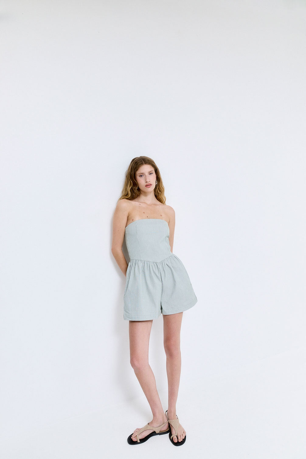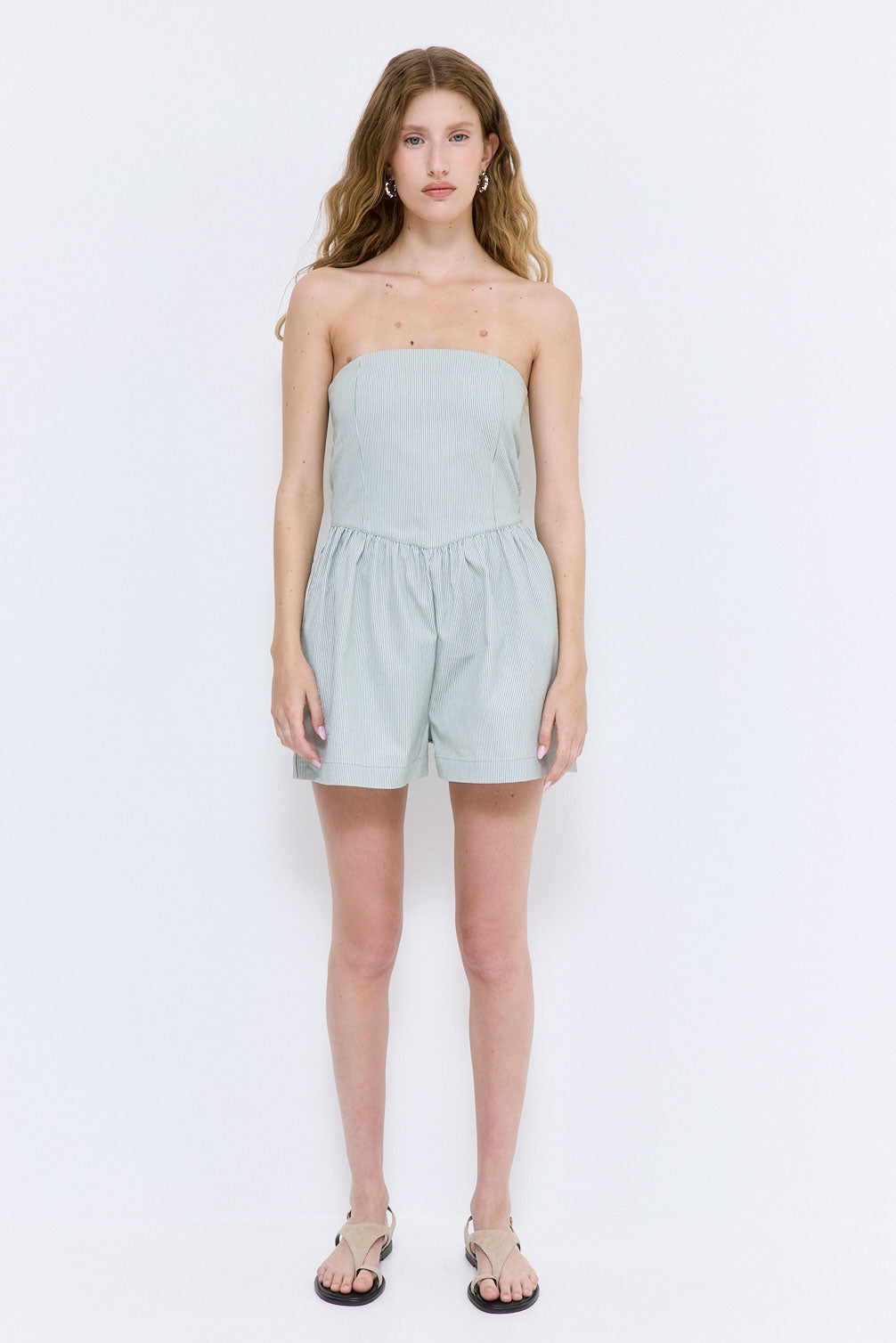 Our Strapless Striped Drill Jumpsuit: where polish meets play. Corset silhouette top. Internal silicon at the chest for extra grip. Pleated at the waist for added volume. Wide leg fit. Two side seam pockets. Tonal embroidered logo. Center-back zip closure. Style it with our crispy Fitted Poplin Button Down and stylish Round sunglasses for the ultimate summer's day.