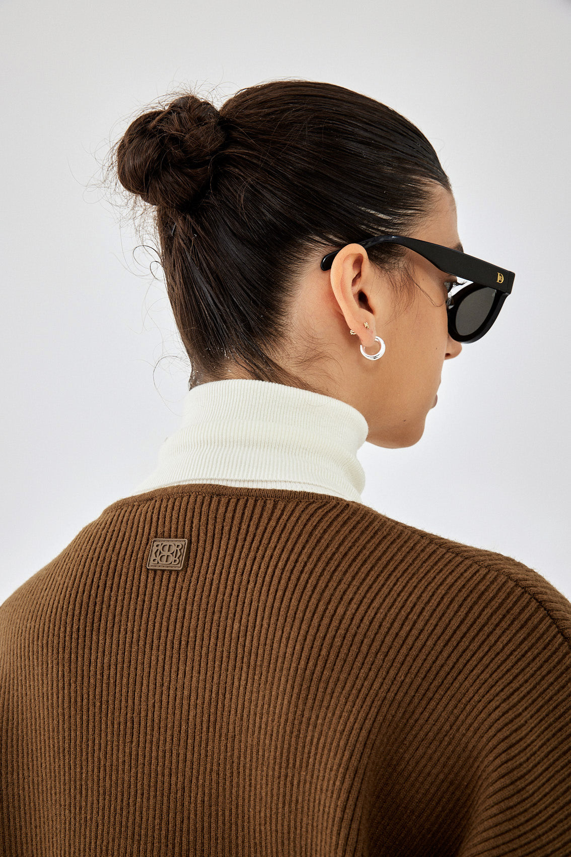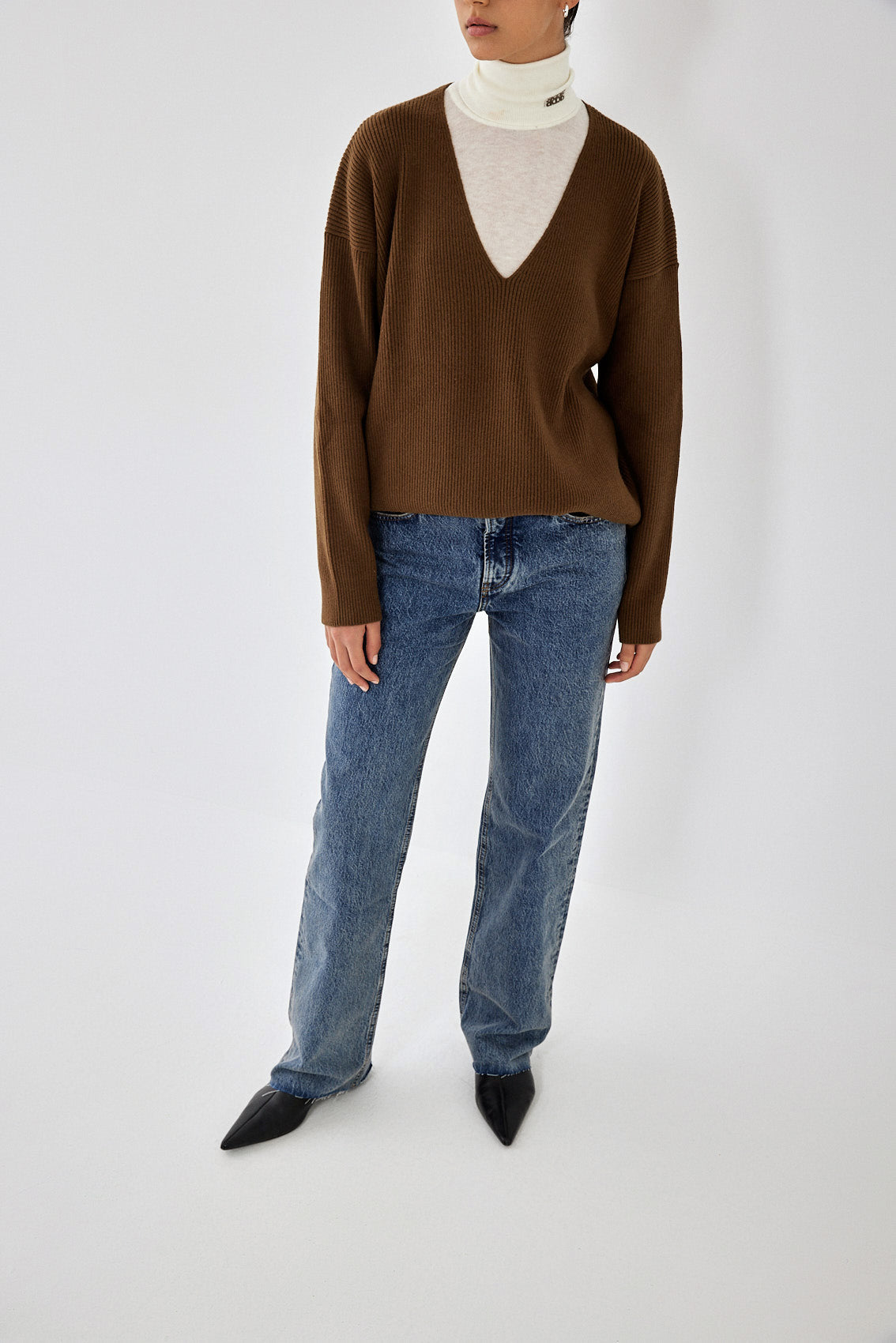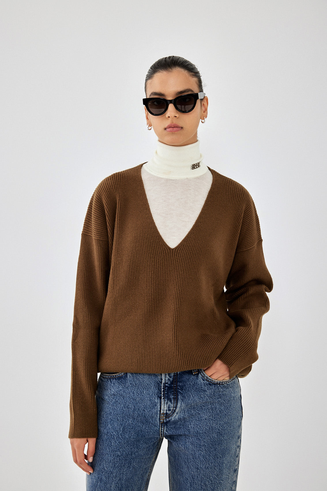 Fully fashion ribbed knitted deep V neck sweater. Premium knitwear made from the coziest material. Features drop shoulder sleeves. Full length sleeves. Tone on tone silicone logo detailing at the back. Dark olive color, greenish-brown. Style it with the matching bottom for the ultimate cozy set for winter that will keep you warm in style.
