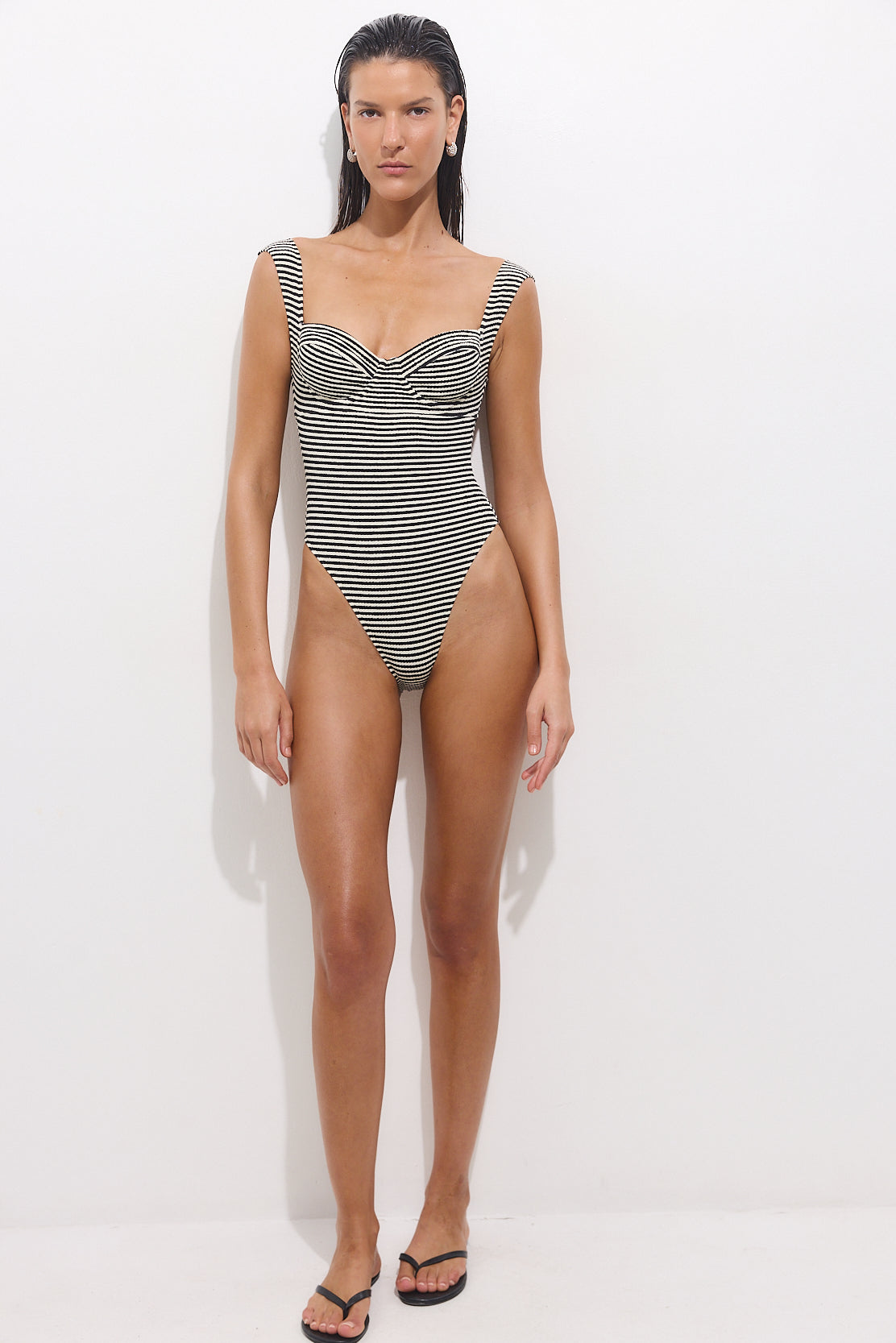 Re-introducing our best-selling swim icons from over the years in a new dreamy shade. The Joséphine balcon one-piece swimsuit is effortlessly chic, designed to flatter with a refined, feminine silhouette. Made from luxurious French ribbed fabric that hugs the body for a sleek, contoured fit. Lingerie style. Lined one piece with wide straps, with a slightly off-shoulder fit. Detailed with a silver logo press at the back. Underwire support and preparation for cup inserts (no cups provided). High cut leg. Can double as a bodysuit, pairing beautifully with any pants or skirt. Style it with our Semi Sheer Pleated Midi Skirt and pair those with our Signature Paisley Scarf for a relaxed yet sophisticated look.