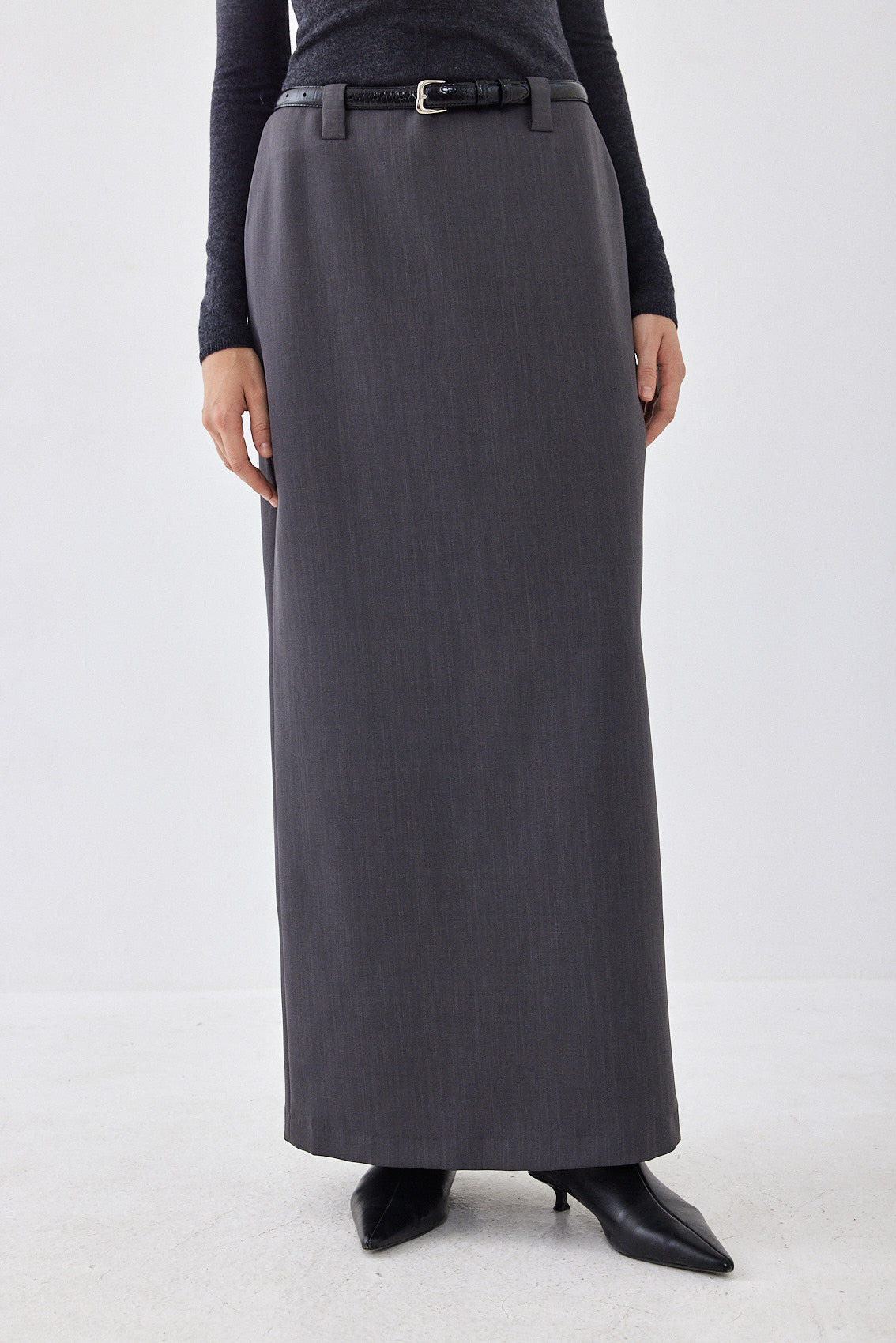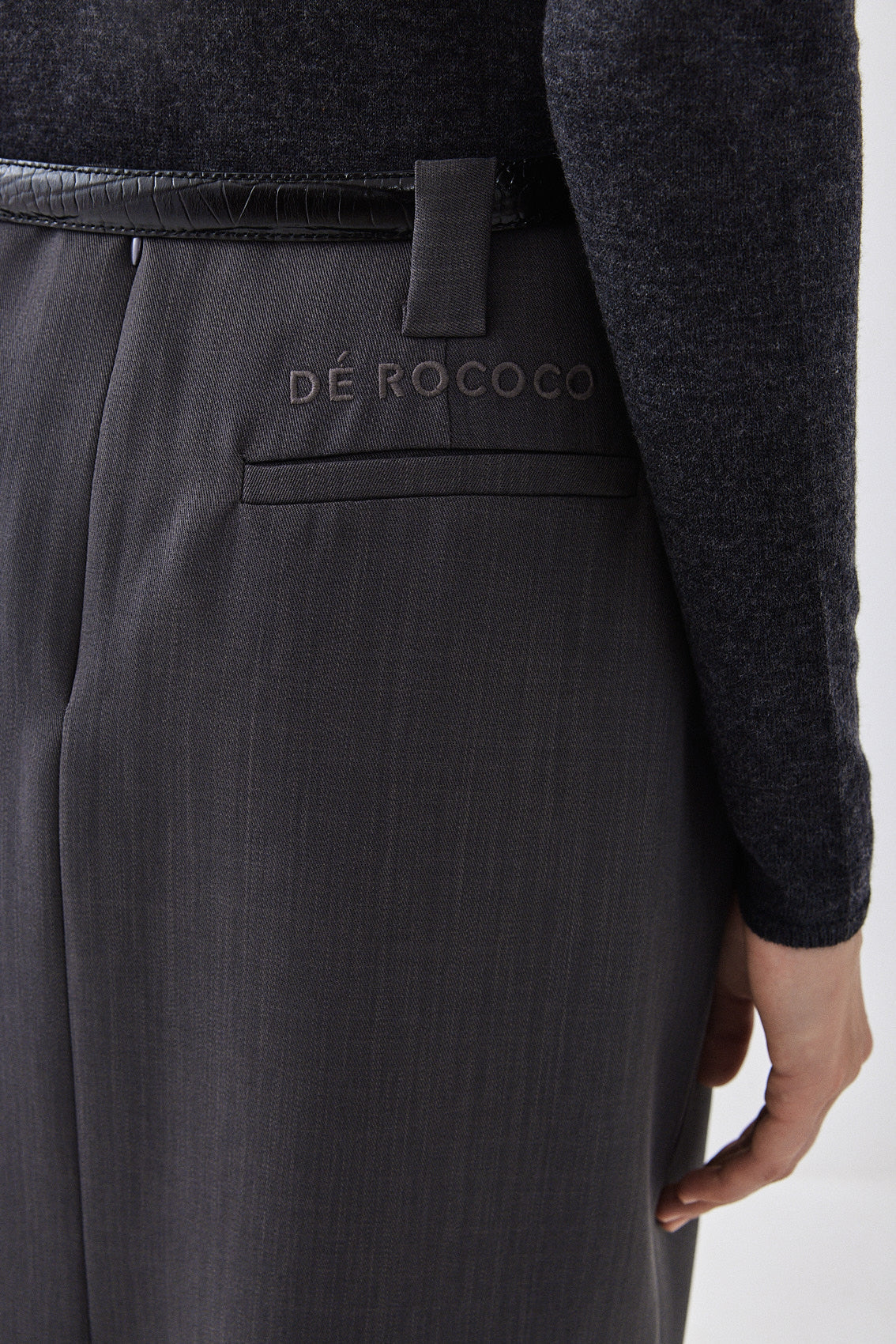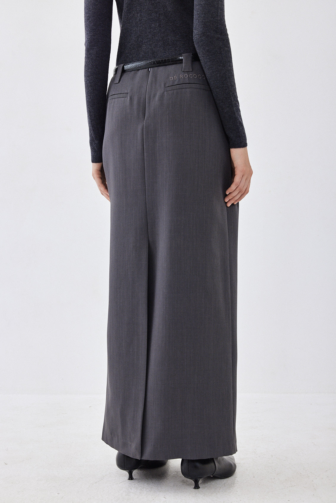 Maxi skirt with a delicate A-line silhouette, a brand new addition to the signature daddy collection. Featuring thick belt loops. Zipper closure at the back. Dé Rococo ton sur ton embroidery at the back. Two faux pockets at the back. Slit at the back. Style it with a matching color top and top it off with the cropped daddy blazer for the perfect day to night look.