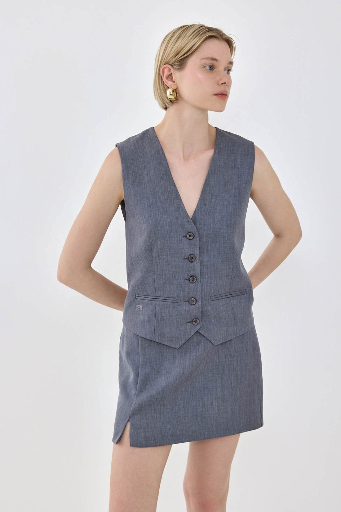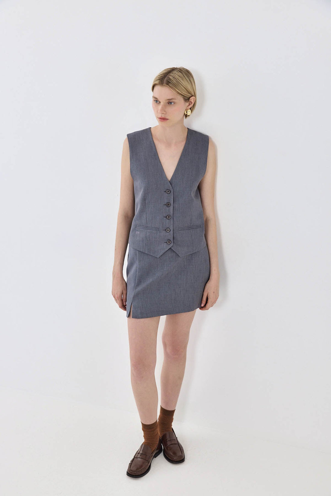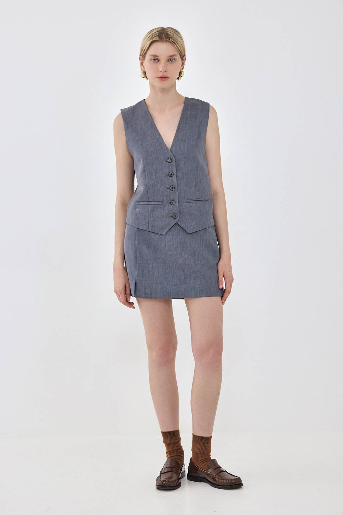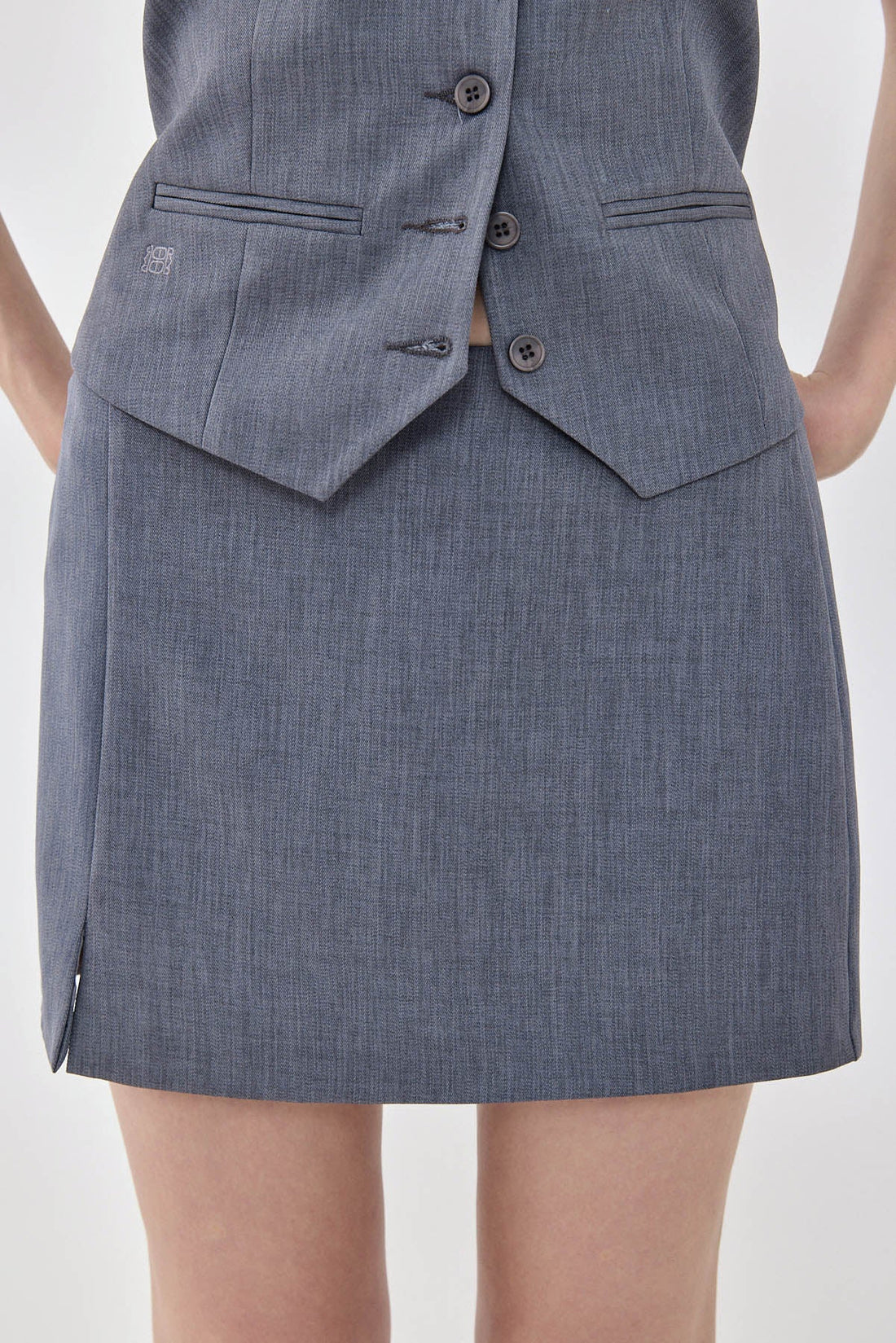 A line cut mini skirt from our signature daddy collection. Featuring a delicate slit on the front. Zipper closing at the back. Your new favorite skirt, one you'll never want to take off. Style it with the matching fitted daddy vest, your favorite pair of loafers paired with our cozy socks for the perfect day to night look.