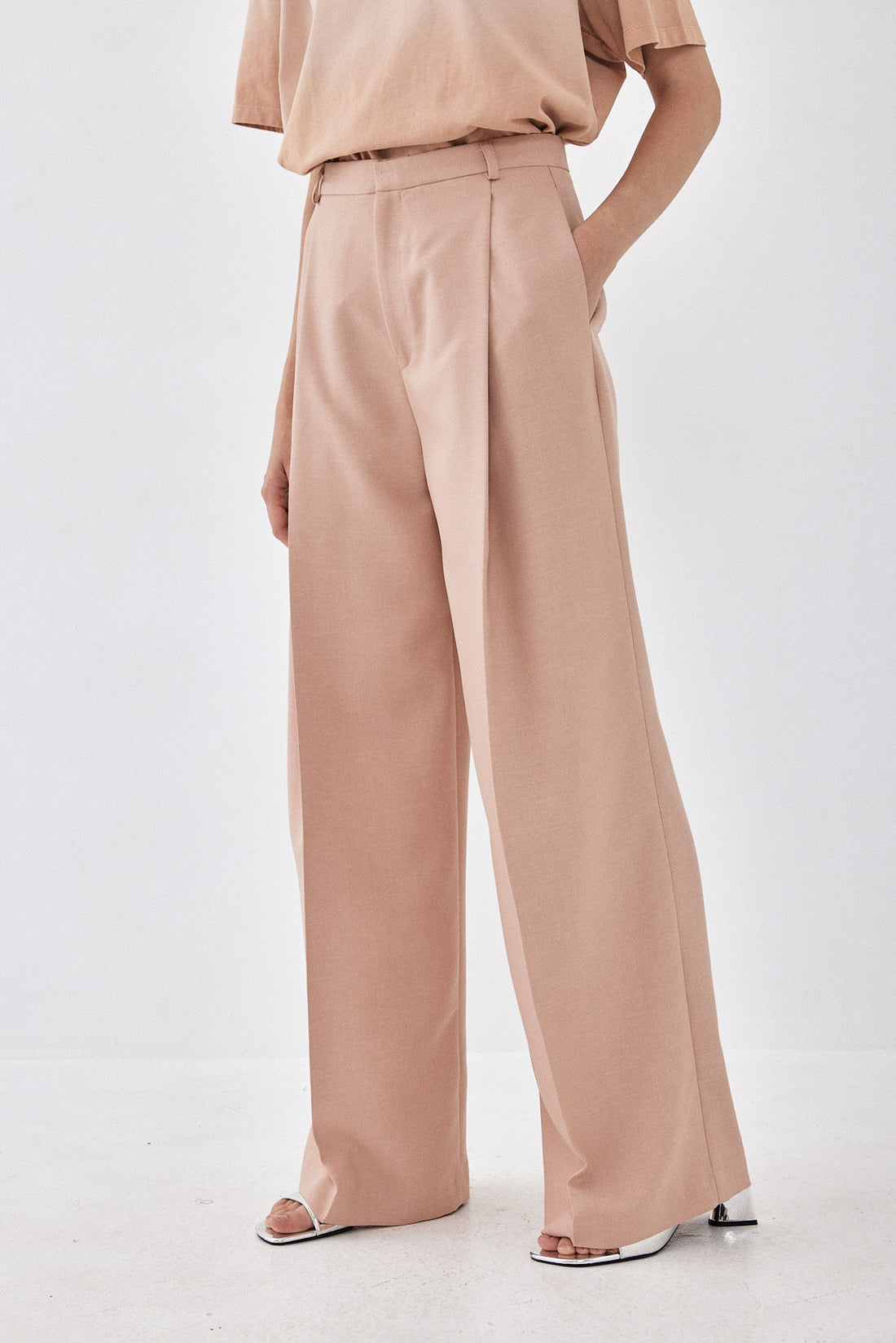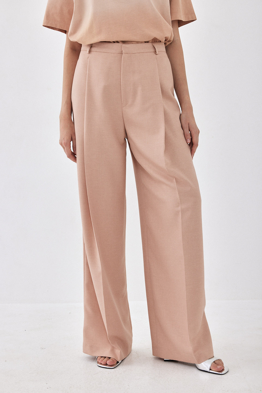 High waisted tailored pants with an extra wide silhouette. Non-stretch lightweight woven fabric. Featuring belt loops. Front zip and metal hook closure. Style it with your favorite basic tee and a pair of sandals for an ultra-chic everyday look.