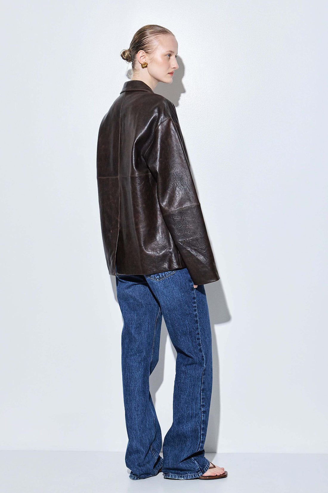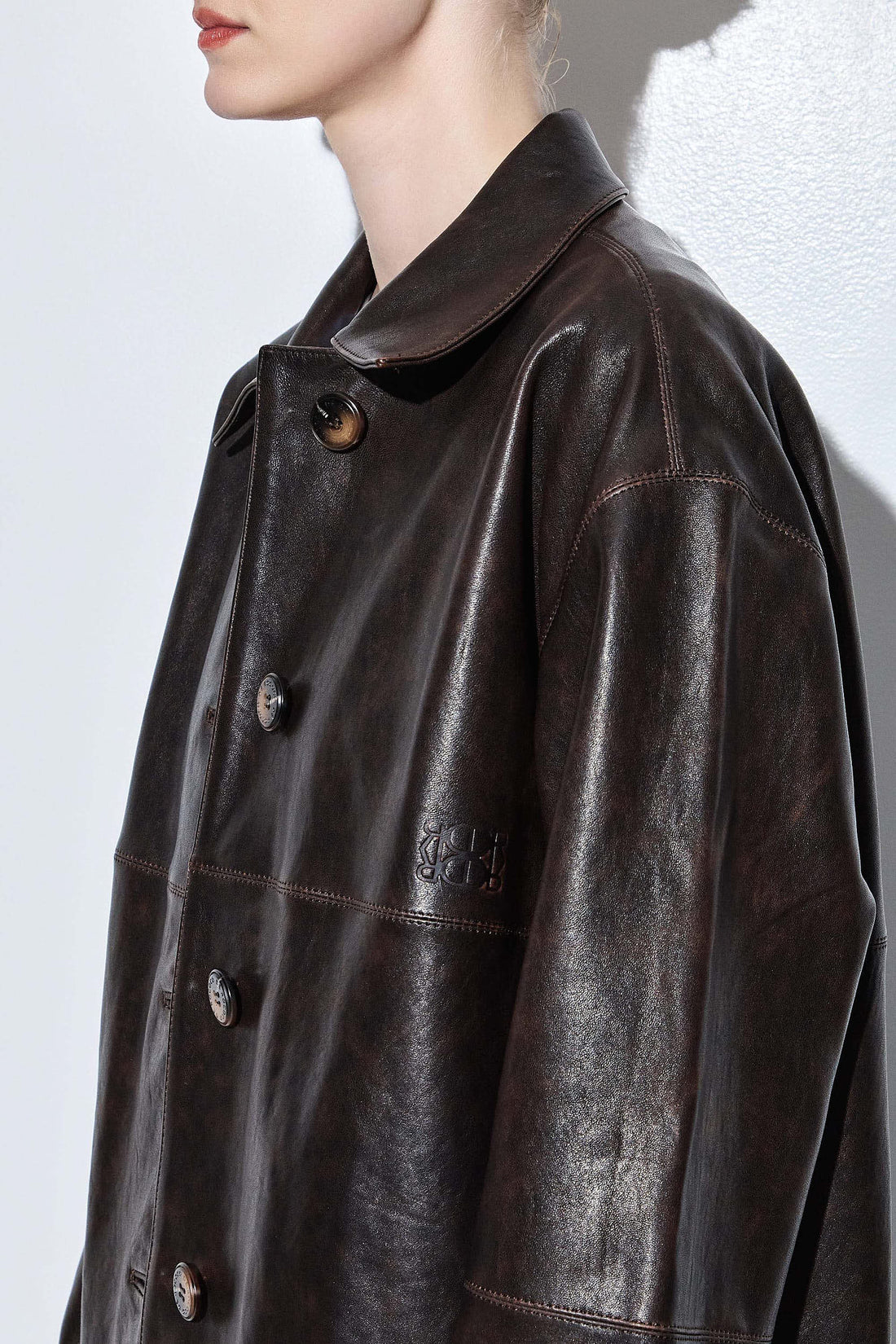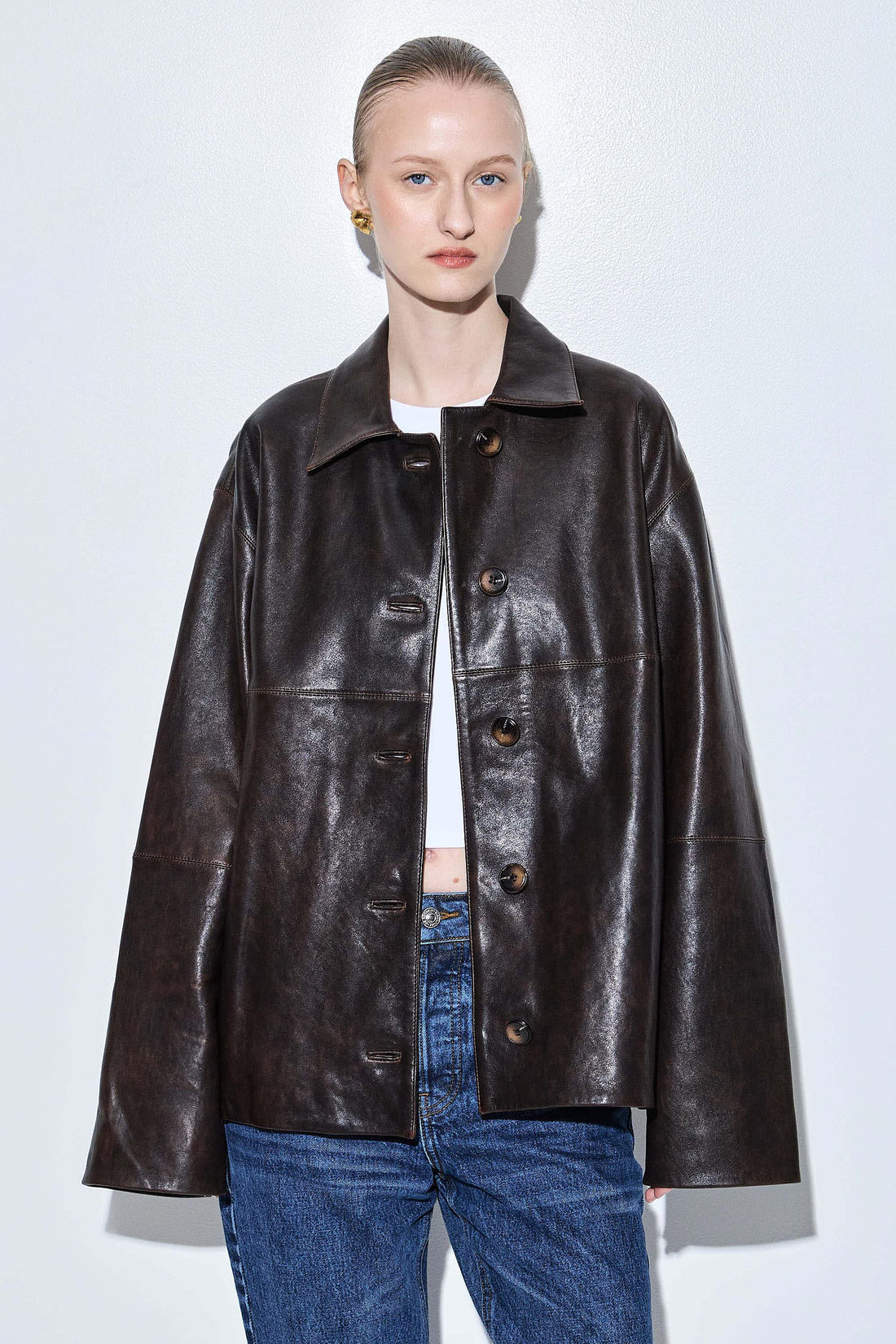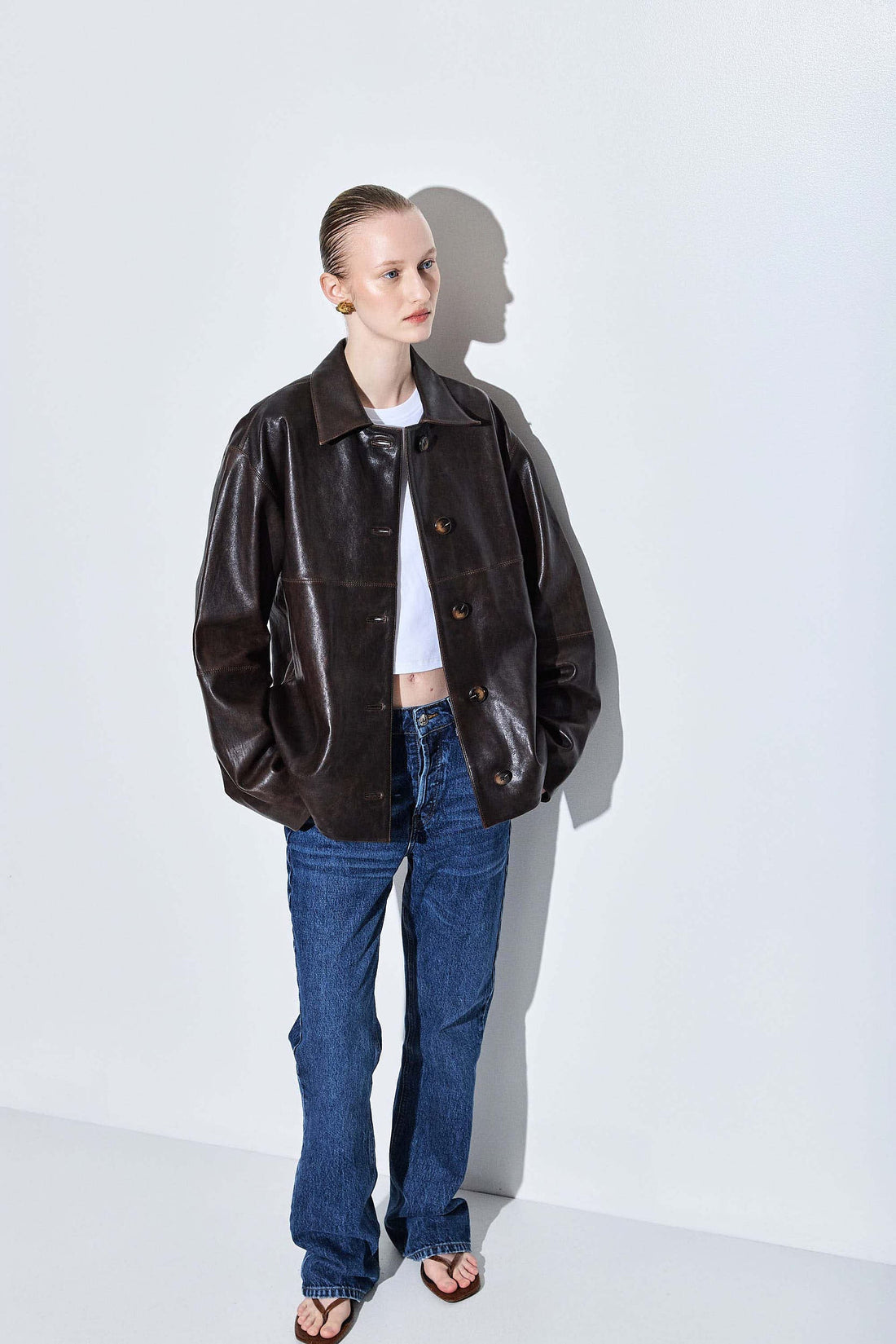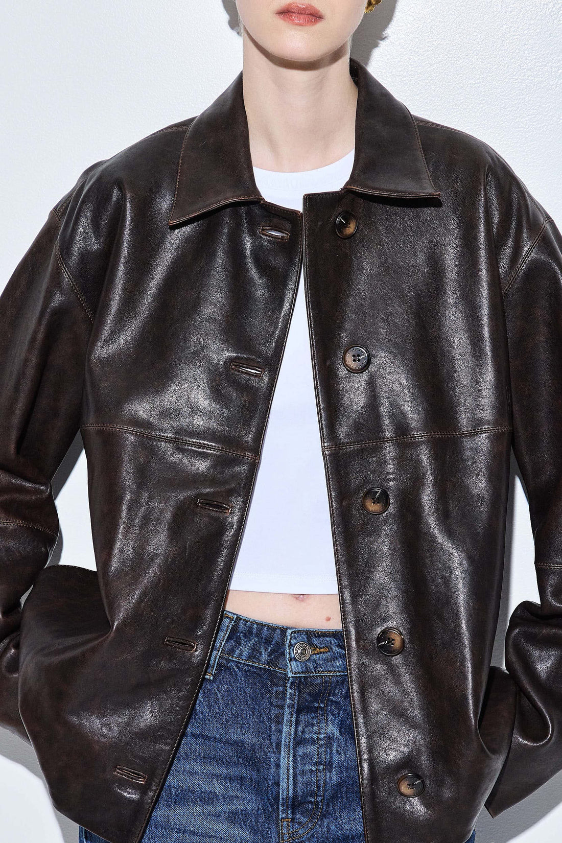 One of a kind leather jacket that is designed to last forever. Vintage-inspired finish. Logo engraved tortoise buttoned down closure. Lined. Classic lapel collar. Features high-quality stitching for durability and refined detailing. Oversized fit. Smooth buttery feel. Each piece is one of a kind, made from 100% genuine leather with unique textures and tones. With time, its natural wear enhances its look, making it uniquely yours. Style it with our fuzzy off shoulder sweater, our signature monogram scarf and a pair of our beautiful denim for a day to night look. Invest once, wear a lifetime.