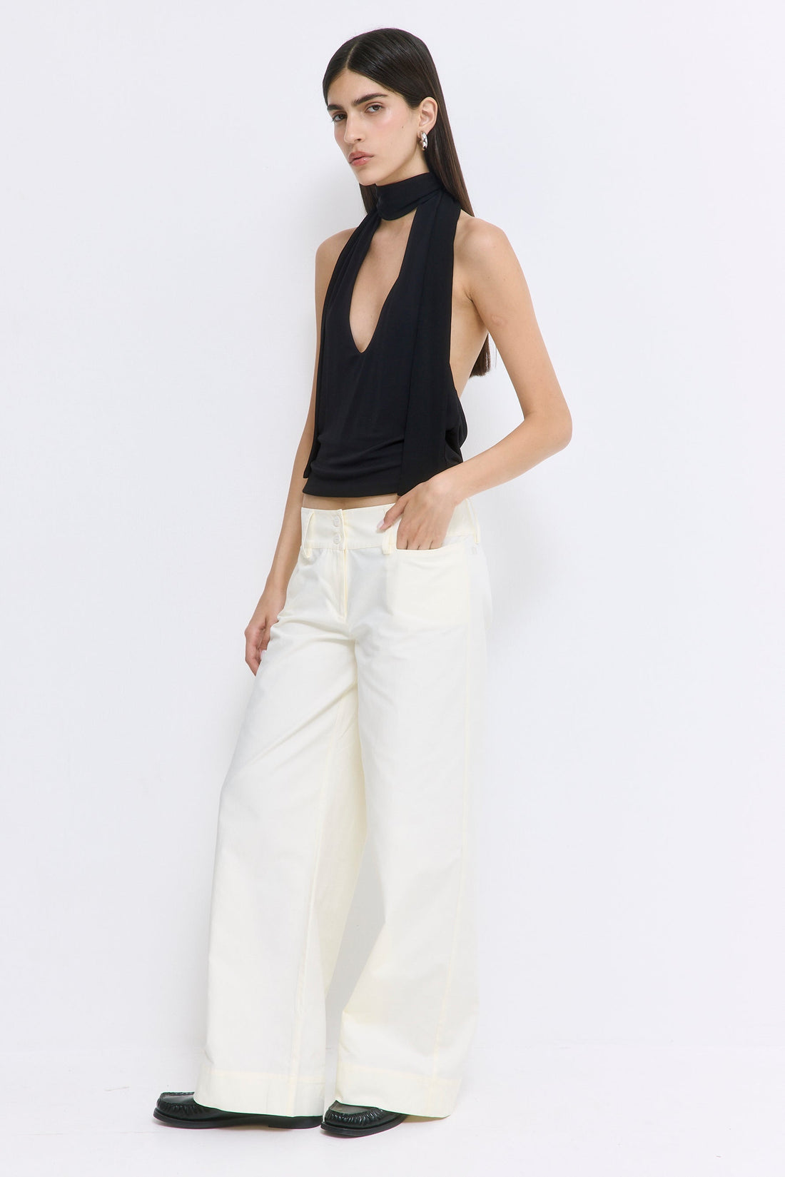 Our most iconic addition to our jersey collection. Crafted in a stretchy and soft fabric that flatters and shapes the body. Deep V neckline and an open low back. Features a gathered detail at the halter neckline's center. Includes a classy, thin tonal jersey scarf, designed to complete the neck line with an iconic twist. Versatille styling allows for wear with or without the scarf. Style it with our matching jesrey mini skirt and our iconic yvon shoulder bag for the most beautiful seasonal look.