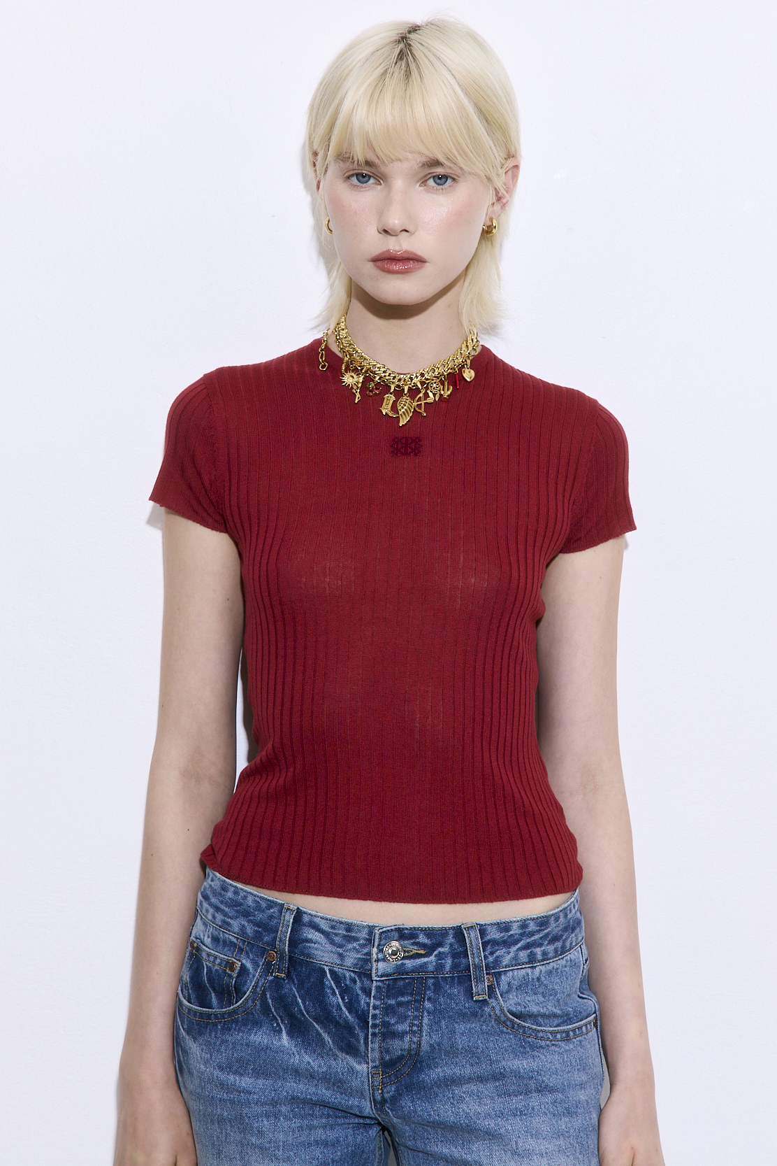 Prepare to fall in love with our new sheer ribbed logo top. Crew neckline. Delicate ribbed finish. Soft and lightweight ribbed fabric. Slightly sheer. Contrasting intarsia logo detailing on the front. Short sleeved. Style it with our full length linen pants, our beautiful oval sunnies and seal this look with our signature Rodika tote bag for the perfect summer look.