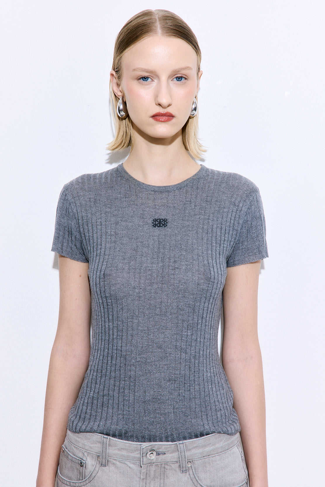 Prepare to fall in love with our new sheer ribbed logo top. Crew neckline. Delicate ribbed finish. Soft and lightweight ribbed fabric. Slightly sheer. Contrasting intarsia logo detailing on the front. Short sleeved. Style it with our full length linen pants, our beautiful oval sunnies and seal this look with our signature Rodika tote bag for the perfect summer look.