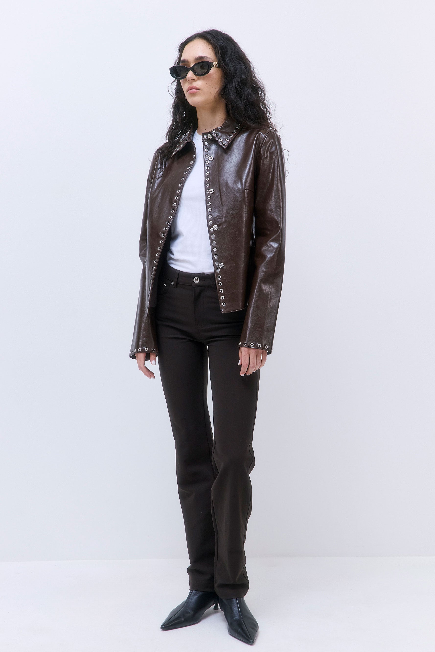 An iconic addition to our winter drop. Faux leather. Fitted jacket. Featuring silver eyelet embellishments along the jacket. Clean plackets with snap buttons. Waist tabs. Tonal debossed logo on the back. Fully lined. Chest darts. Style it with it's matching Faux Leather Fitted Wrap Skirt and our timeless Sheer Baby Tee for a sleek look.