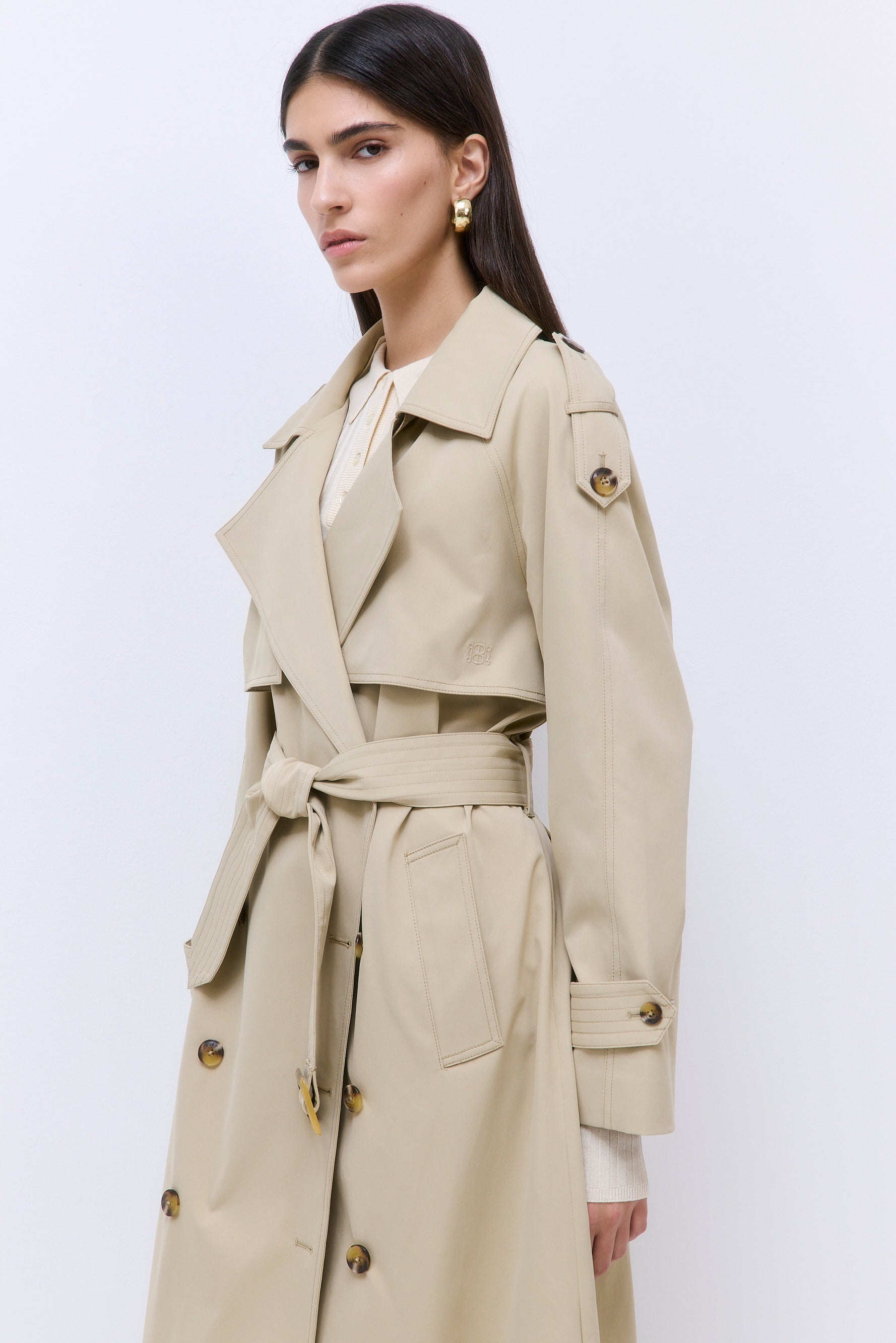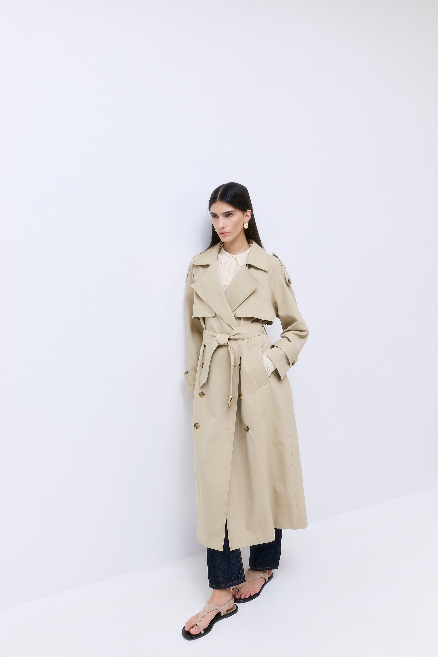 A refreshing take on our classic trench coat. Oversized. Double breasted. Fully lined jacket. Front and back flap. Embroidered tonal logo on flap. Engraved buttons. Epaulettes. Wide side pockets. Back yoke. Stitched belt detail. Belt at the waist. Style it with our iconic Oval Sunglasses and our timeless Yvon Shoulder Bag for an effortless transitional look, from summer to fall.