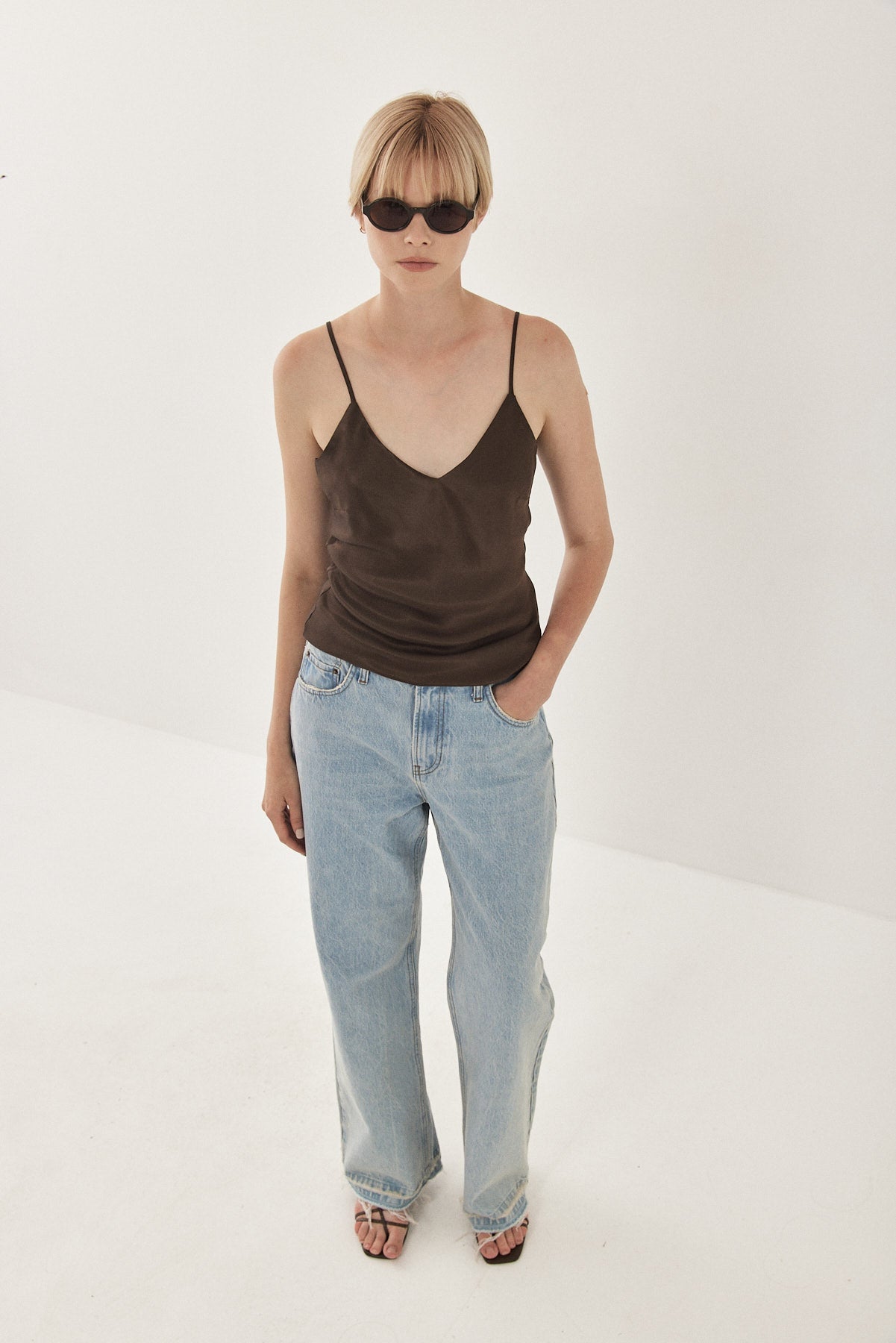 Satin slip camisole. Featuring a v neckline and thin adjustable straps. Made from breathable material. Cut in a special bias cut technique so that the materials falls smoothly and moves with your body. Style yours with the matching satin shorts, our round sunglasses and your favorite shoulder bag for an effortlessly chic look.