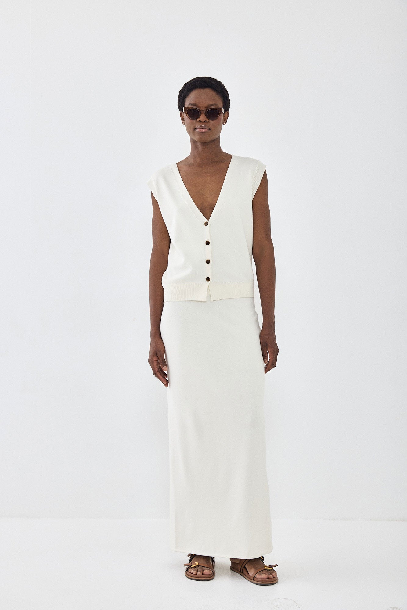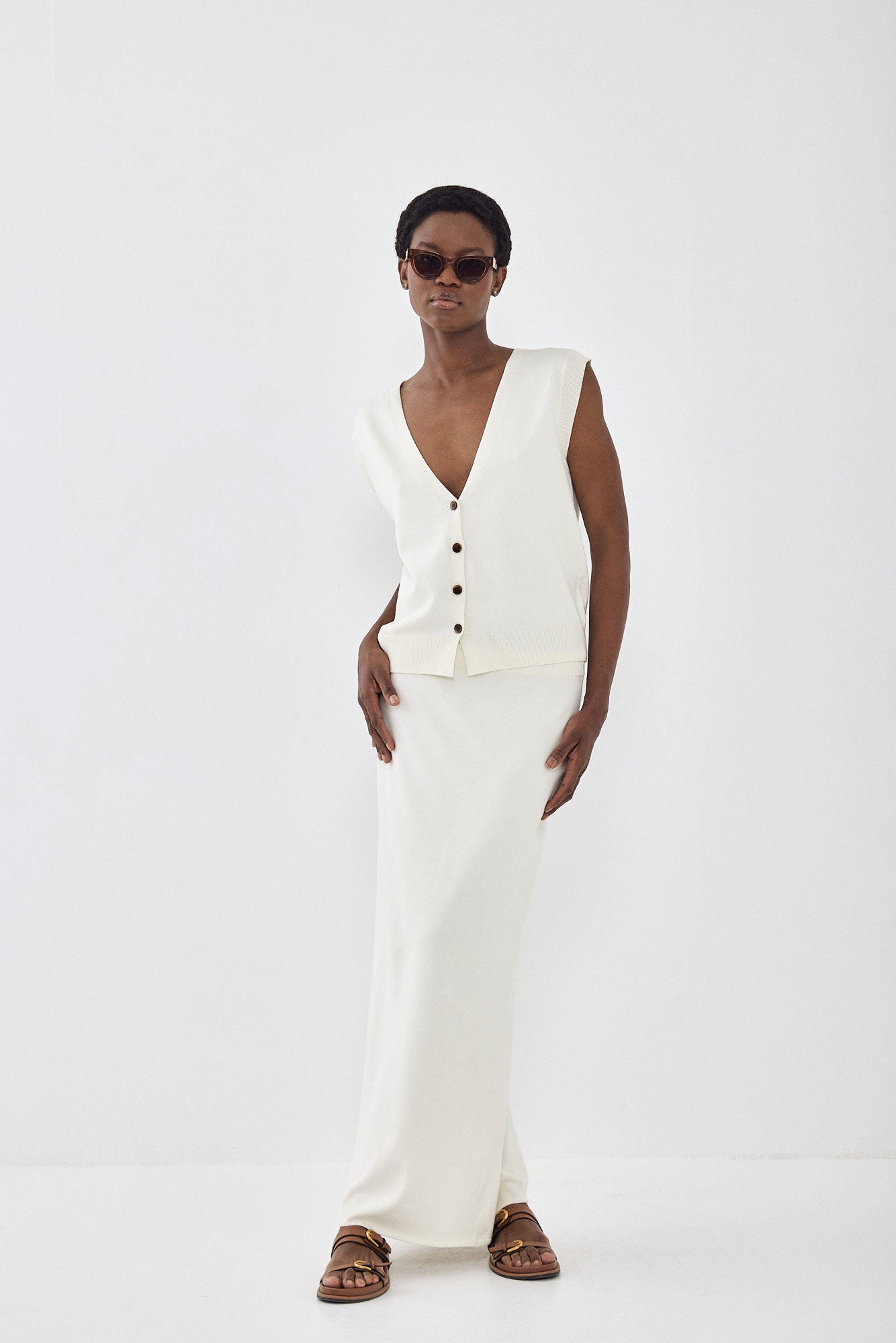 Maxi skirts are the spring staple you must have in your closet. Maxi length skirt with a straight fit. Mid rise. Featuring a ribbed elastic band. Logo embroidery detailing under the belt. The perfect material for spring. Style it with your favorite summer tank, sunnies and slides for an effortlessly classy spring look.