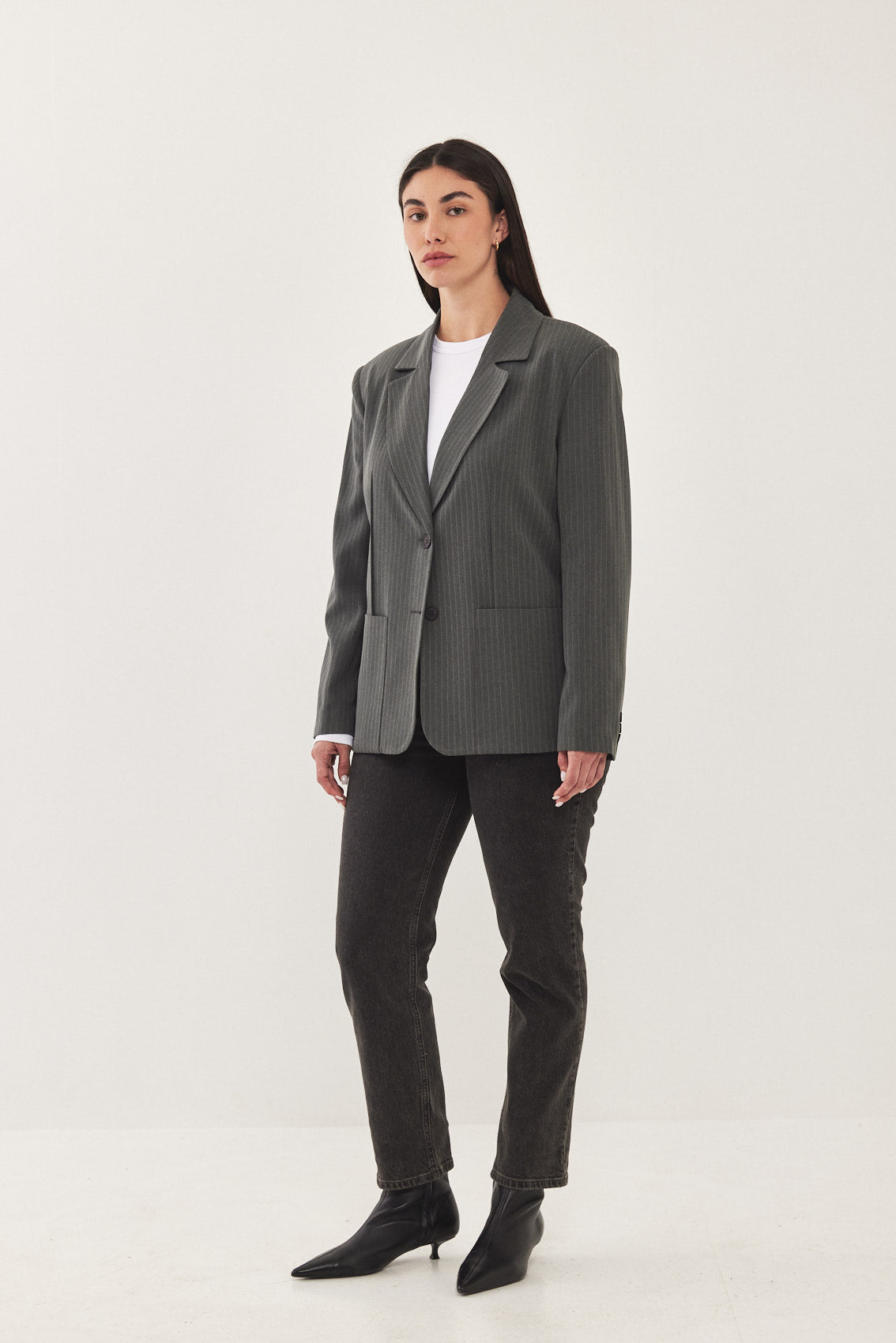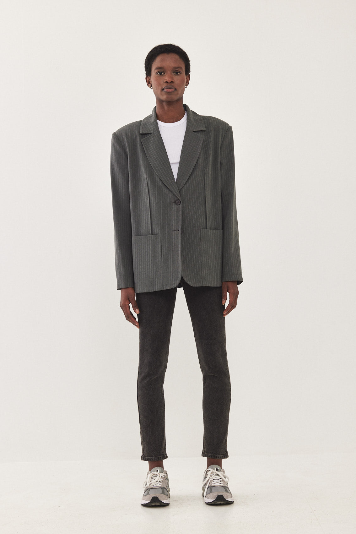 A classic masculine cut in a loose silhouette, reminiscent of men's blazers. Features a lapel collar and long sleeves with pronounced shoulders. Front button closure and two front pockets. Back embroidered logo detail on the collar and on the side pocket. Style it with your favorite top and matching daddy pants.