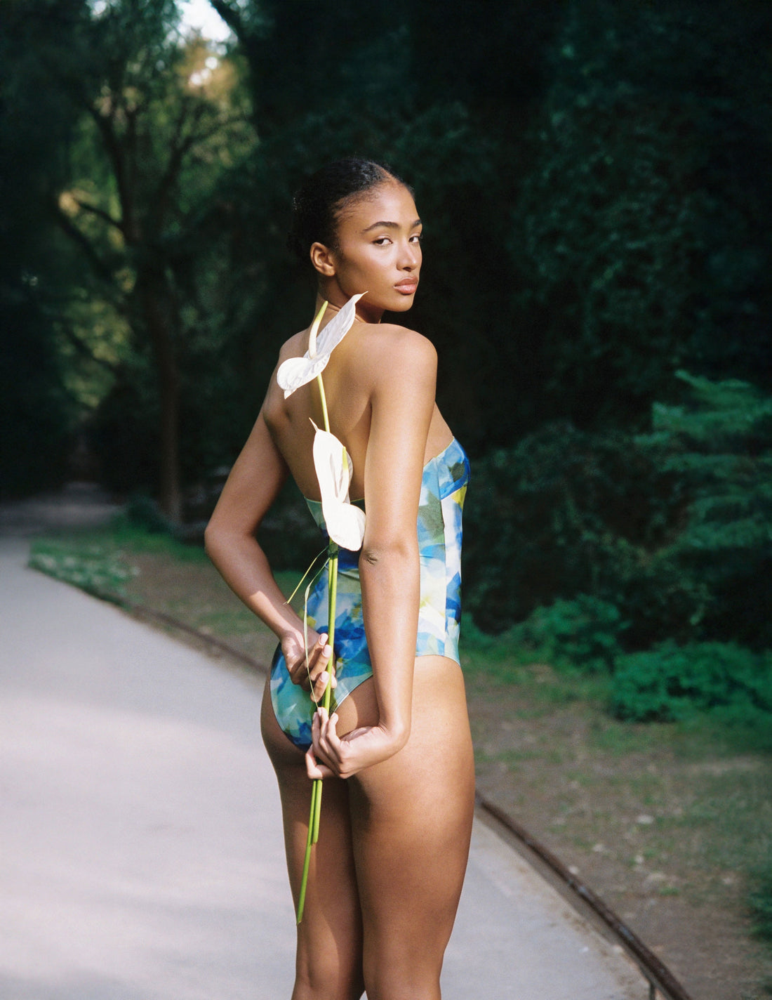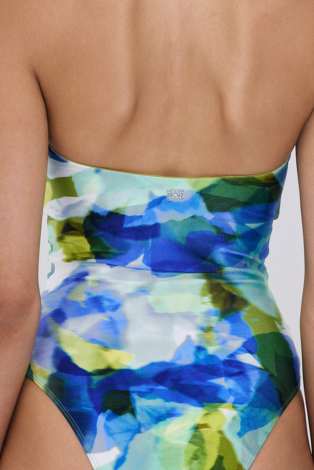 Lily, in our most special Lagoon pattern that inspired our magical swimwear collection. This piece was evoked by the timeless beauty of water flowers and was made to blend effortless sophistication with a sculpting fit. Made from luxurious shiny Italian fabric that smooths and enhances your natural curves. Strapless silhouette with delicate dart details on the bust for a refined, contoured look. An internal silicone band along the top and side wiring for an extra grip and support. Classic coverage with a flattering mid-rise cut. Lined. Features a silver logo detailing on the back. Style it with our new shirred top, our stunning shirred mini skirt and our matching scrunchie for a beautiful beachside look.
