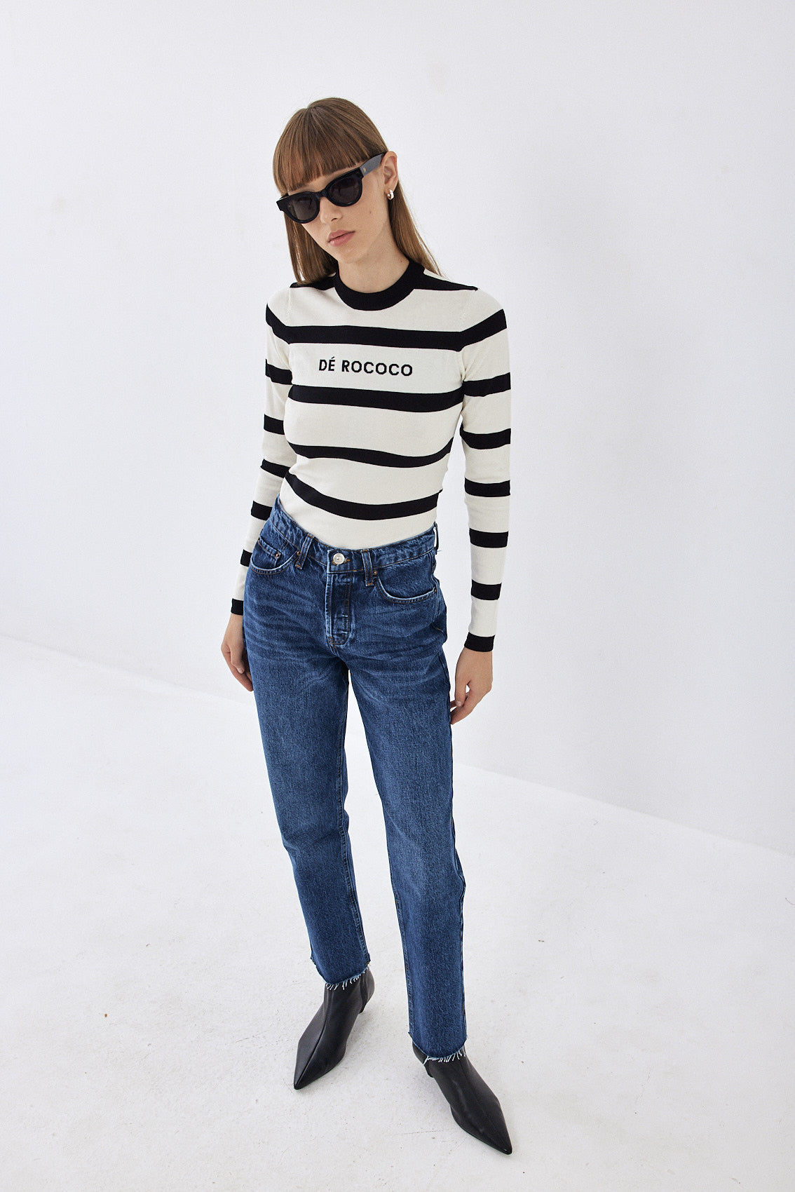 The ultimate knitted crewneck top. Featuring a crew neckline. Ribbed finish. Lightweight and breathable. Striped. Knitted logo on the front. Style it with your favorite pair of denim, our vegan leather trench coat and a chunky boot for a cool girl look.