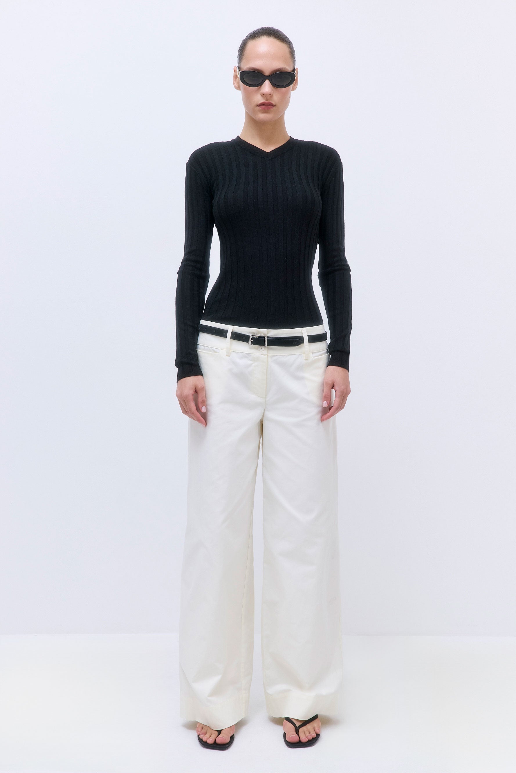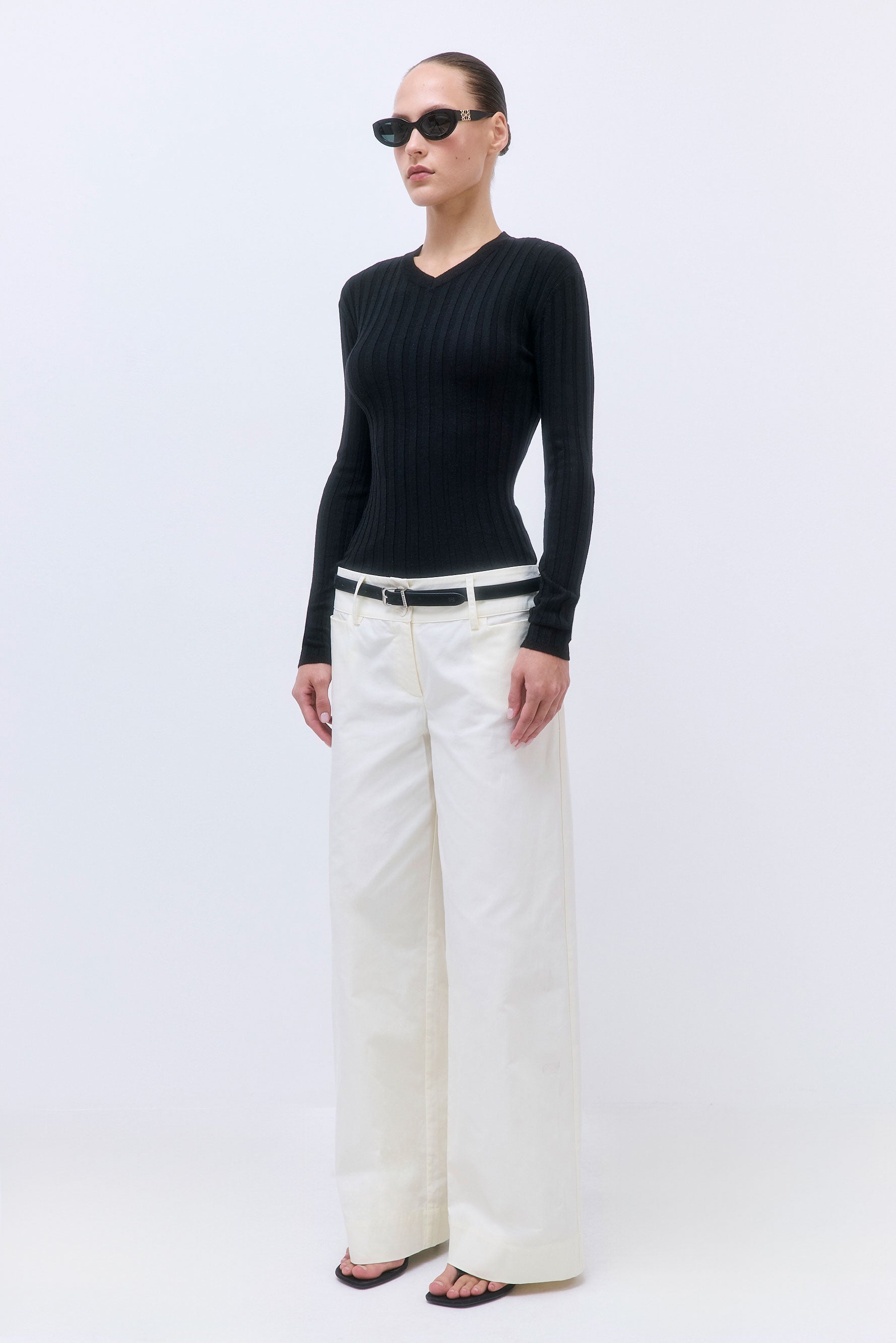 The ultimate transition piece, from summer to fall. Subtle V neckline. Wibe rib knit. Fitted silhouette. Fully fashioned. Tonal silicon logo on the back. Style it with our iconic No. 15 Denim and timeless Oval Sunglasses for a simple, yet sleek look.