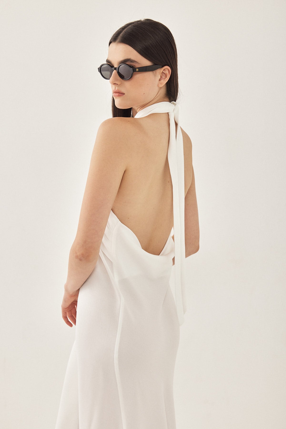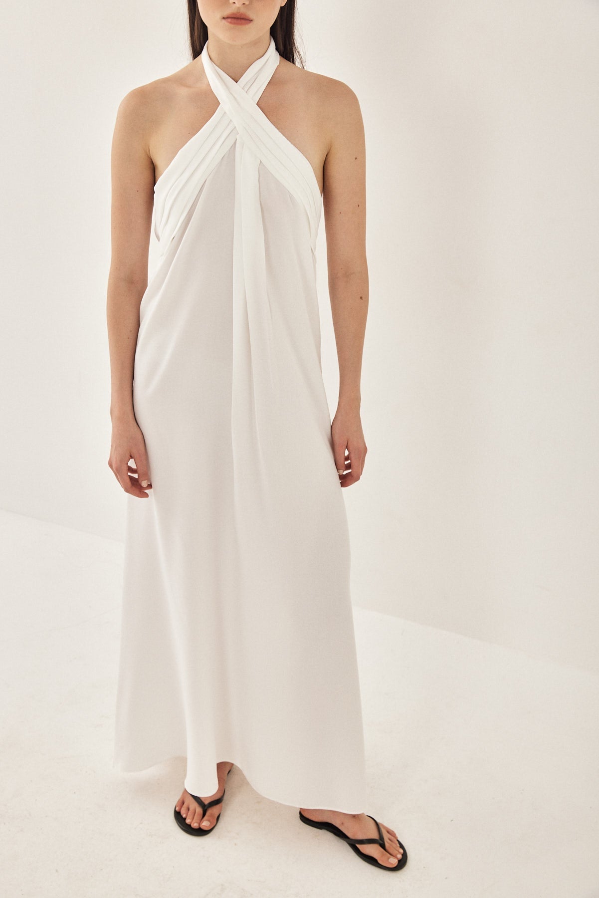 Utterly stylish summer maxi dress. Made from an ultra breathable material. Crossover collar neckline with a slight open back. Tie closure at the neckline. A delicate A-line silhouette. Style yours with your favorite sandals and a pair of earrings for the perfect vacation look.
