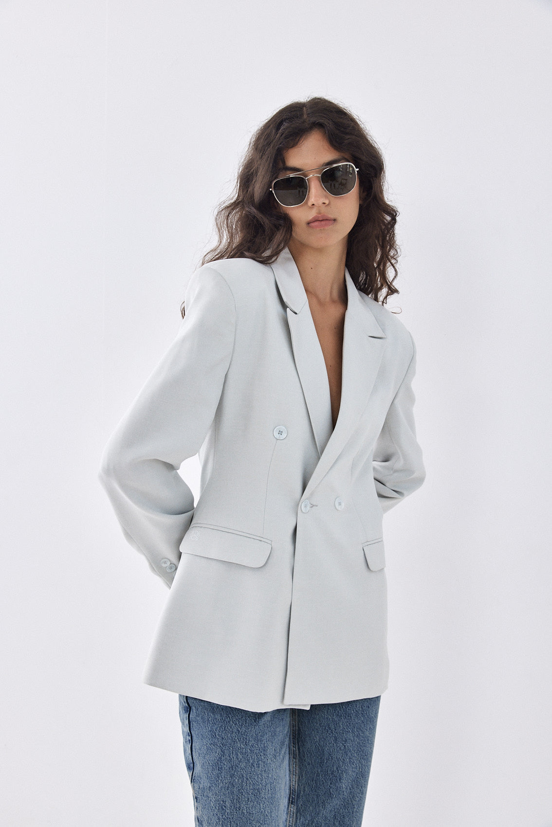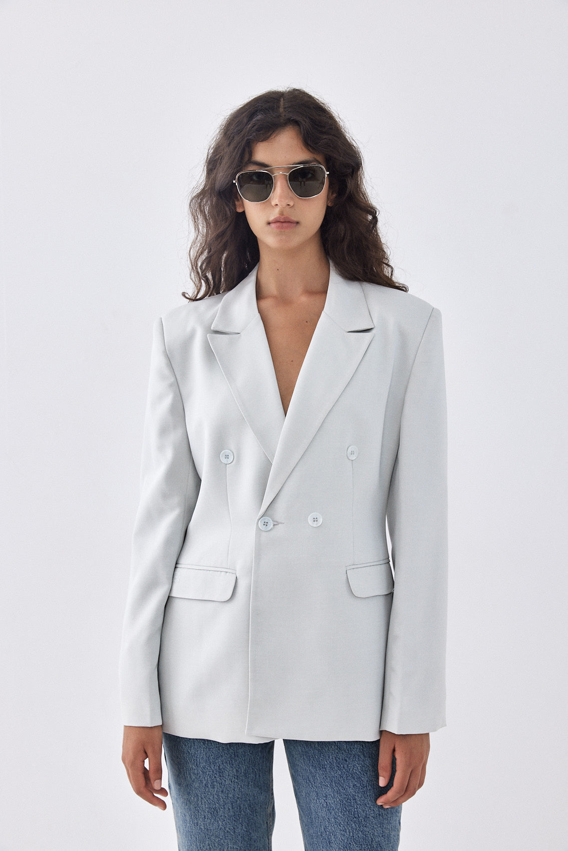 A classic blazer with an oversized fit. Features broad shoulders and a lapel collar. Fitted at the waist for a cinched look, giving the blazer a structural shape. Double breasted buttoned closure. Back embroidered logo detail on the collar. Complete the look with a pair of matching daddy pants and a pair of loafers for a classic look.