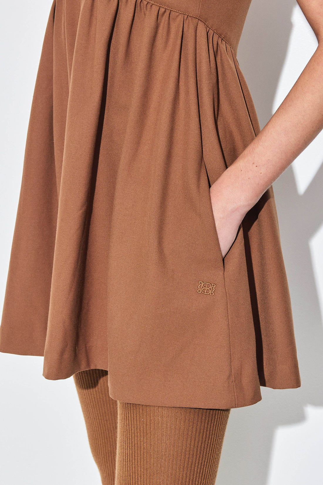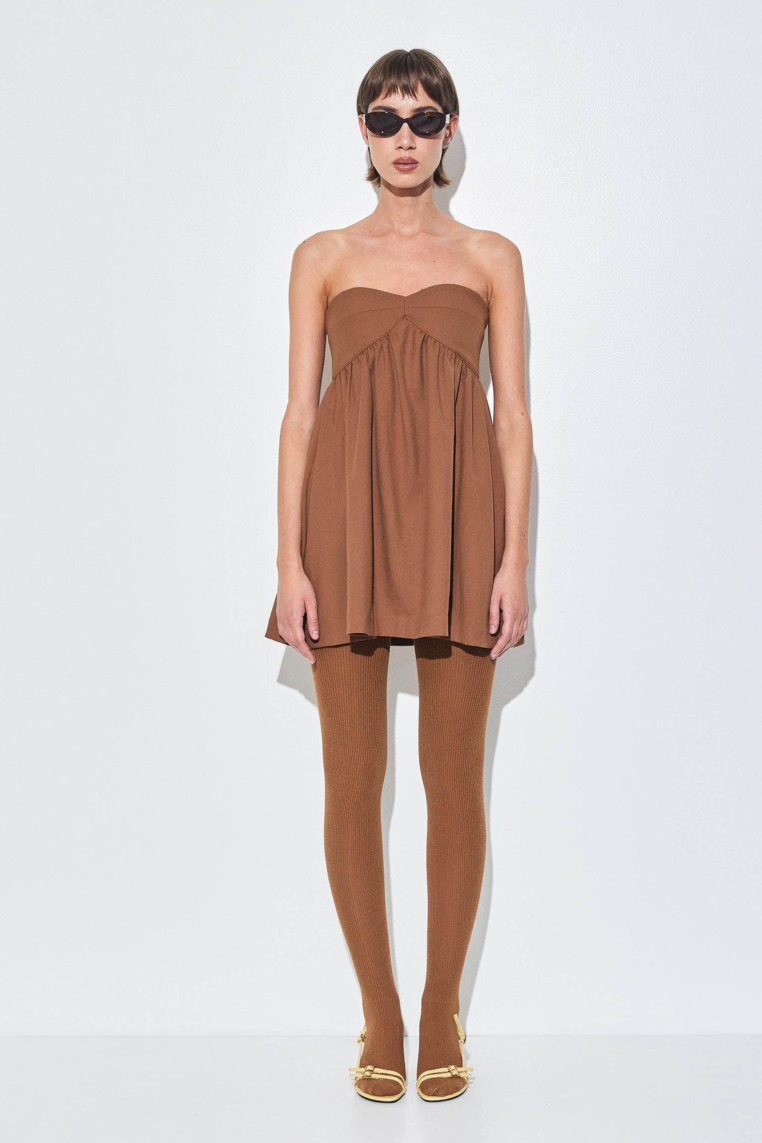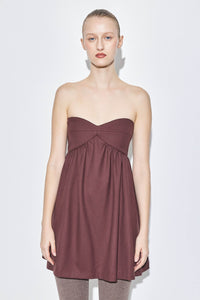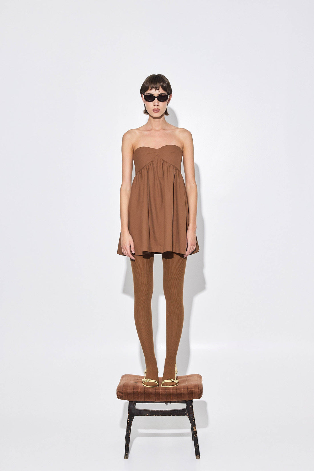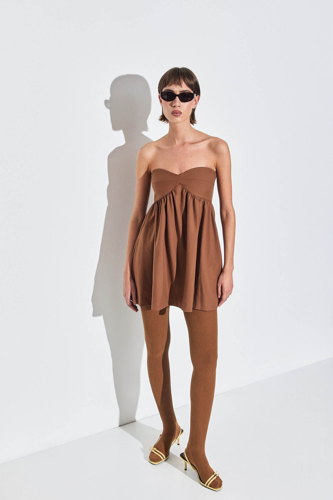 The newest addition to our signature daddy collection in a new luxurious tailored fabric. A tailored corset strapless mini dress. Side zipper. Lined bodice. Internal silicone grip for extra support. Two side pockets. Fitted at the bust, loose at the waist for extra volume. Tonal logo embroidery detailing on the pocket. Style it with sheer tights, knee high boots and our oval sunglasses to seal this gorgeous look.