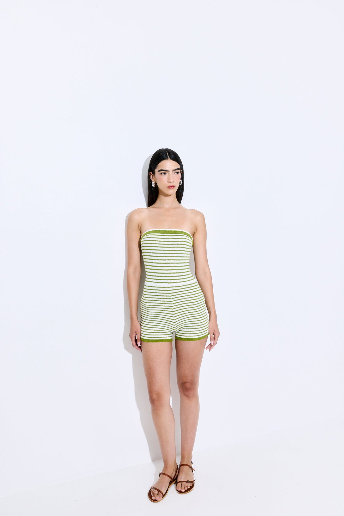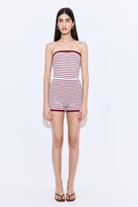 Our new boucle romper is the coolest summer piece you'll own. Made from soft, textured boucle that’s breathable yet structured — offering lightweight warmth, subtle stretch, and all-day comfort with a refined edge. Strapless. Fitted silhouette. Mini length. Elastic chestband for extra grip and support. Striped pattern. Tonal silicone logo embossed patch at the back. Style it with our gorgeous Rodika tote, our oval sunnies and our iconic scrunchie for the ultimate summer look.