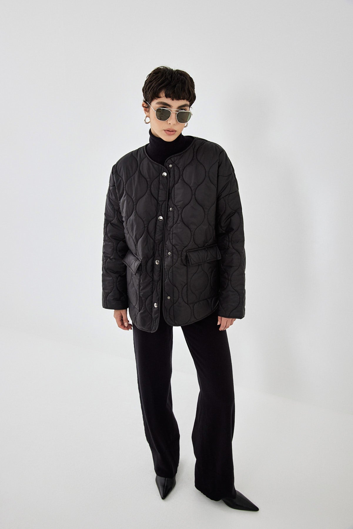 The ultimate addition to your winter wardrobe. Quilted lightweight coat, perfect for the season. Onion quilt pattern. Unlined. Features snap button closure. Two front pockets with a snap button closure. Style it over your favorite knitwear set, add our aviator sunglasses and a kitten heel for the ultimate cold season look.