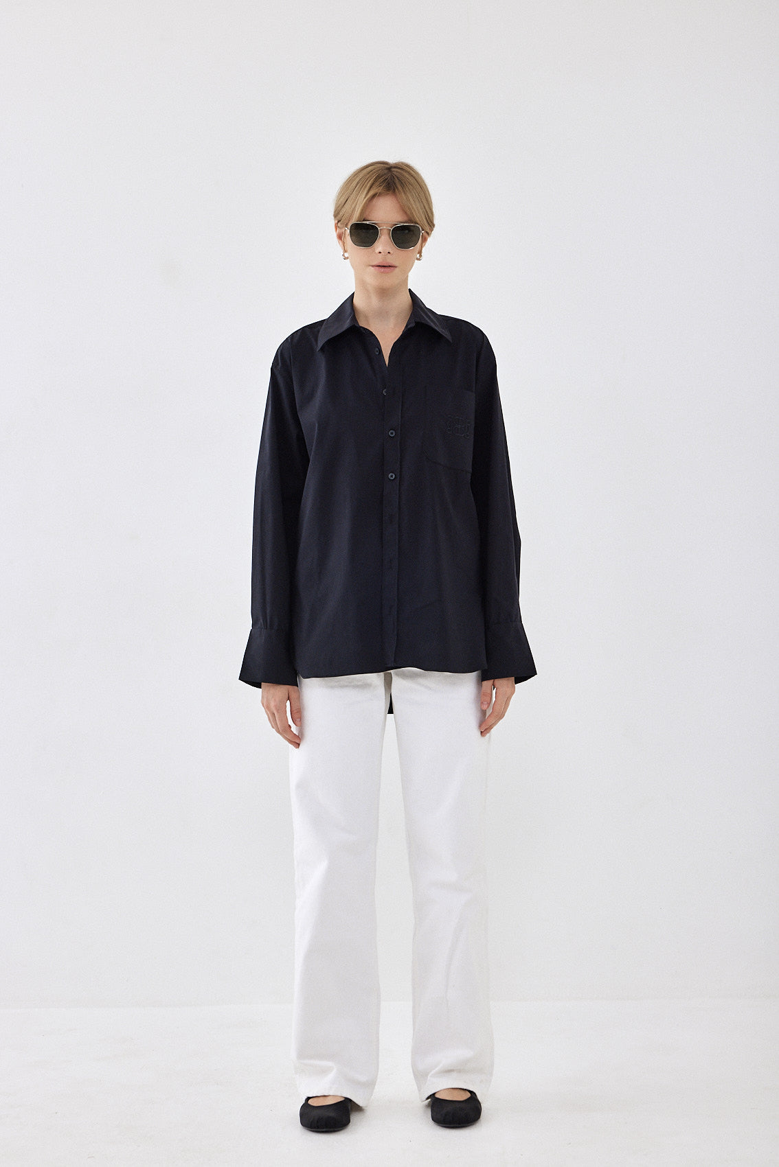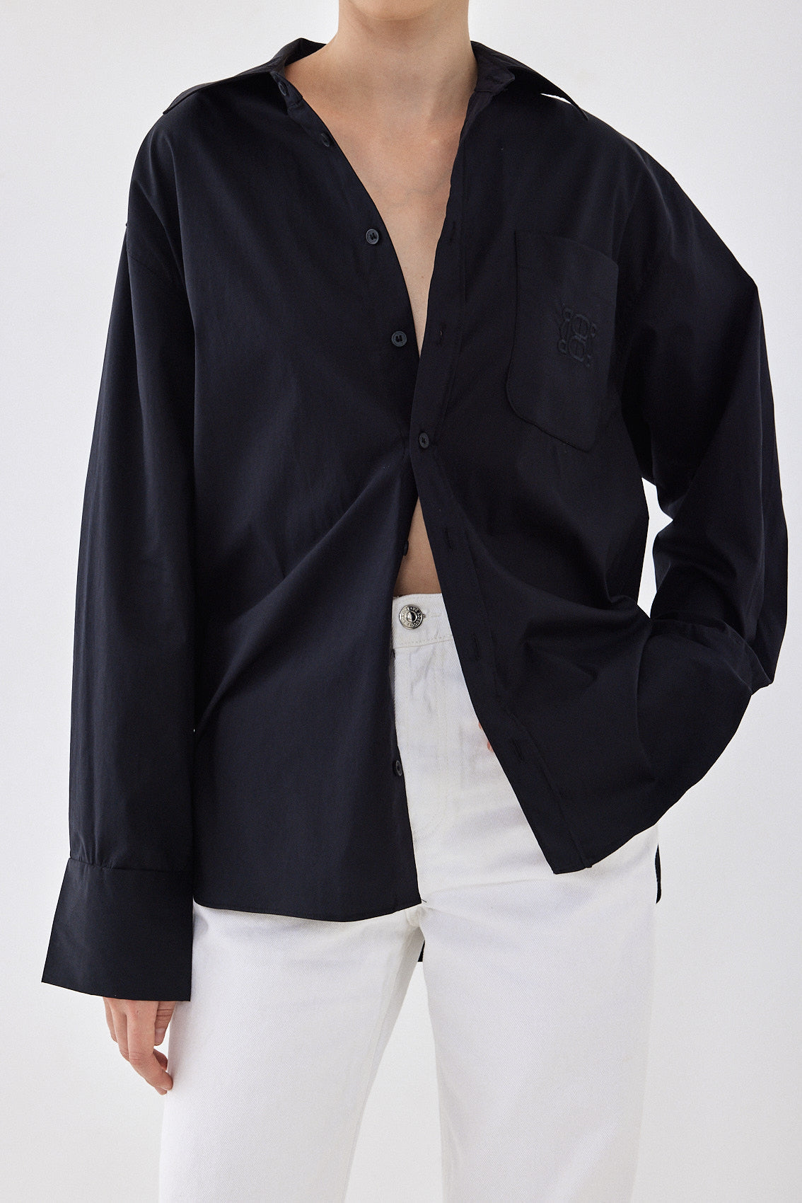 The perfect oversized cotton button down shirt. Features frontal button down closure. Lapel collar and oversized cuffs. Front pocket featuring logo. Crispy, ultra-flattering fabric. Style it with the matching skirt for the ultimate holiday look.