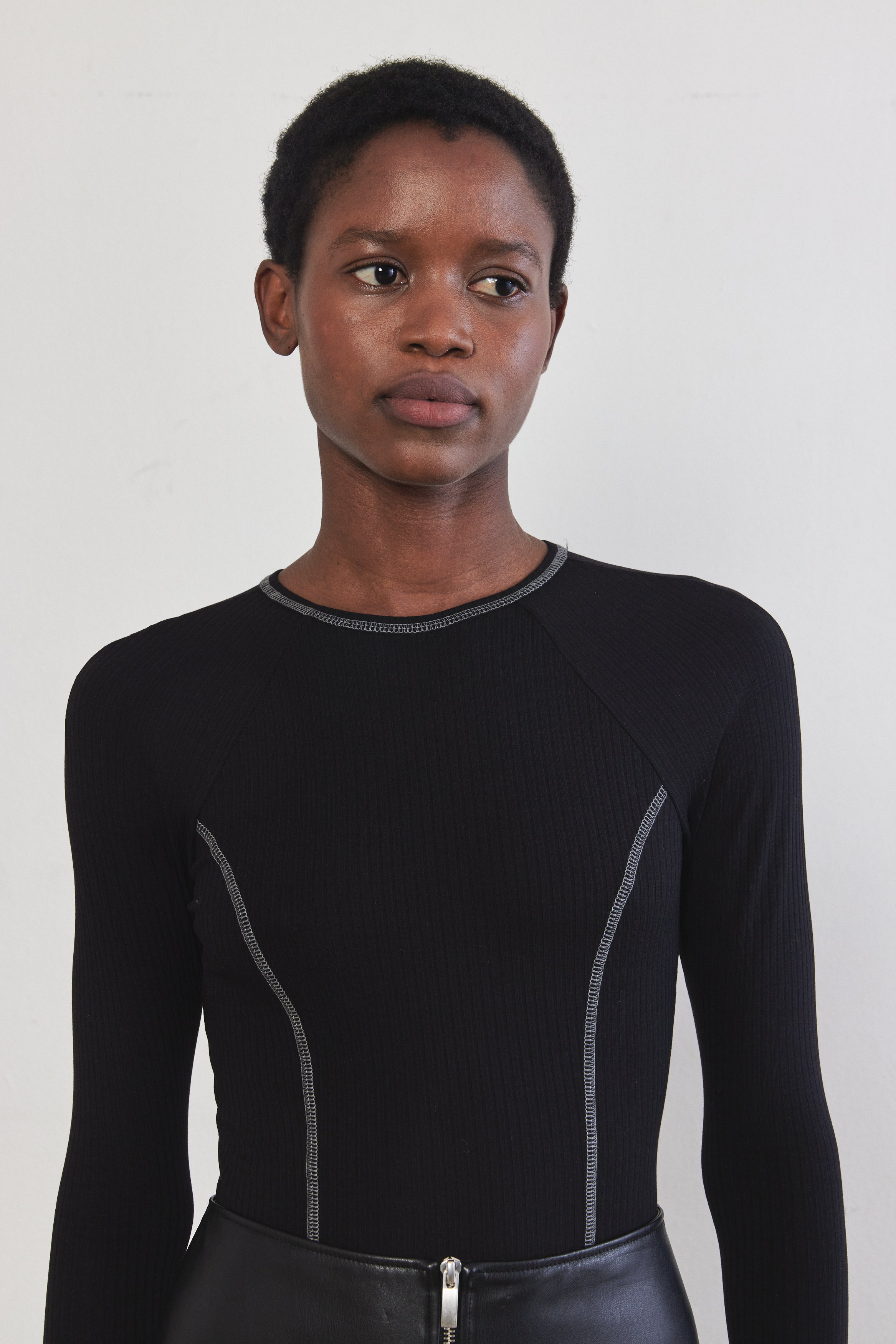 Long sleeve close fit top. Features a princess cut stitch detailes. Made from a thin ribbed stretchy fabric. Complete the look with a matching ribbed leggings.