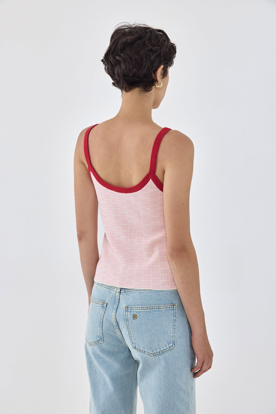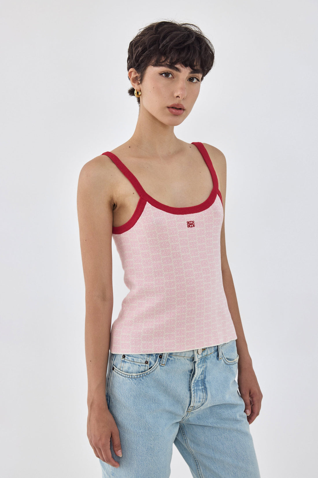 A fun print with a classic silhouette top is an absolute wardrobe essential this summer. Featuring thin precise straps. Contrast ribbed stripe. Deep round neckline. Deep round back. Monogram intarsia print. Style it with the striped cotton maxi skirt for a fun play on textures and prints, a fun chic look for summer.