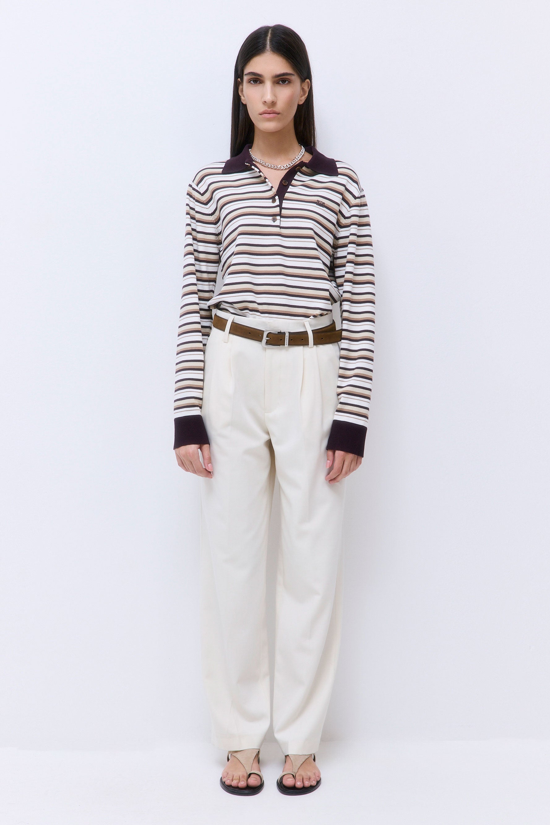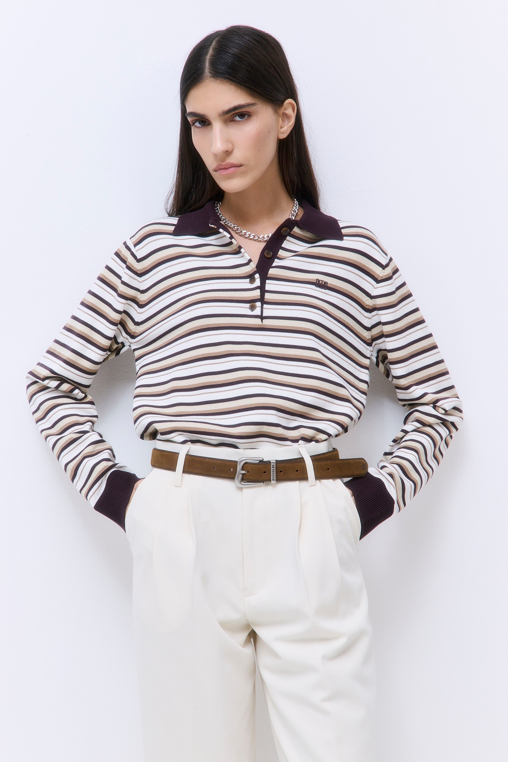 The newest addition to our timeless fully fashioned knitwear. Our new beige stripes polo shirt is a must have this fall. Long sleeved. Four branded buttoned frontal closure. Ribbed finish. Delicate embroidered logo on the front. Classic collar. Style it with our iconic No. 15 Denim and stylish Cateye sunglasses for the ultimate summer to fall look.