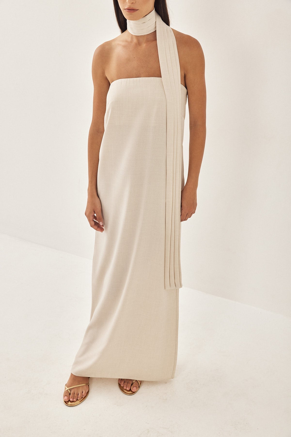The chicest summer maxi dress. Made from an ultra breathable material. Strapless neckline with a double lining at the chest for extra coverage and support. A delicate A-line silhouette. Can be worn with the removable matching scarf with delicate pleat detailing. Style yours with a pair of sandals for the perfect outfit suitable for both everyday and the most stylish vacation.
