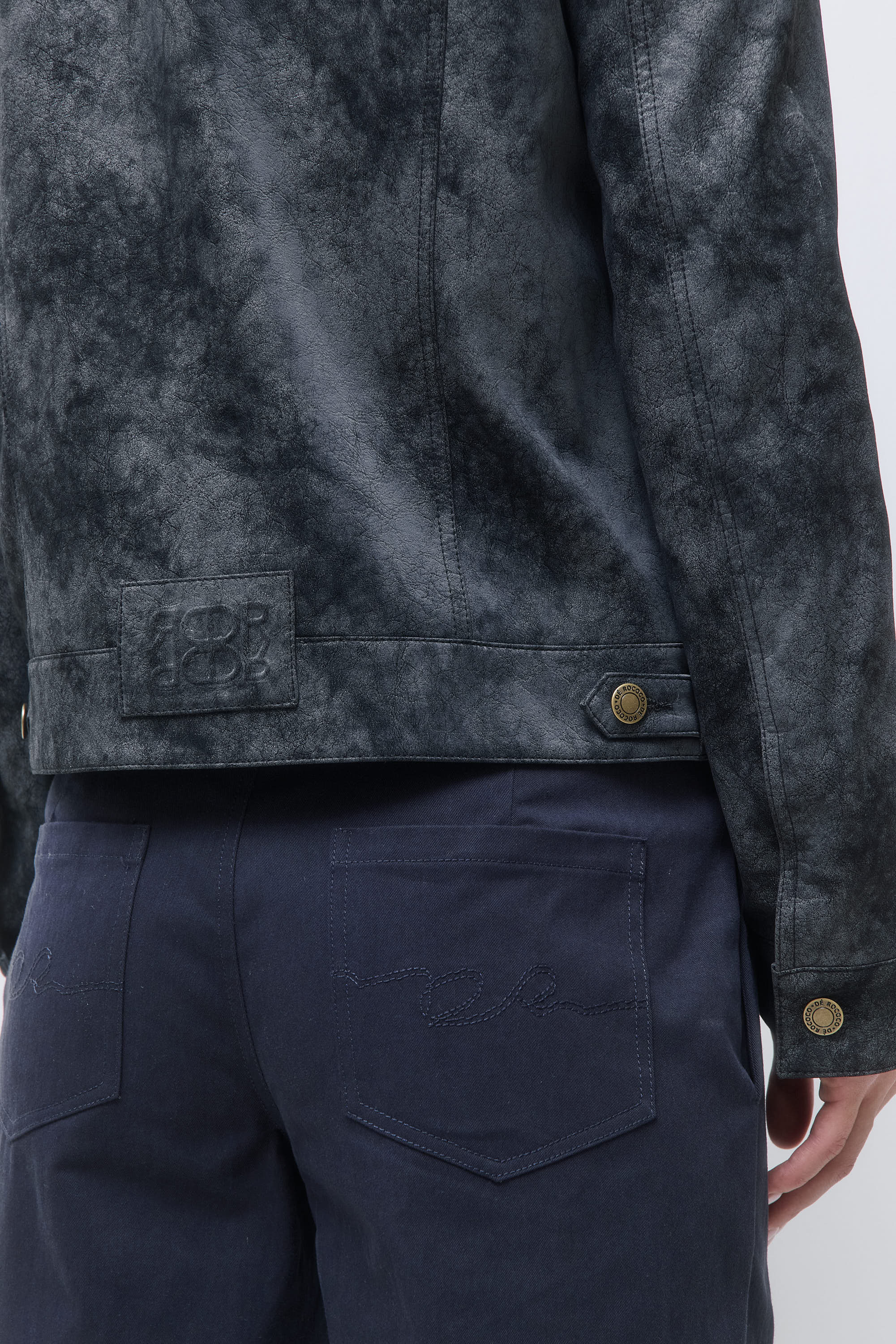 Bold, structured, and undeniably versatile. Vegan leather, denim inspired fitted and cropped jacket. Featuring a subtly cracked texture. Designed with two fake pockets, side welt pockets. Fully lined. Finished with brass buttons and cuffed sleeves. Featuring an embossed logo patch at the bottom back. Back yoke. Style it with our essential Fitted Full Length Pants and our iconic Classic Long Sleeved T shirt for an effortless look.