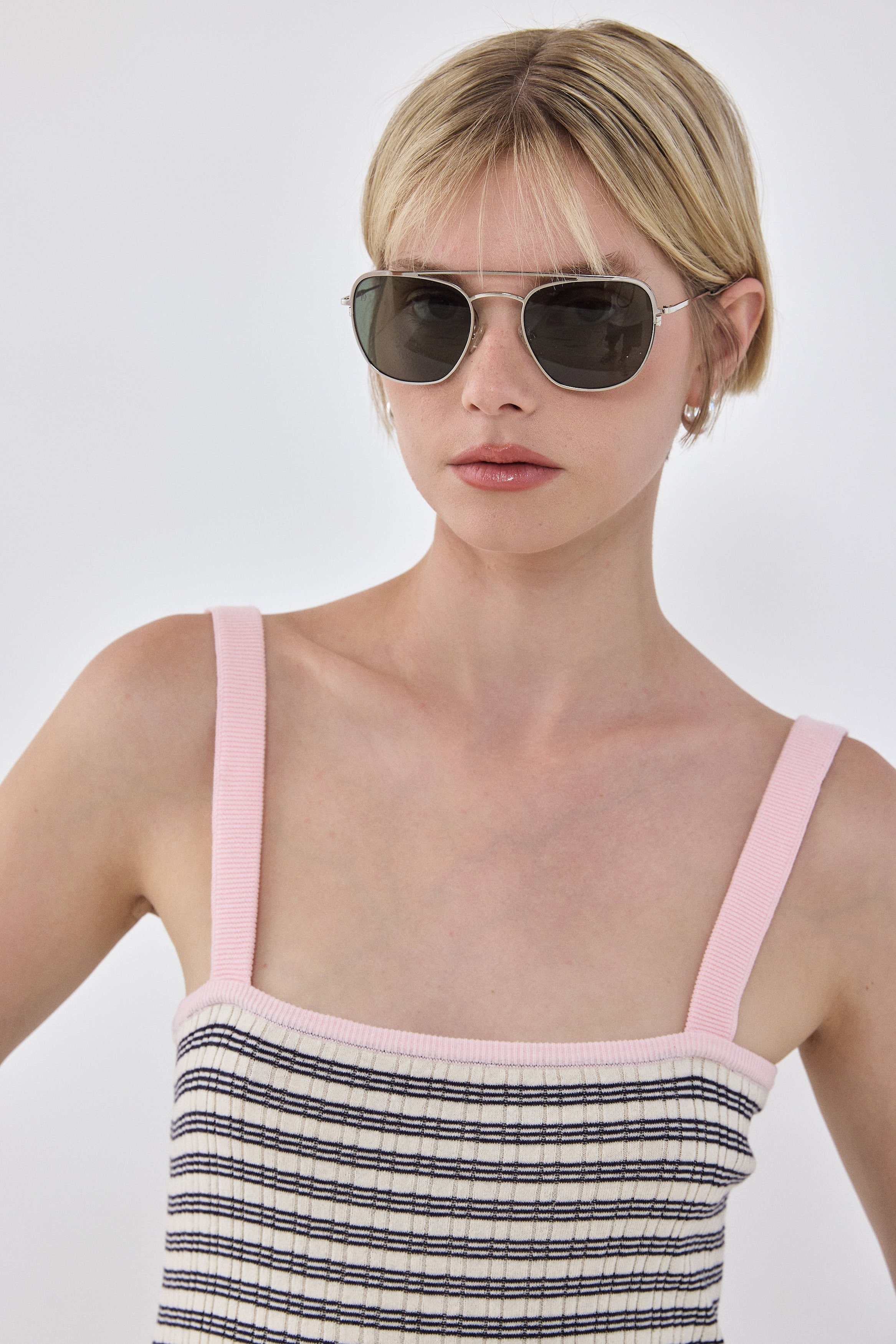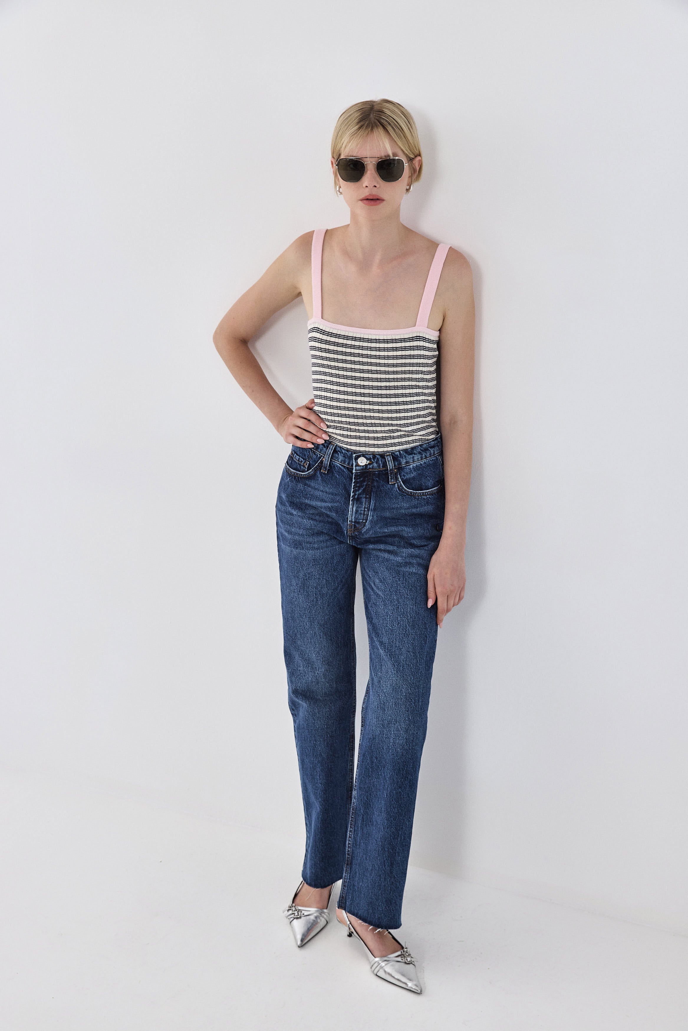The perfect striped tank is an absolute summer essential. Cami tank top. Straight neckline. Ribbed fabric. Delicate contrast logo embroidery detailing on the front. Ribbed finish. Delicate sheer. Style it with your favorite oversized wide leg denim, a pair of Mary Janes and your favorite purse for a chic everyday look.