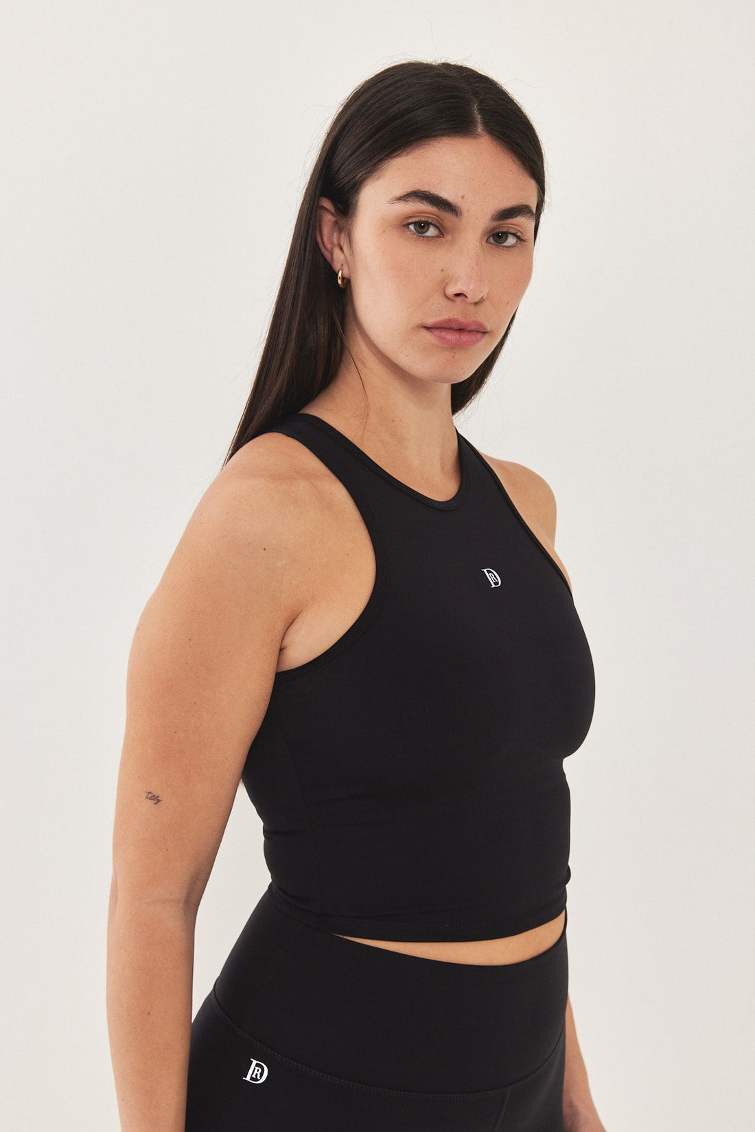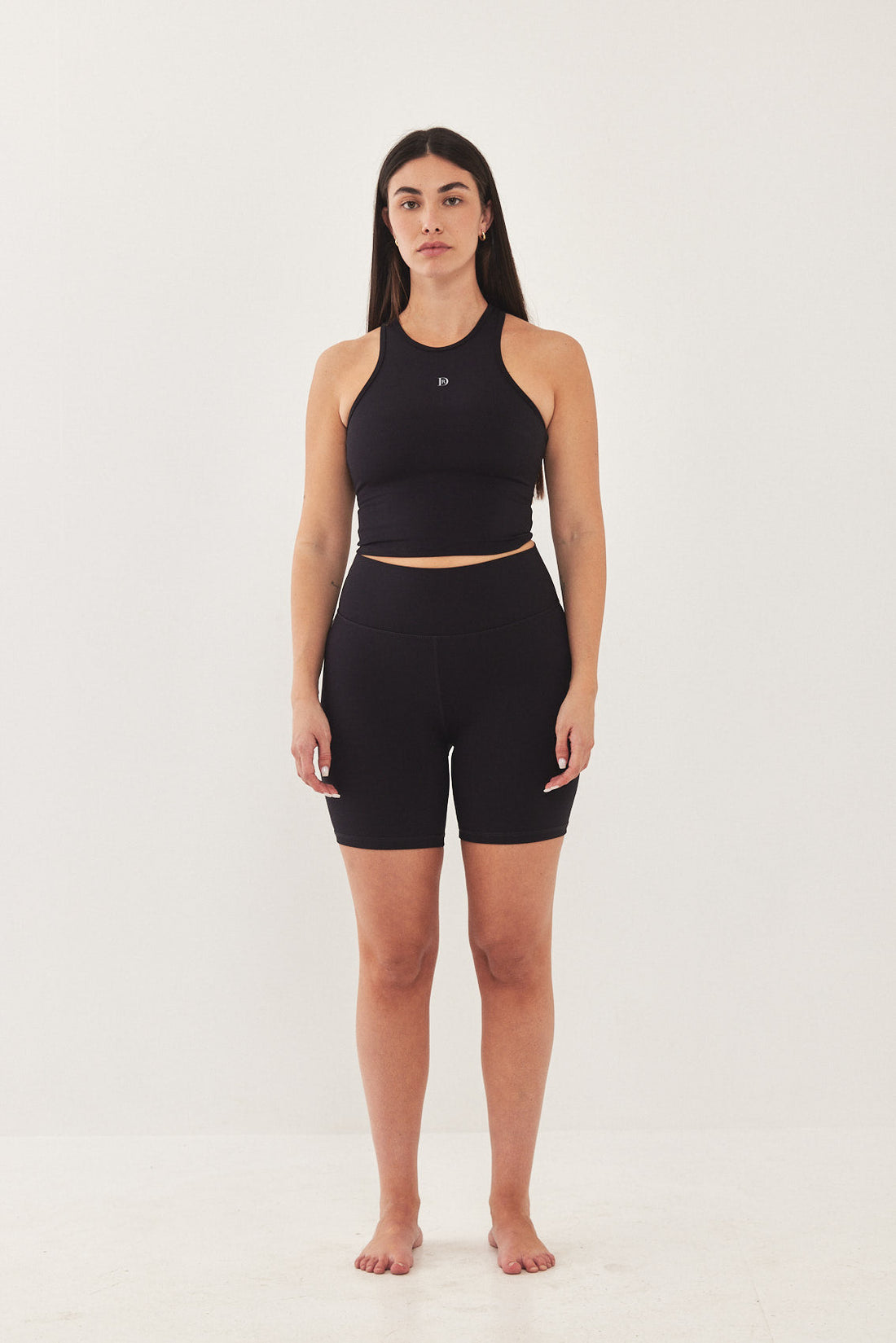 Dé racer top has a second-skin fit and feel, made from a stretchy supportive fabric.Has an inner layer at the chest with a supporting under bust band. Features a halter neckline and flat lock stitches. Reflector logo on the center front and a fitnéss club signature at the back. Complete the set with one of our matching color fitnéss club bottom.