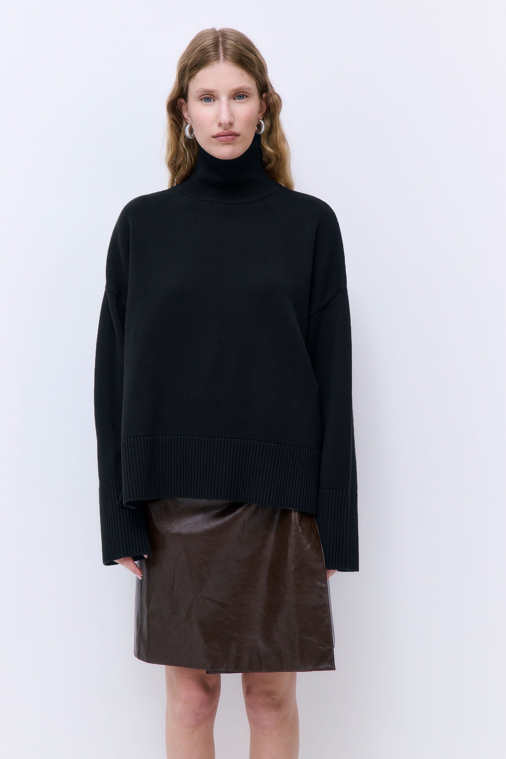 The perfect cozy winter essential. Turtleneck. Oversized fit. Slits on the side. Dropped shoulders. Wide rib hem. Tonal silicon logo on the back. Fully fashioned. Style it with our with our chic Sheer Midi Skirt and pair these with our iconic Yvon Shoulder Bag for an effortless everyday look.