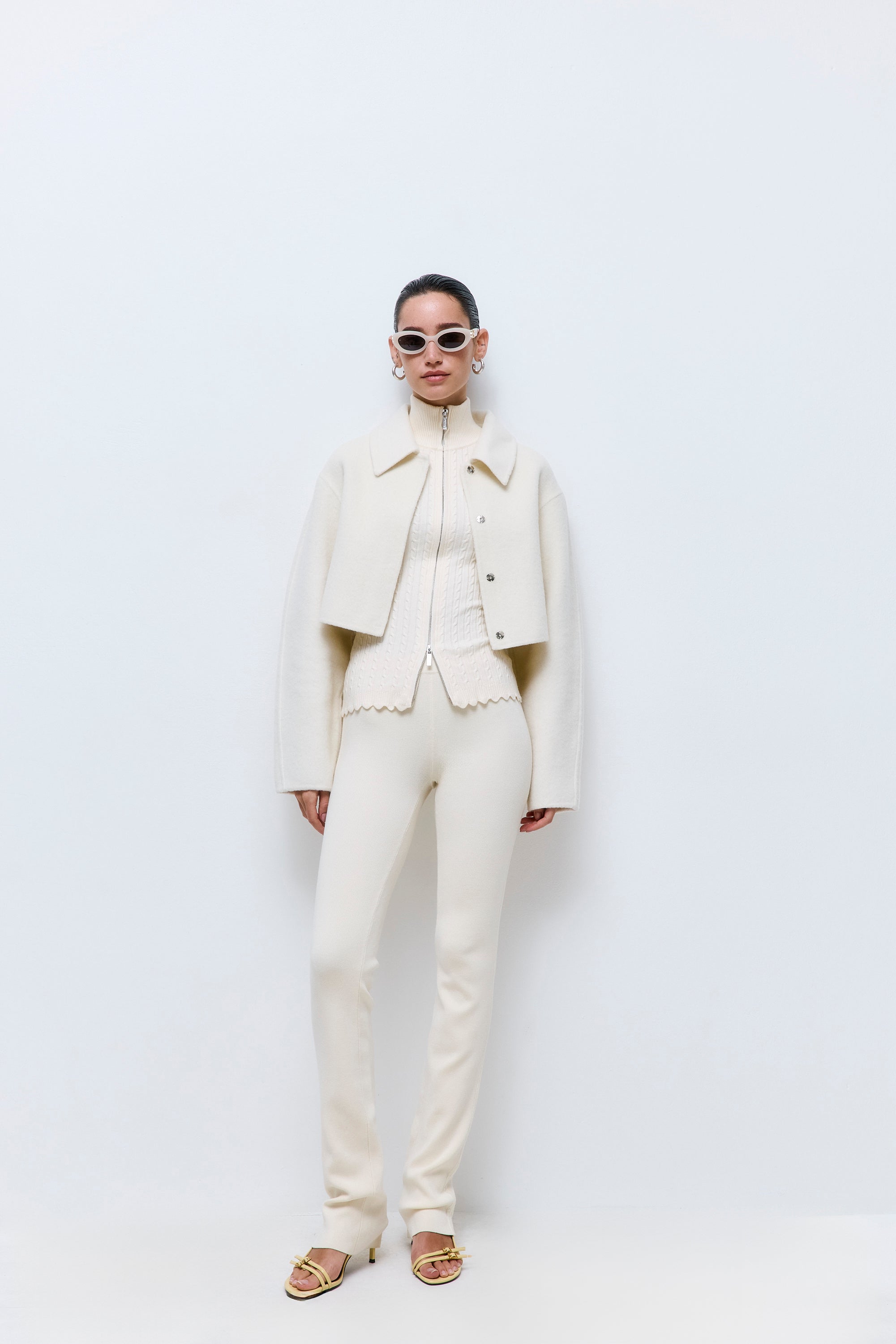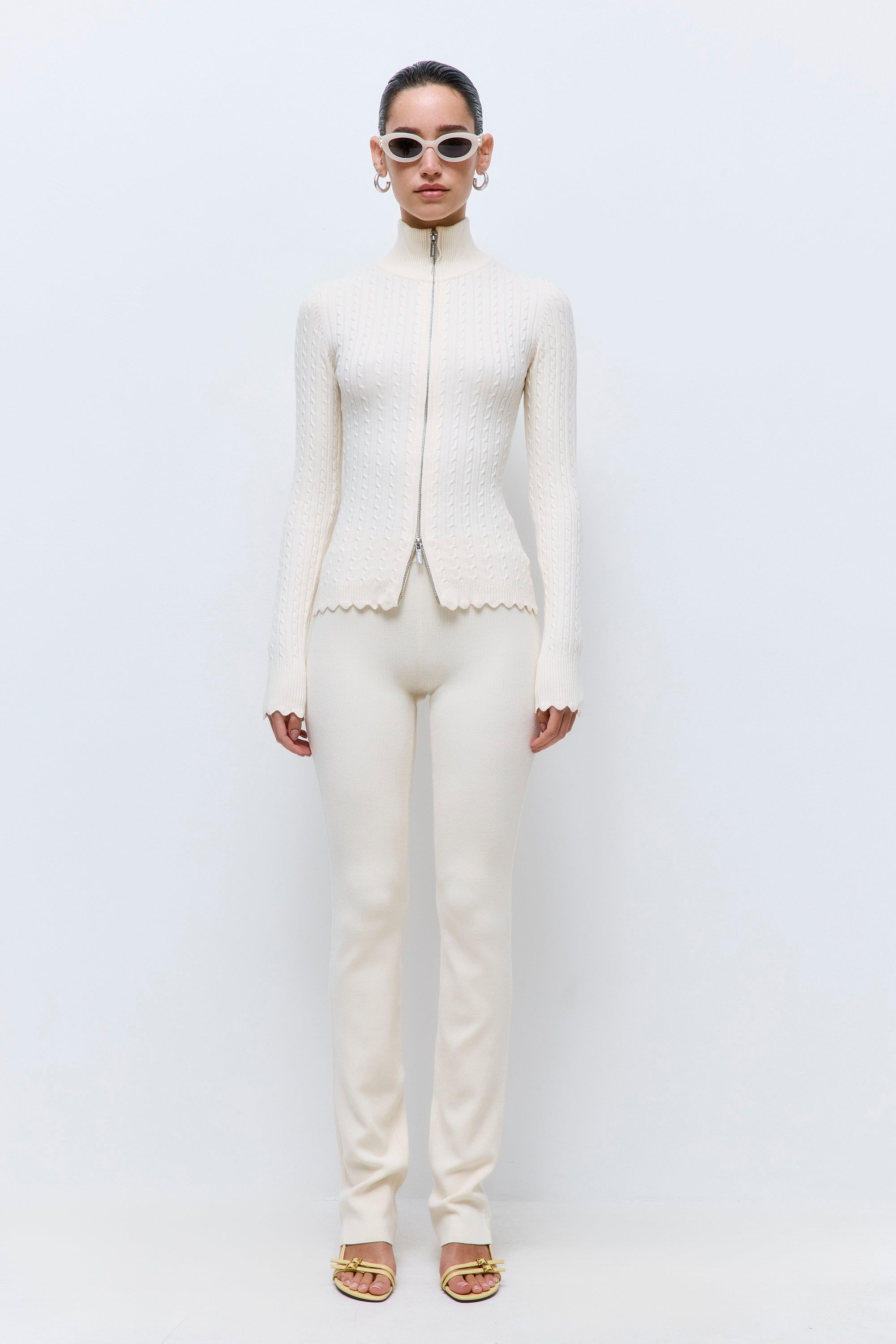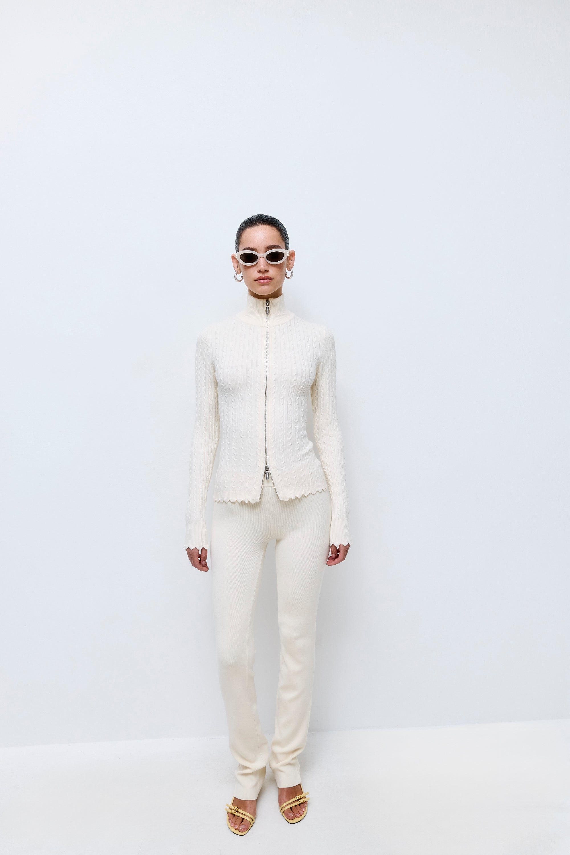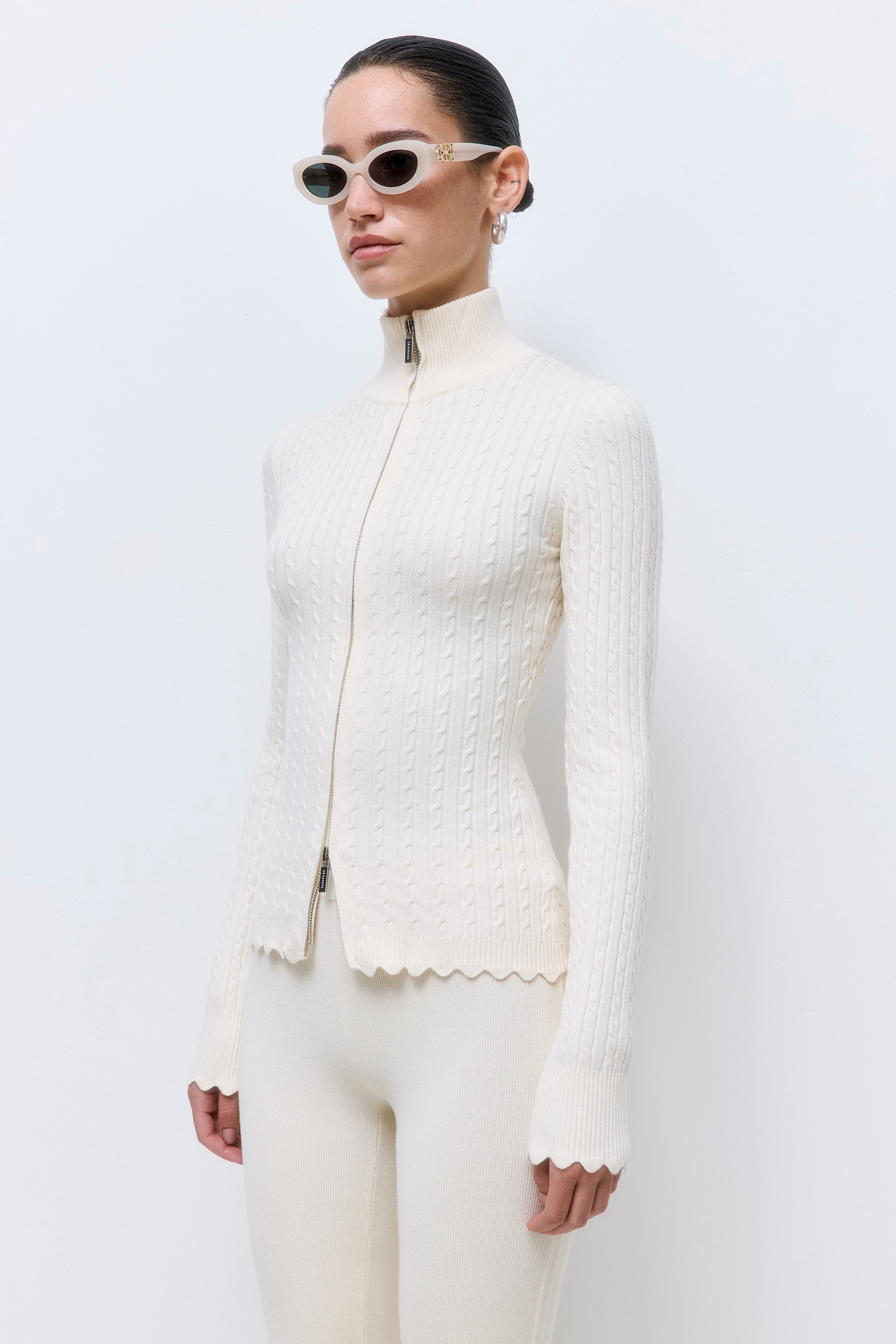 Our new cool-girl Fitted Cable Knit Cardigan is your buttery-soft essential for effortless style. Fitted silhouette. Featuring a double logo zipper that opens from both ends. Can be worn open or closed, as you please. Fully fashioned. Finished with a ribbed collar, cuffs, and hem. Wavy detailing along the sleeves and hem. Pair it with our iconic No. 15 Denim and our luxurious Jackie Sunglasses for a versatile look.