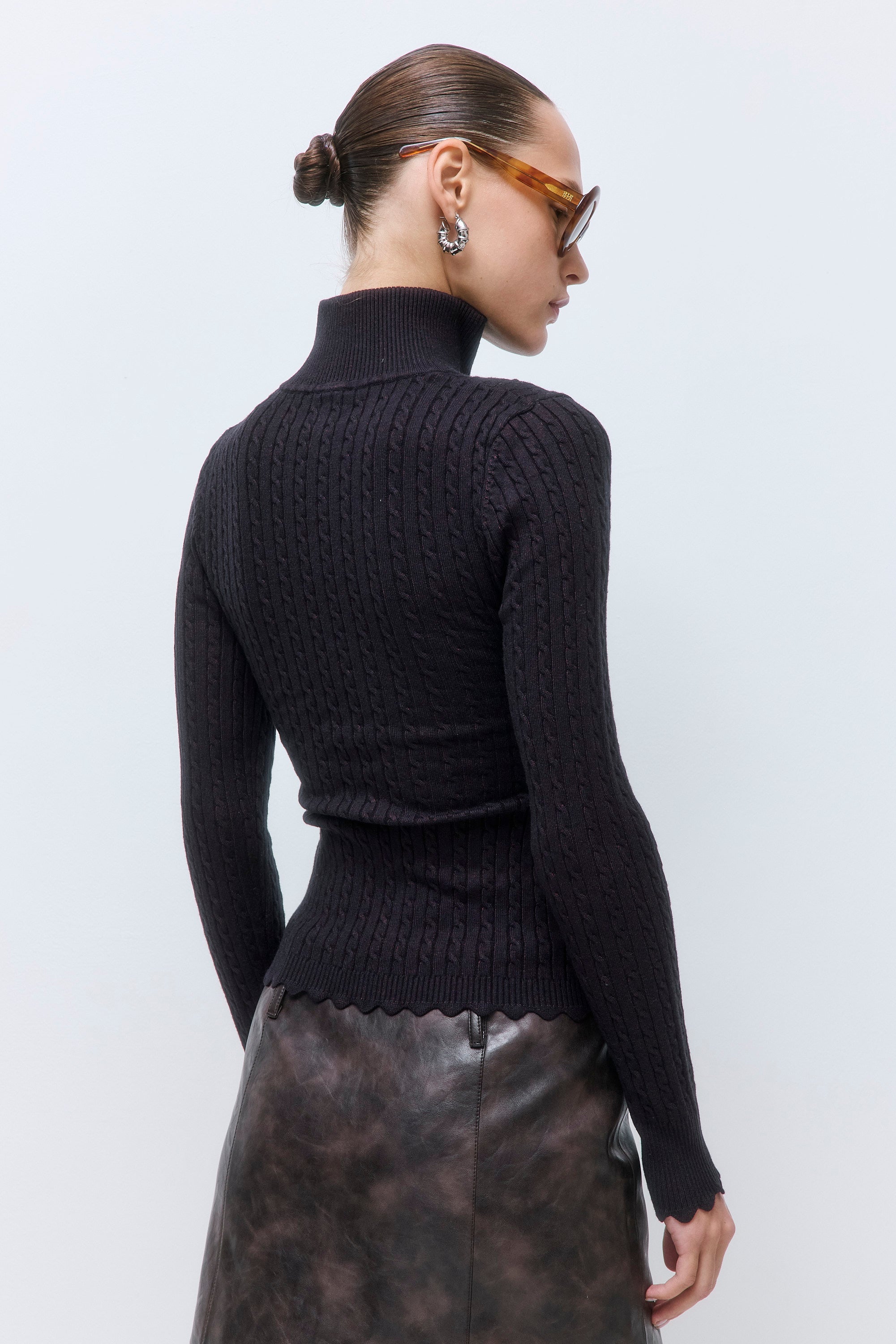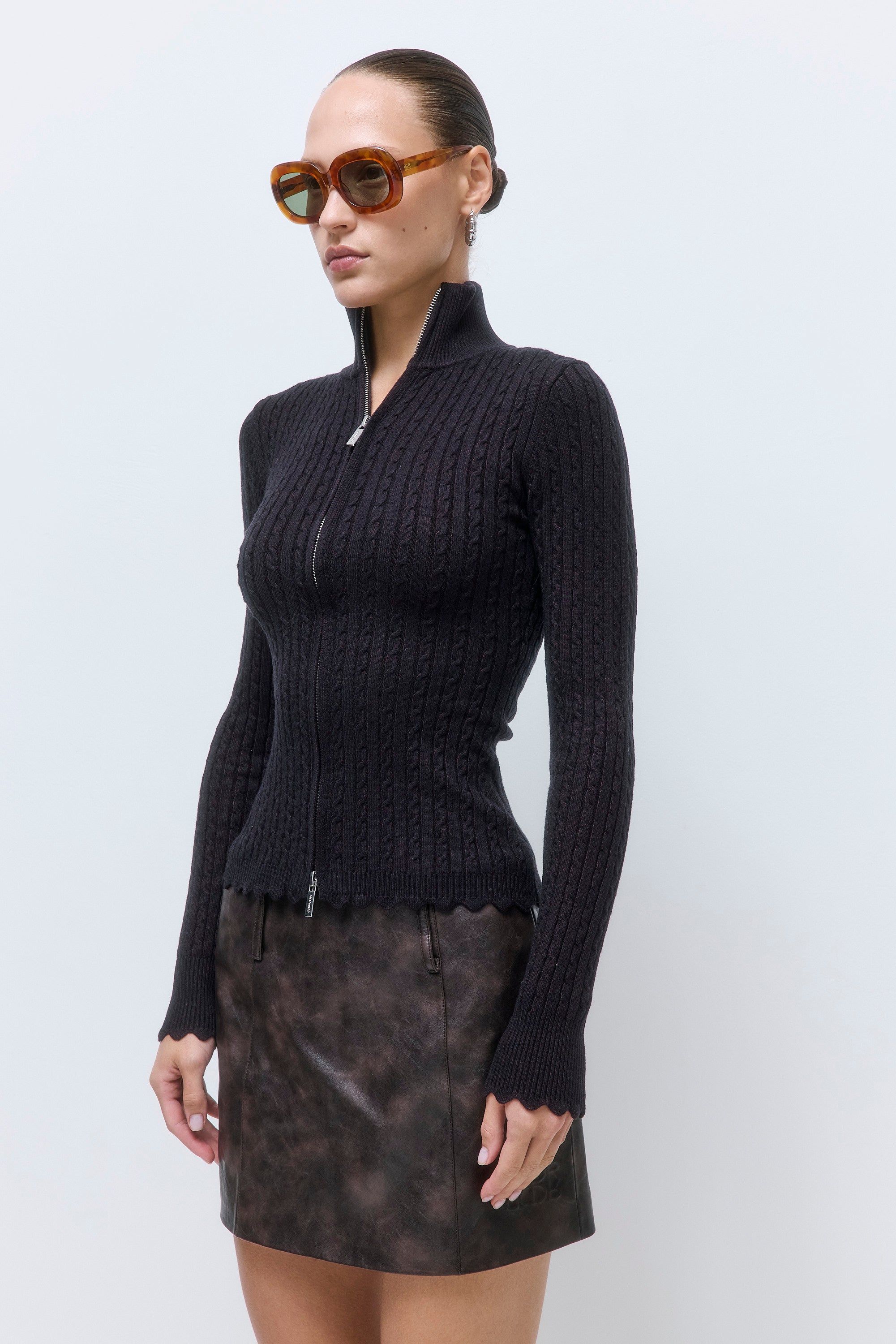 Our new cool-girl Fitted Cable Knit Cardigan is your buttery-soft essential for effortless style. Fitted silhouette. Featuring a double logo zipper that opens from both ends. Can be worn open or closed, as you please. Fully fashioned. Finished with a ribbed collar, cuffs, and hem. Wavy detailing along the sleeves and hem. Pair it with our iconic No. 15 Denim and our luxurious Jackie Sunglasses for a versatile look.