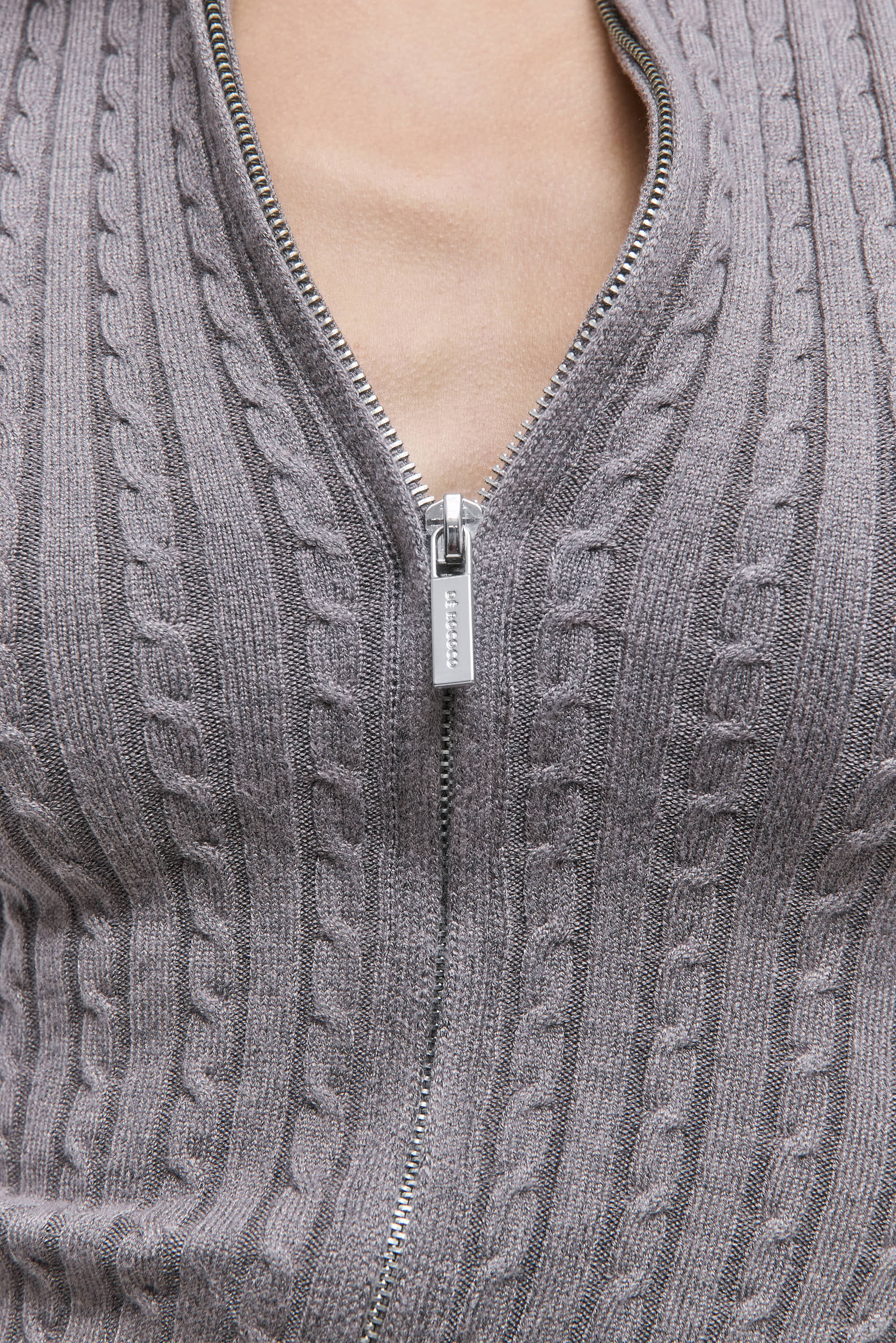 Our new cool-girl Fitted Cable Knit Cardigan is your buttery-soft essential for effortless style. Fitted silhouette. Featuring a double logo zipper that opens from both ends. Can be worn open or closed, as you please. Fully fashioned. Finished with a ribbed collar, cuffs, and hem. Wavy detailing along the sleeves and hem. Pair it with our iconic No. 15 Denim and our luxurious Jackie Sunglasses for a versatile look.