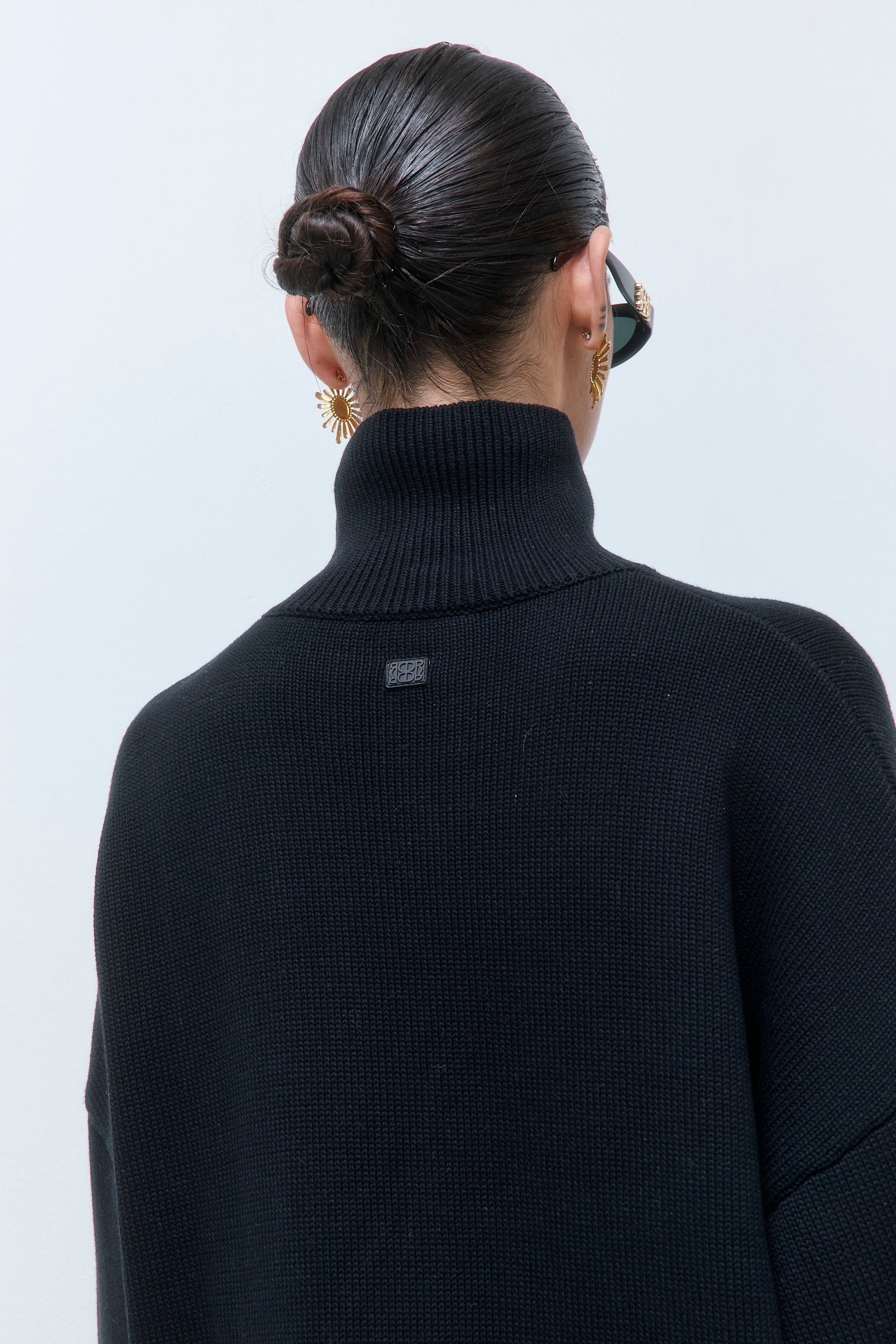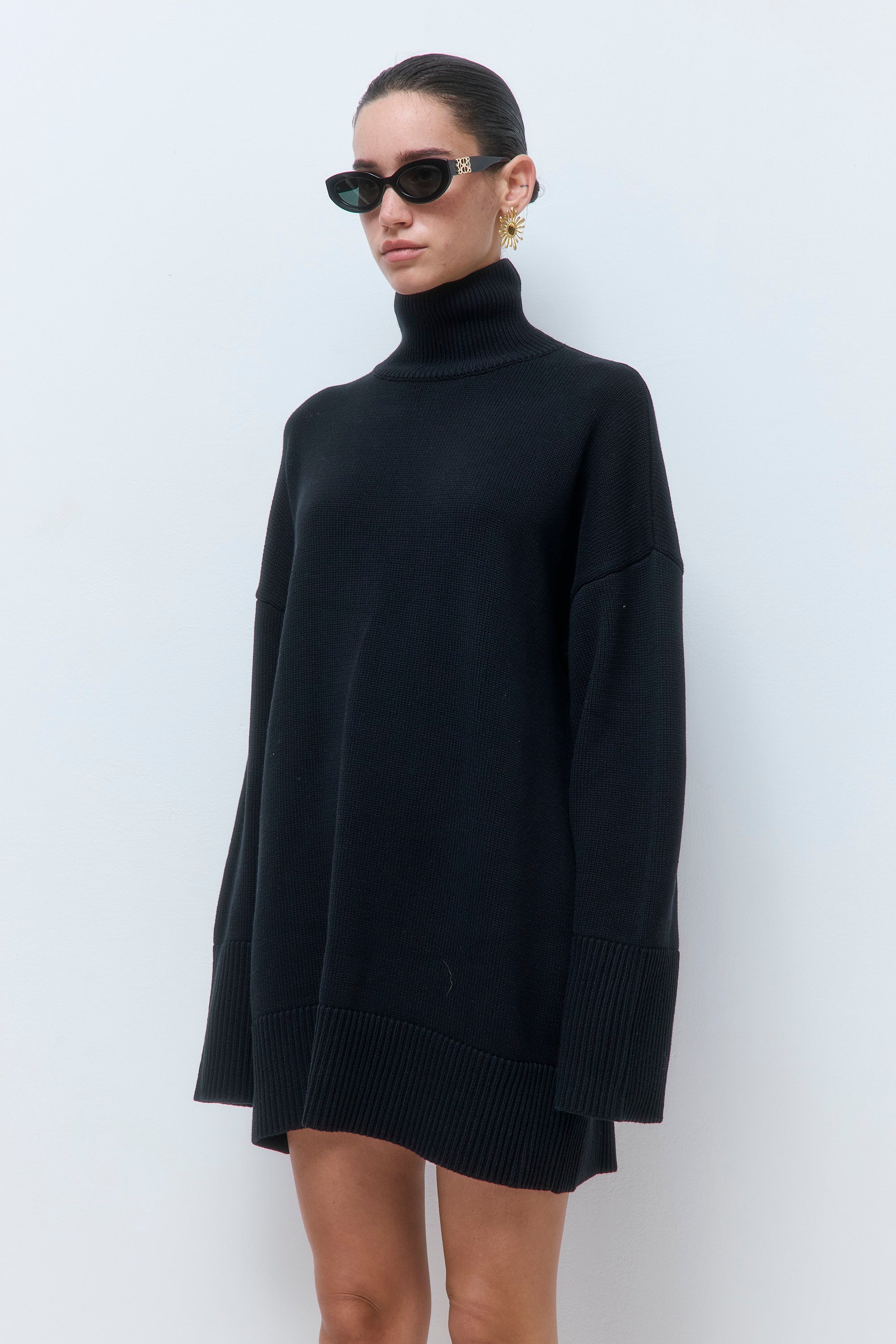 The perfect cozy winter essential. Turtleneck Mini Dress. Oversized fit. Slits on the side. Dropped shoulders. Wide rib hem. Tonal silicon logo on the back. Fully fashioned. Style it with our with our chic Oval Sunglasses and iconic Rodika Tote Bag for the ultimate cool-girl look.