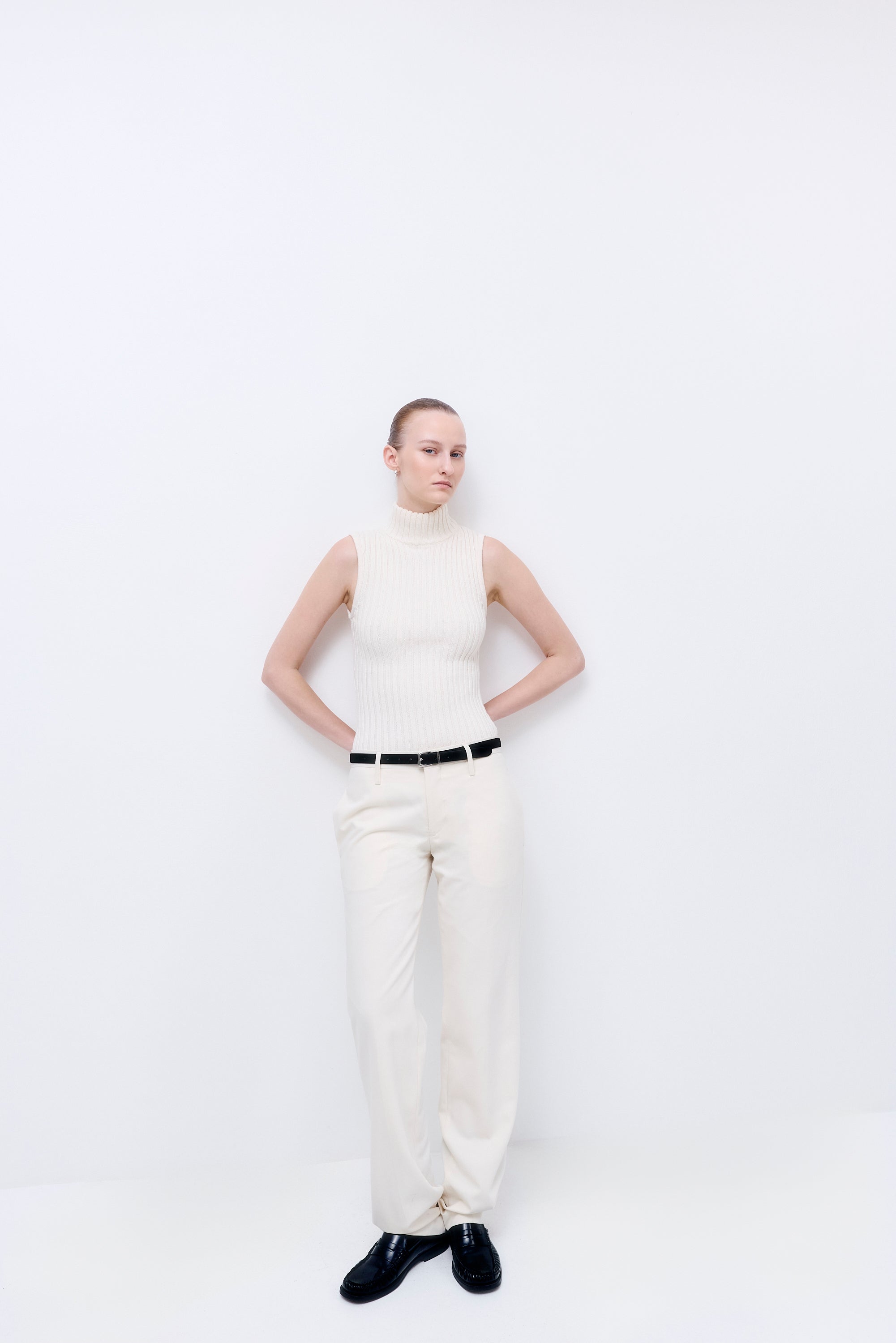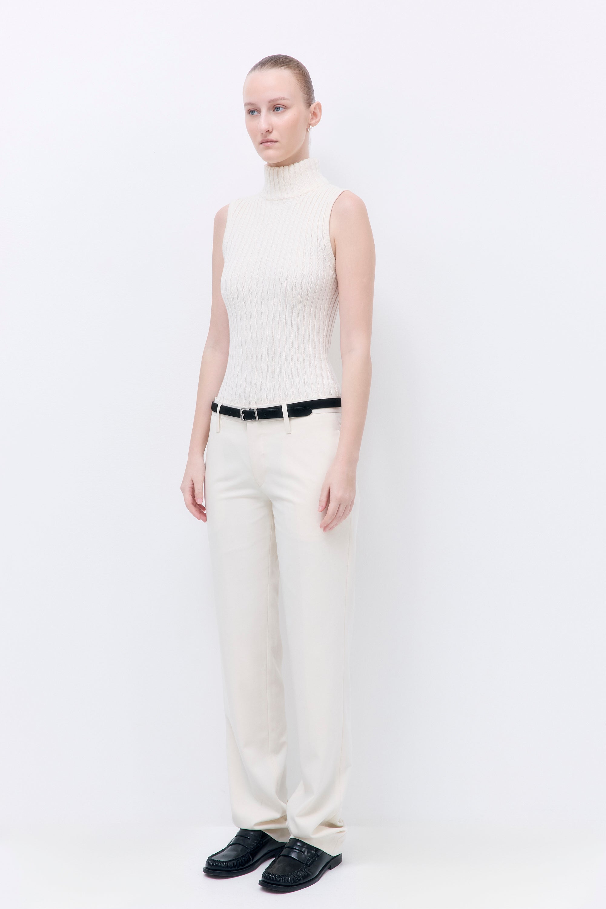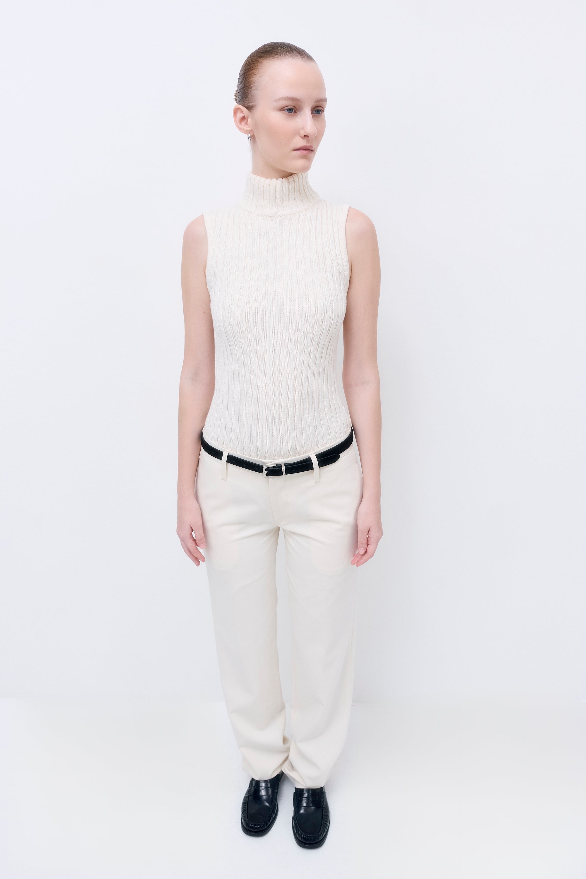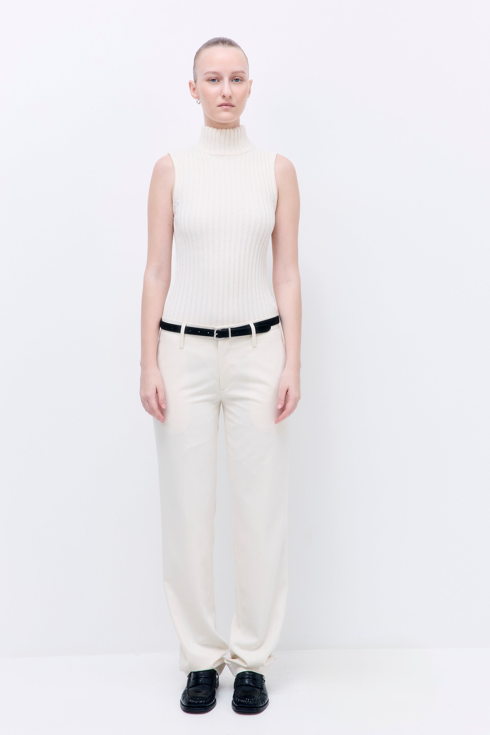 The sleeveless staple your wardrobe has been waiting for, a perfect layering piece. Fitted silhouette, fully fashioned for precise fit. Finished with a tonal silicone logo centered on the back. Style it with our cozy Tailored Wool Plaid Jacket and iconic No. 19 Denim for the perfect winter's day look.