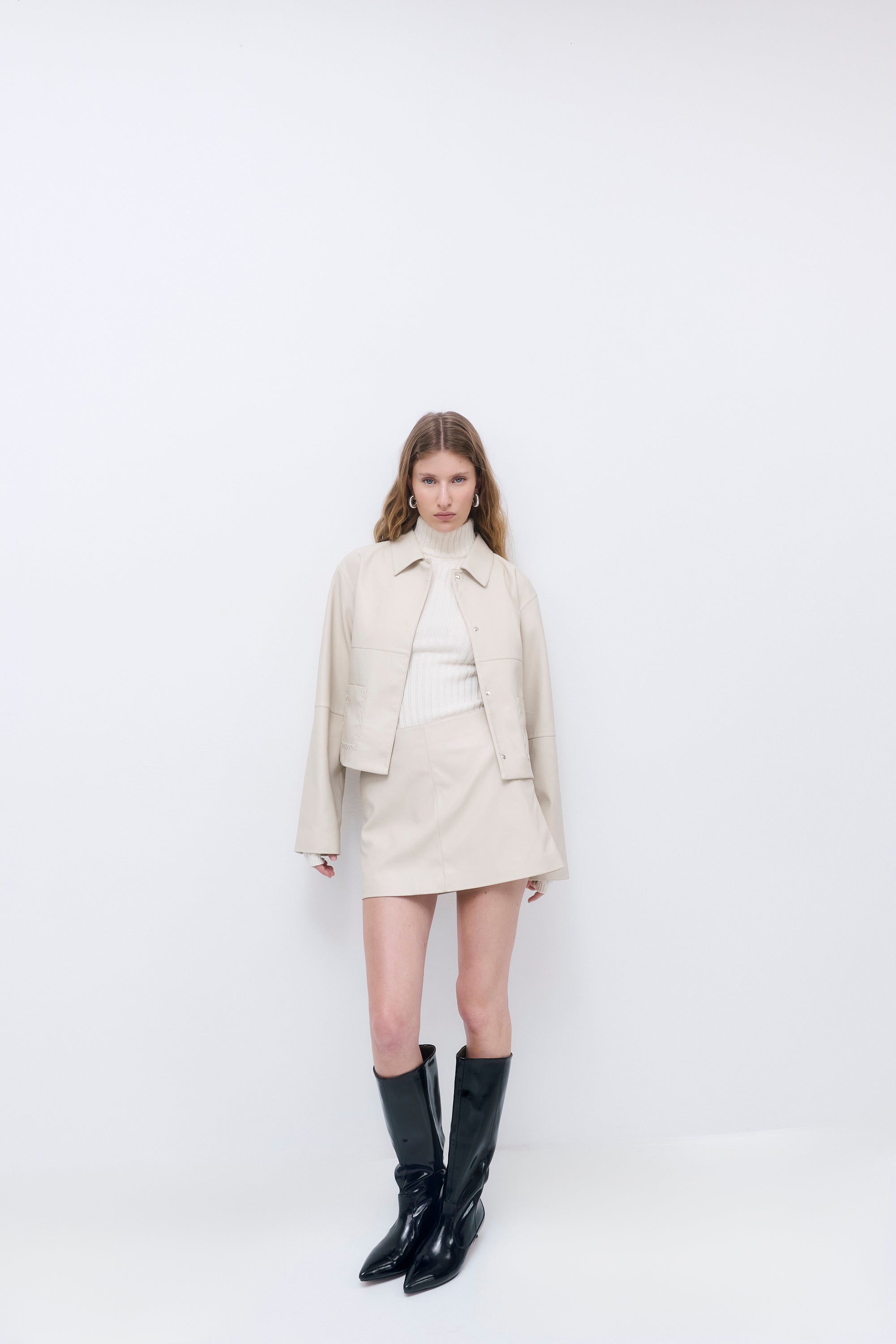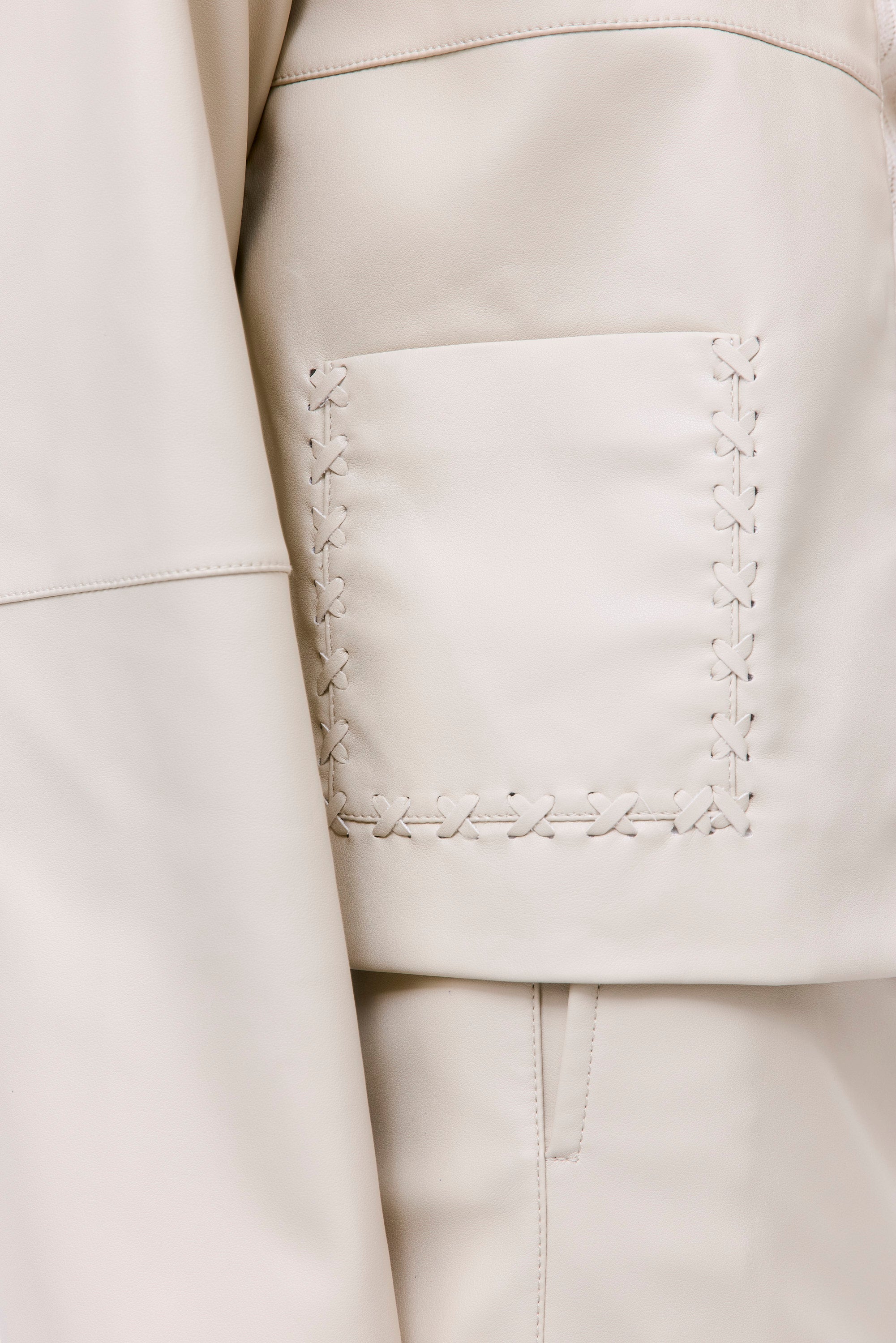 Your new go-to jacket to add to your rotation this winter. Vegan leather. True to size fit. Padded. Featuring hidden silver snap closure for a clean, streamlined front. Accented with embroidered x's along the jacket. Detailed with patch pockets with an embossed tonal logo on one side. Subtle vent and tailored cuts on the back. Style it with our essential Wide Rib Mini Dress and iconic Yvon Shoulder Bag for a clean, polished look.