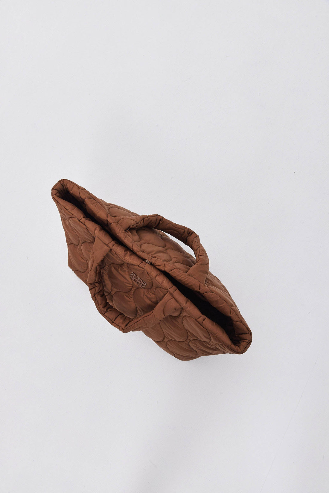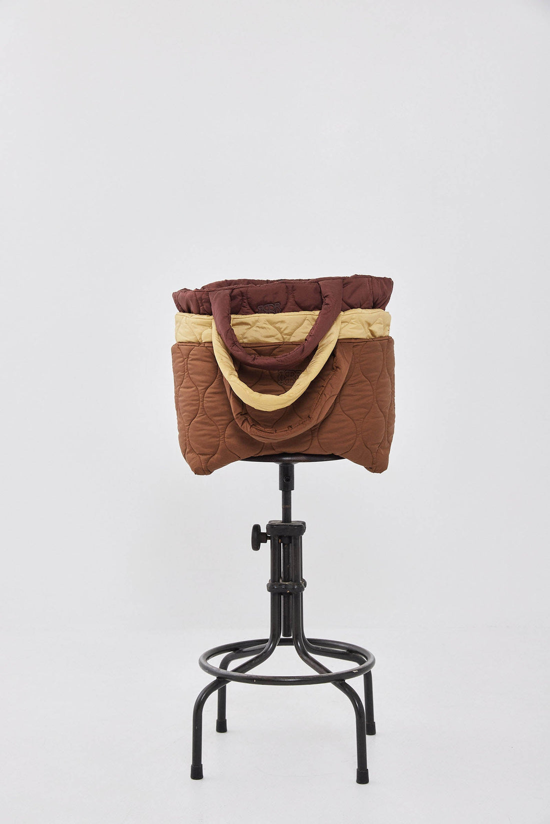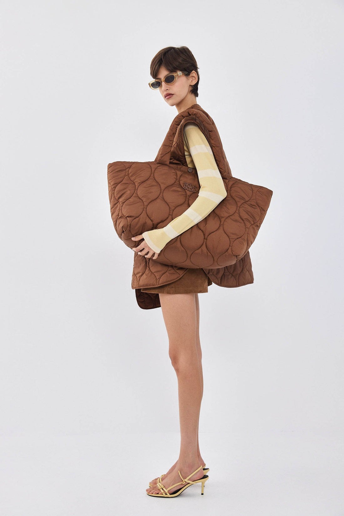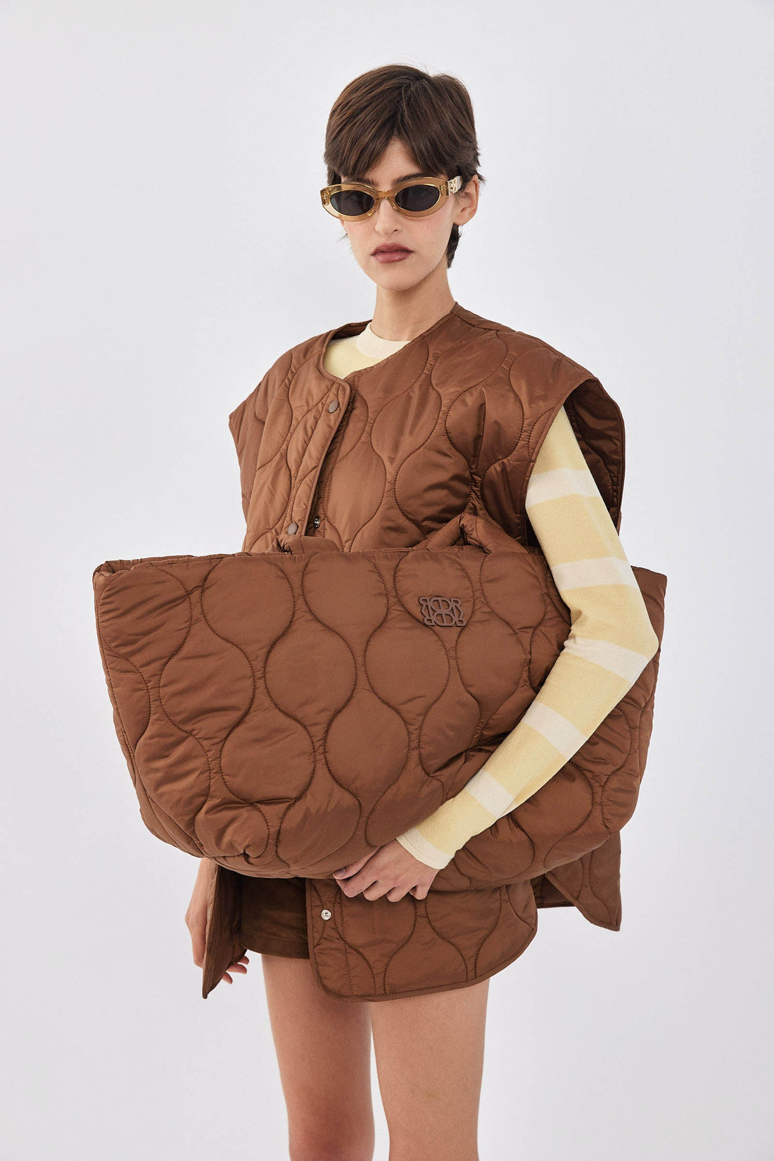 Quilted large padded bag. Features a magnetic snap button closure. Onion pattern quilt. Unlined. Features two inner pockets, one with a zipper closure and one with a snap silver button closure. Faux leather logo patch on the inside. Tonal metal logo press detailing on the front. Style this perfect carry all with our De Fitnéss club active set and our beautiful quilt jacket for an everyday chic look.