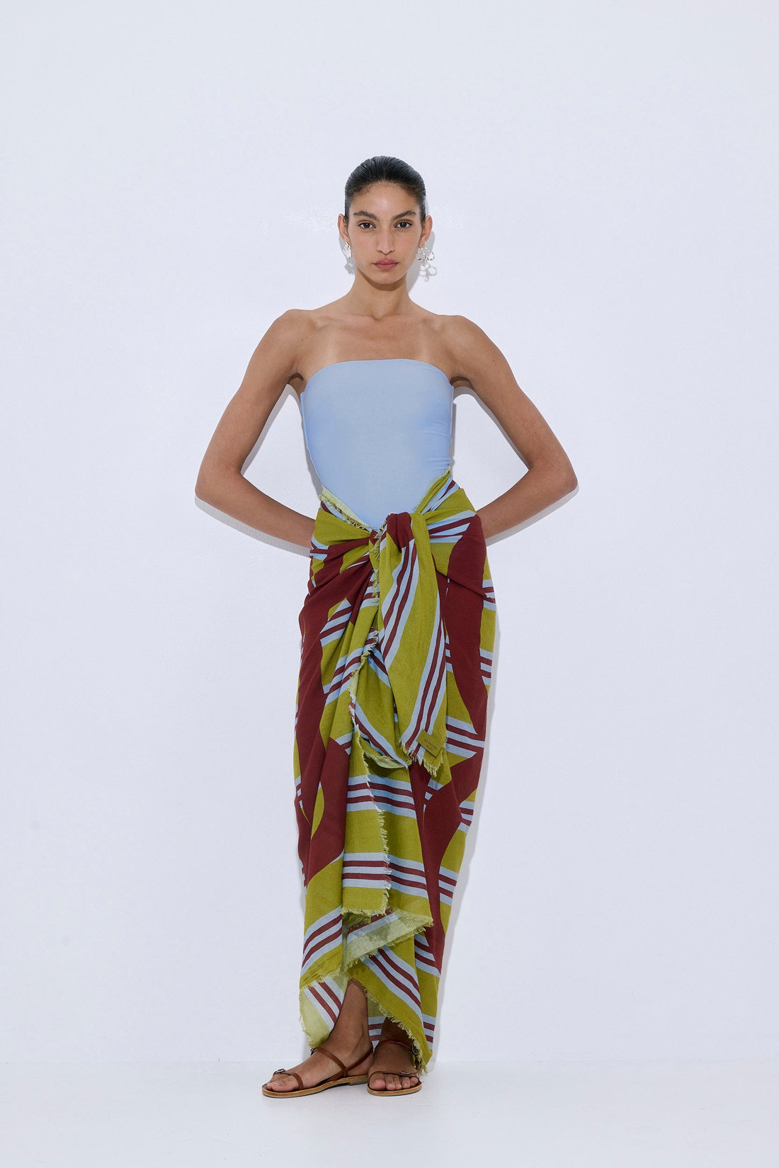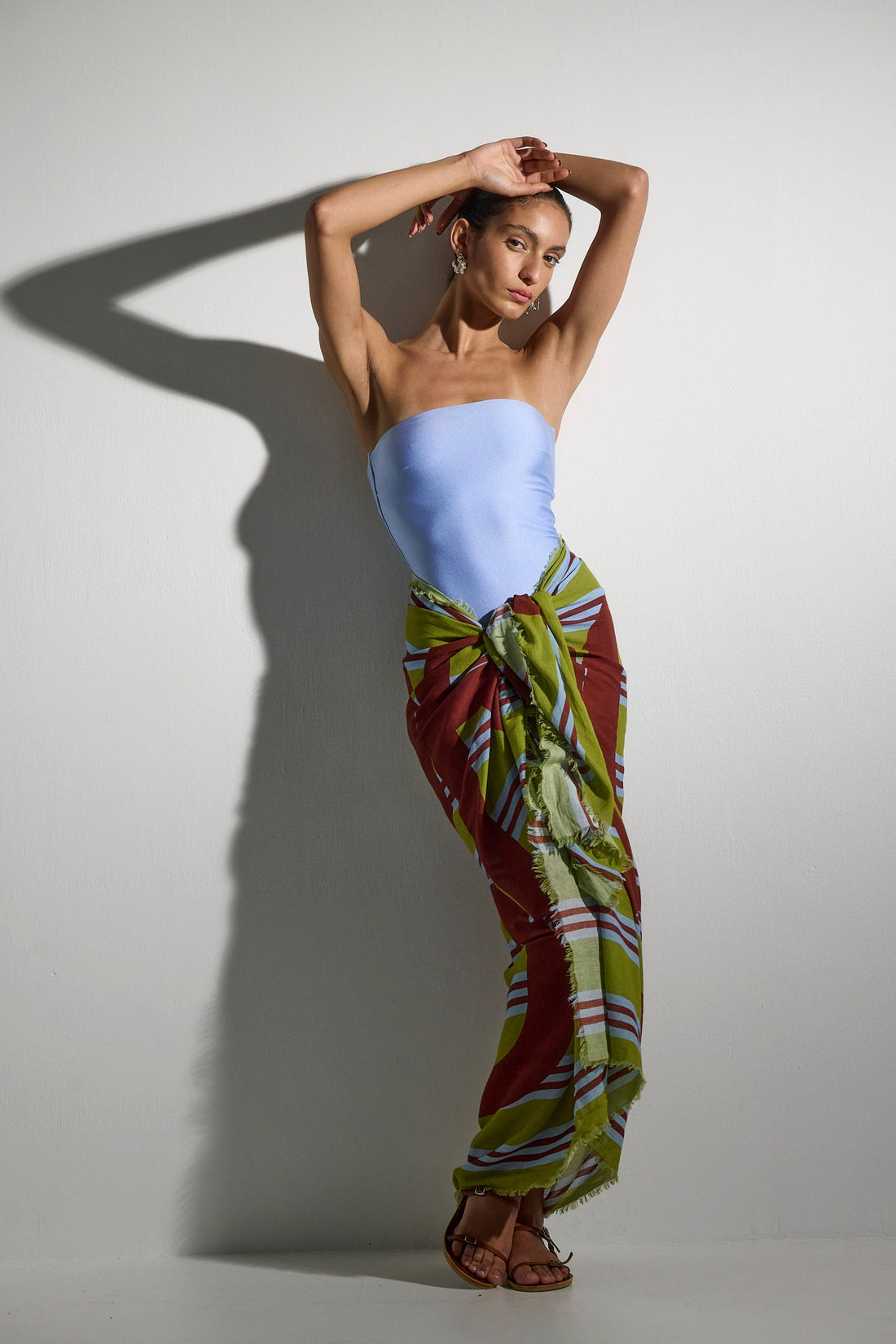 An absolute summer essential. Limited edition sarong with a custom signature print, going perfectly with all of this summer's swimsuits. Kiwi green monogram print. Fringed finish. The perfect coverup to complete your beach and poolside look. The sarong is highly versatile, can be tied in multiple ways to achieve your preferred look. Wrap it around your hips, or style it as a halter neck dress for your favorite summer look.