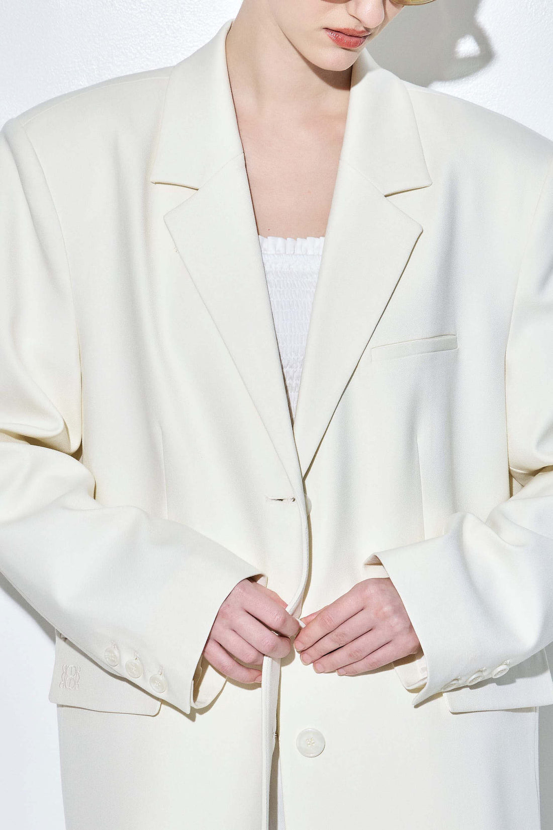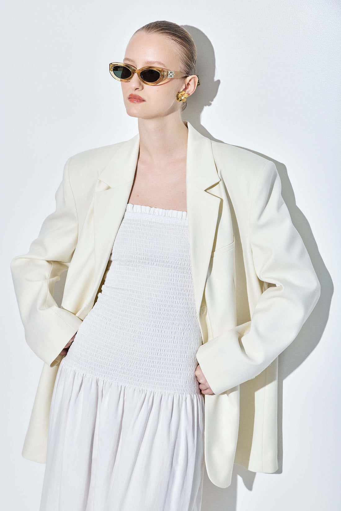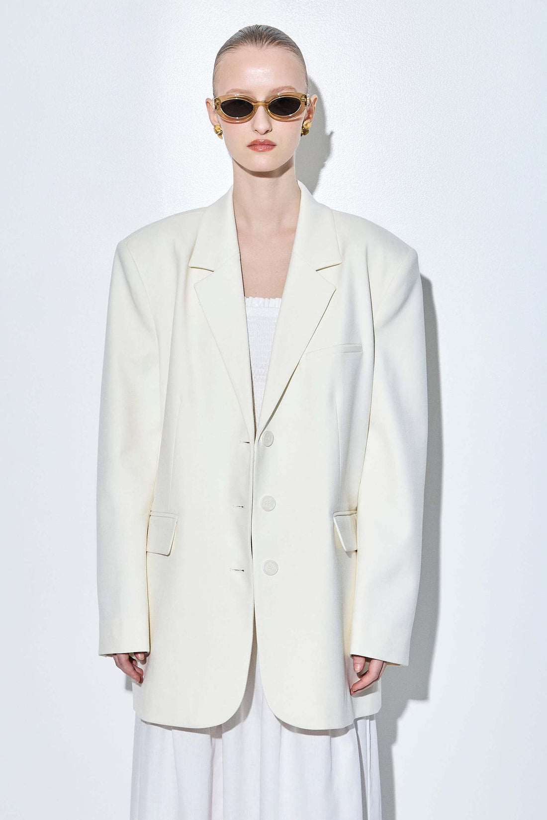 Our new tailored daddy blazer is a timeless piece this season in a new luxurious tailored fabric. Oversized fit. Features a lapel collar. Logo engraved button closure. Three front faux pockets. Back slit. Lined. Tonal logo embroidery on the side. Padded shoulders. Style it with our daddy bootcut pants, our lightweight turtleneck and our signature mini logo belt for a day to night classy look.